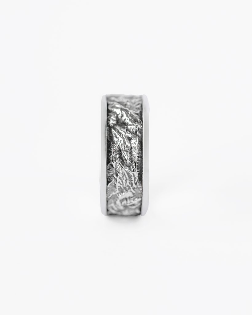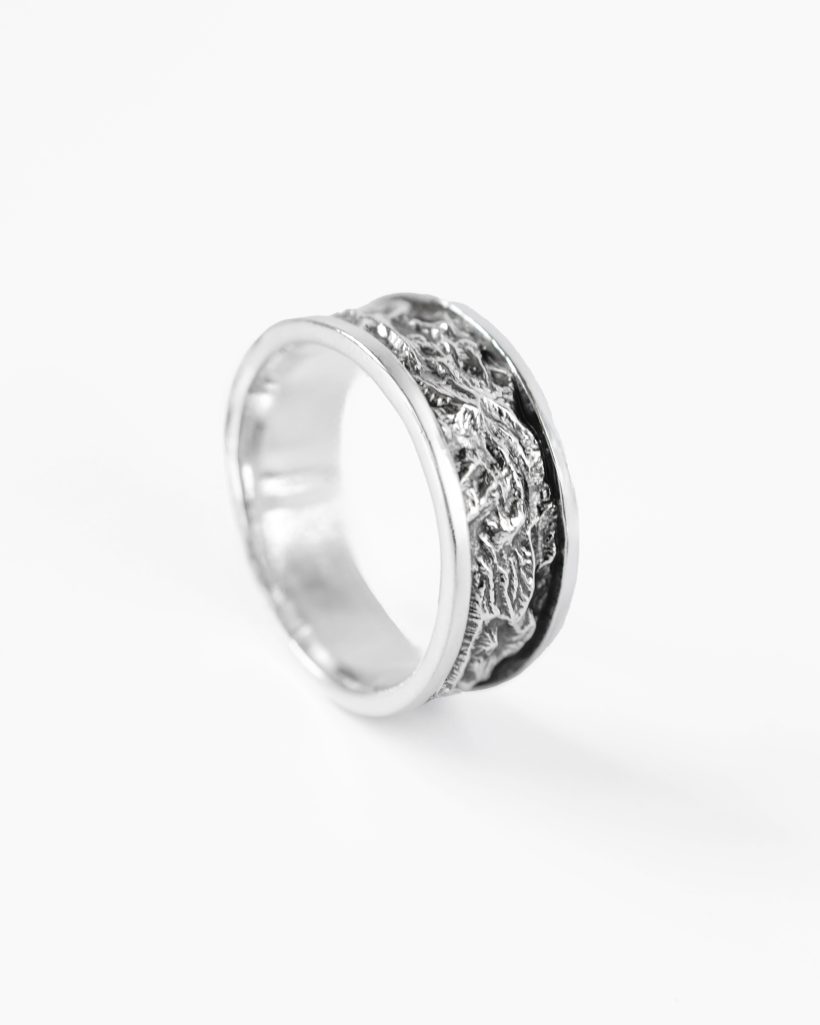 Srebrna obrączka Górski Masyw jest dość szeroka, ale dzięki temu udało nam się zawrzeć na niej zdobienie, wiernie odwzorowujące rzeźbę górskiego terenu. Zadbaliśmy, aby przekuć w ten srebrny wyrób pełnię różnorodności, jaką charakteryzuje się górski krajobraz. W efekcie we wzorze zdobiącym pierścionek możesz rozpoznać krzywizny grani, górskie żleby, czy fakturę skał. Co więcej, pierścionek został poddany oksydowaniu, dlatego rzeźbienie jest wyraźnie widoczne, a całość podkreślają błyszczące się krawędzie pierścionka. Biżuteria jest w całości wykonana ze srebra próby 925.