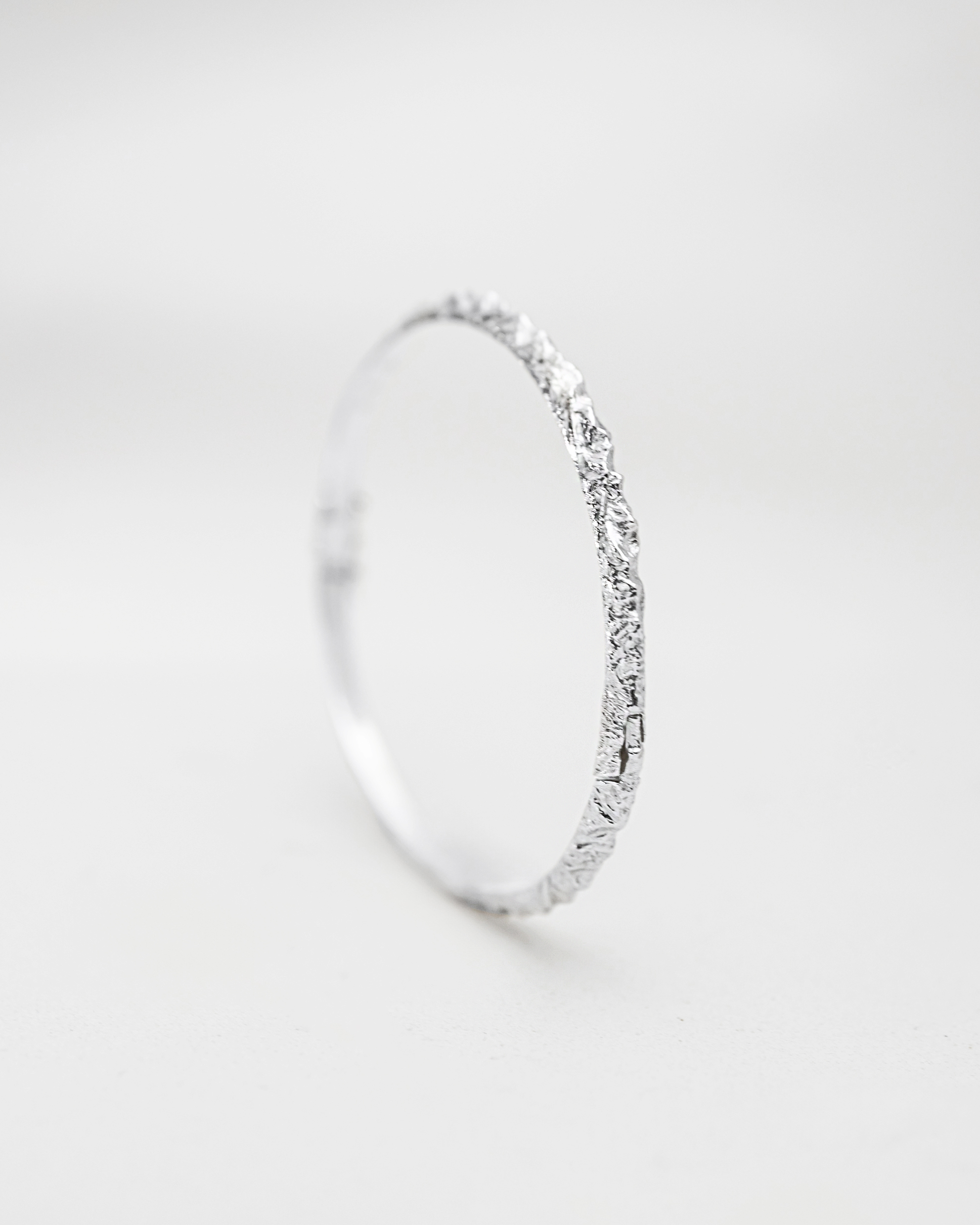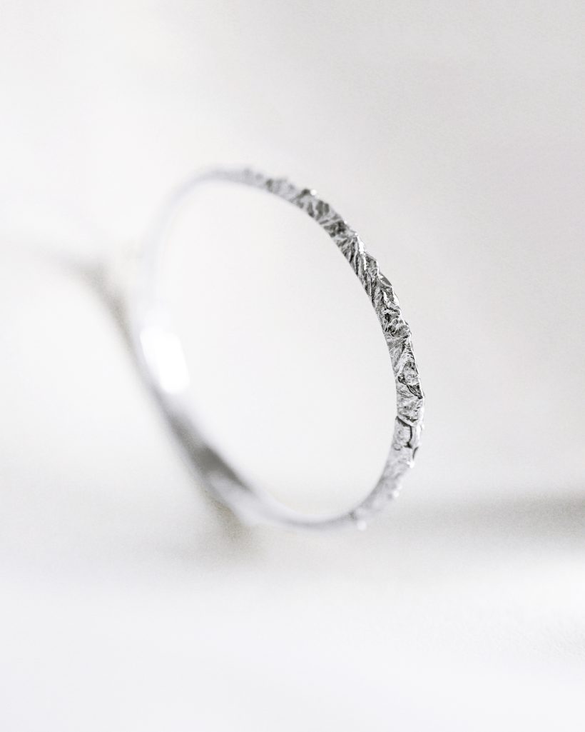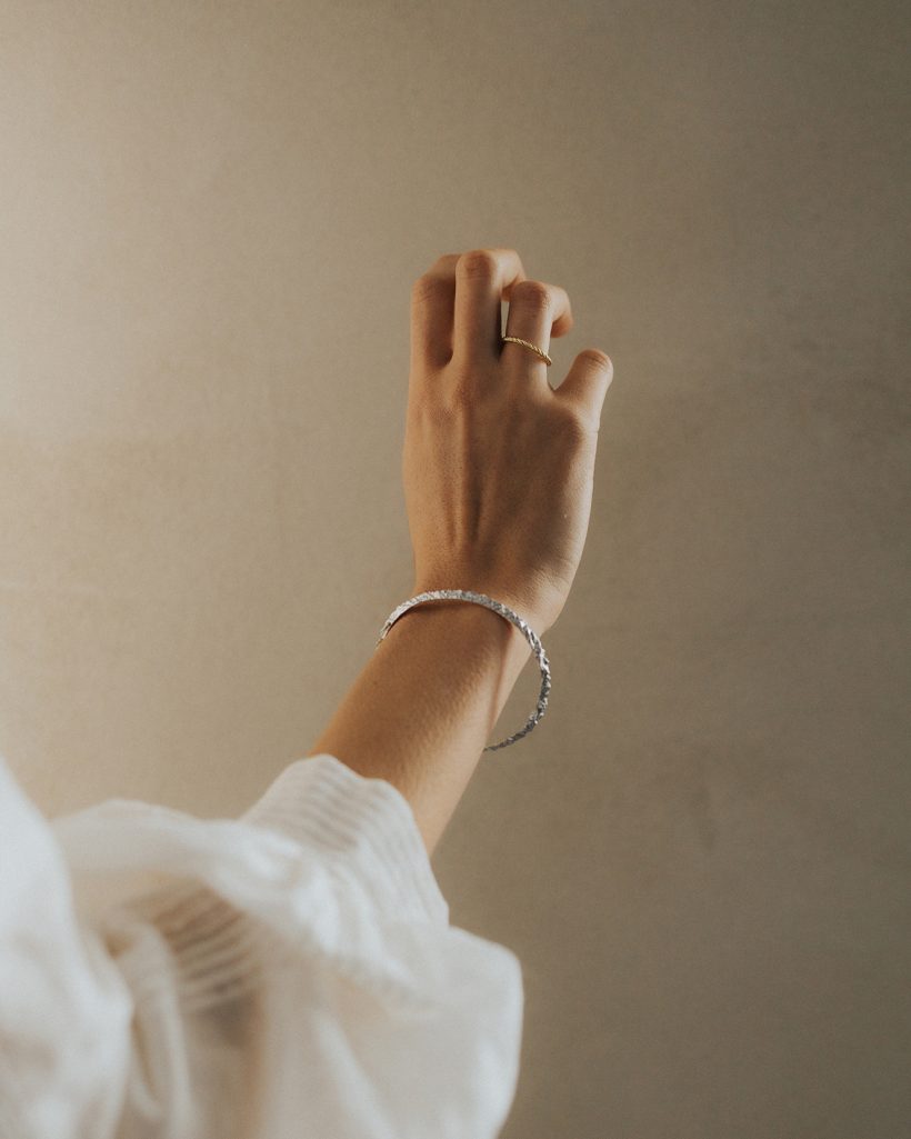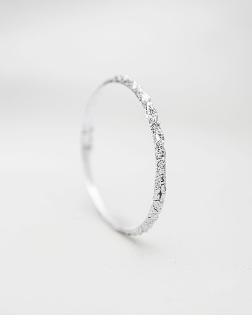 A rigid bangle bracelet adorned with the silhouette of mountain peaks seen from a bird's-eye view. The hand-carved details accurately capture the mountainous landscape of the highest summits. The exceptional intricacy of the carved texture beautifully reflects light in its crevices, shimmering with every movement. The bracelet is hinged and features a convenient clasp for easy wear.