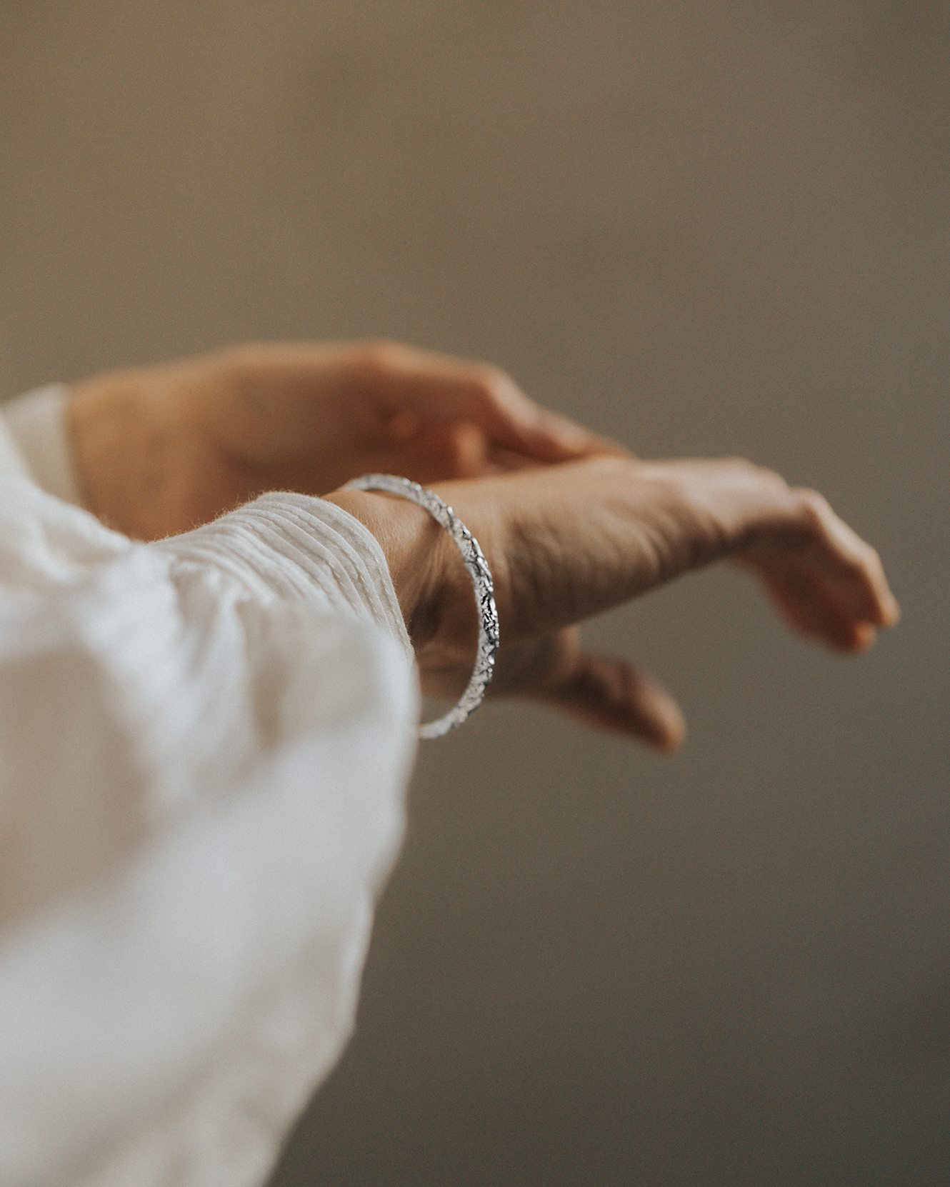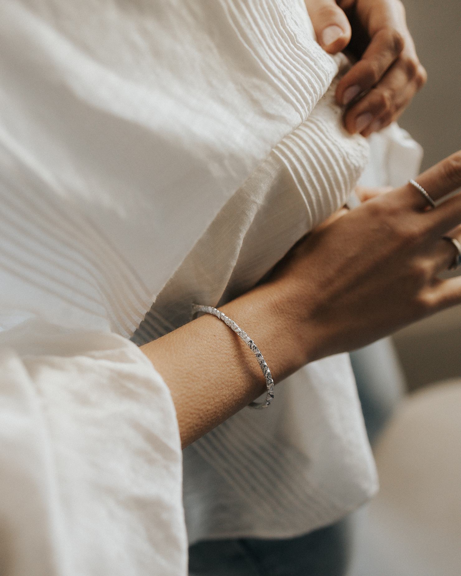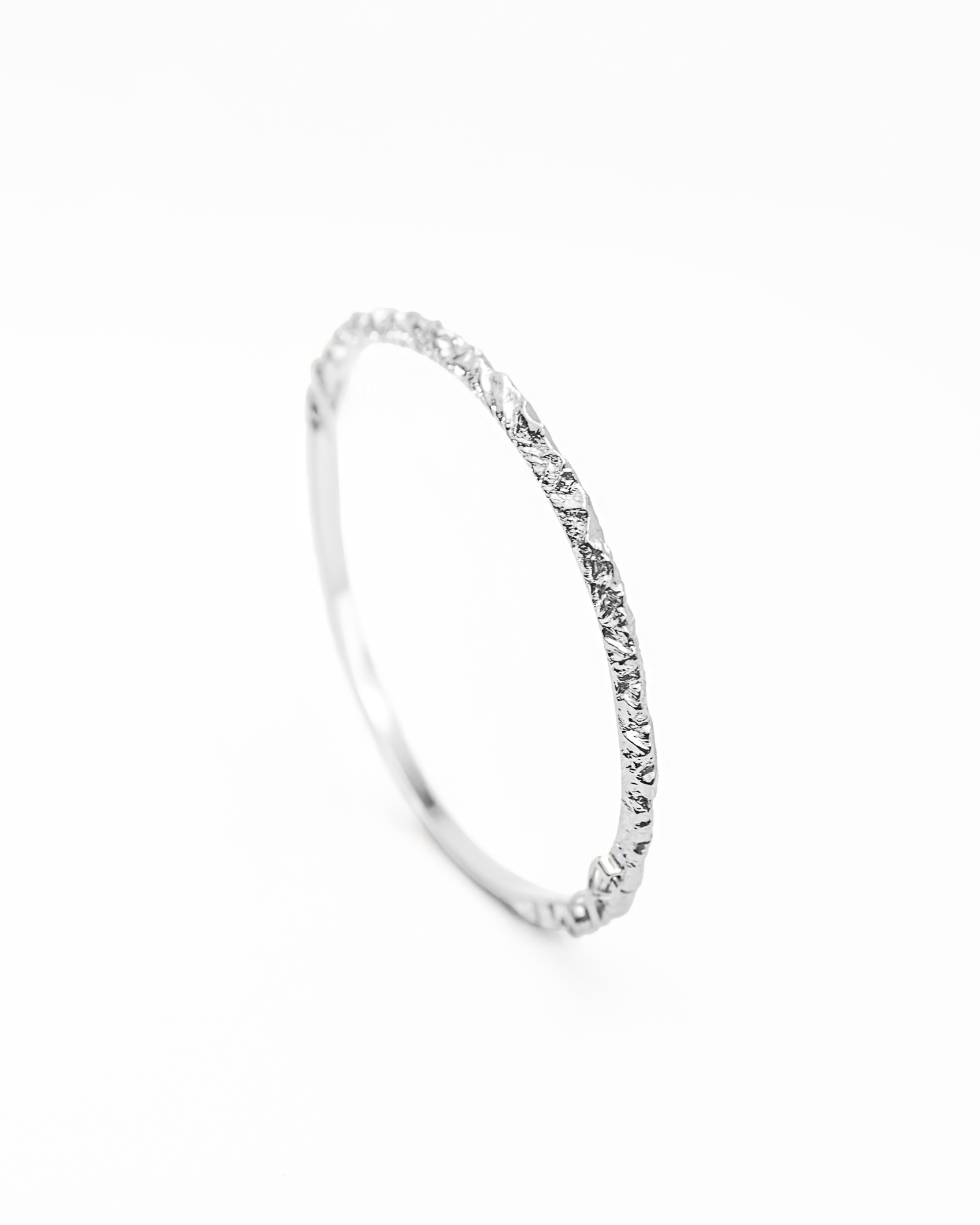 A rigid bangle bracelet adorned with the silhouette of mountain peaks seen from a bird's-eye view. The hand-carved details accurately capture the mountainous landscape of the highest summits. The exceptional intricacy of the carved texture beautifully reflects light in its crevices, shimmering with every movement. The bracelet is hinged and features a convenient clasp for easy wear.