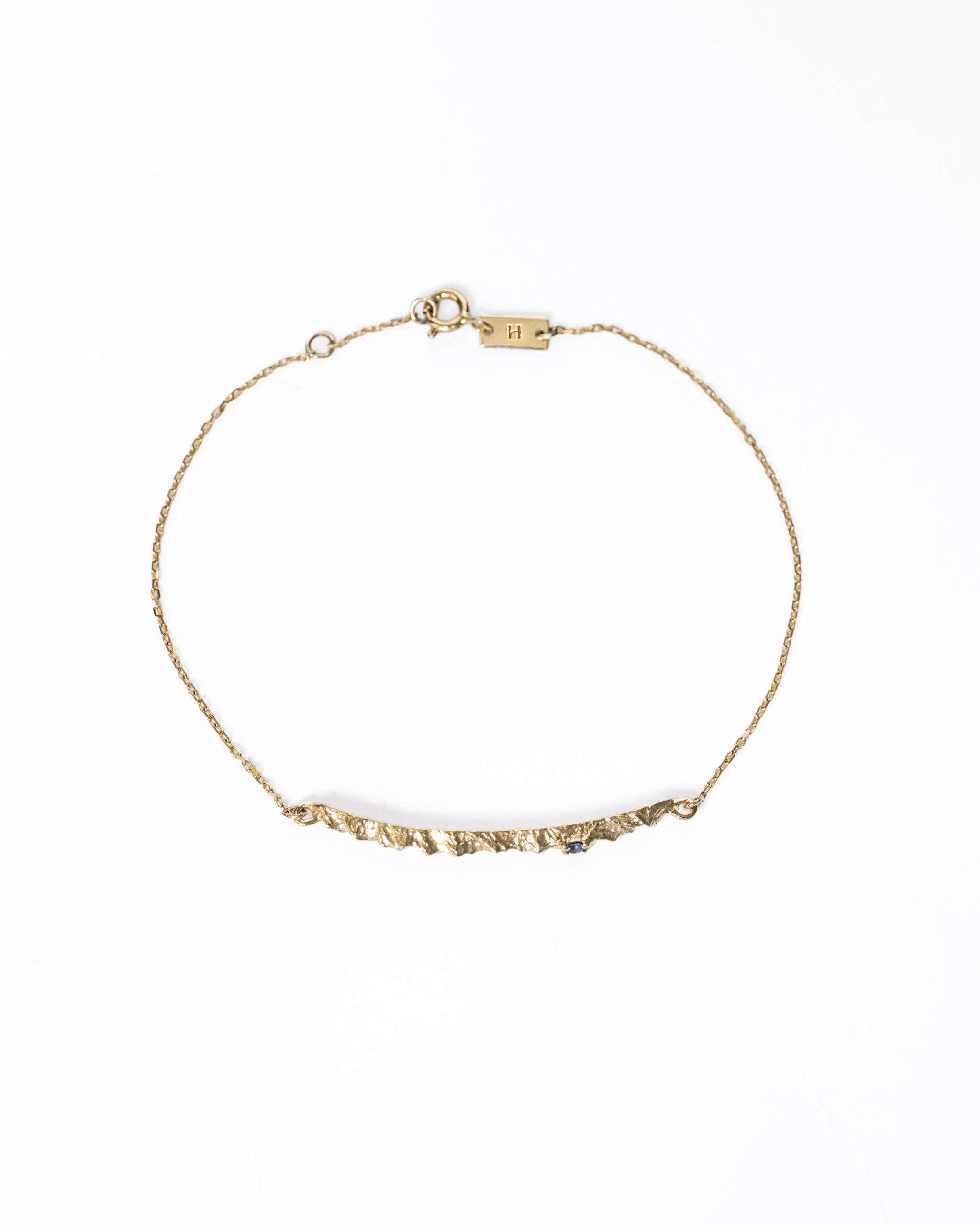 A delicate bracelet adorned with a motif inspired by the silhouette of mountain peaks seen from a bird's-eye view. The hand-carved element meticulously reflects the mountainous landscape of the highest summits. The design is crowned by a natural sapphire set on the side of the motif, just below the ridge line.