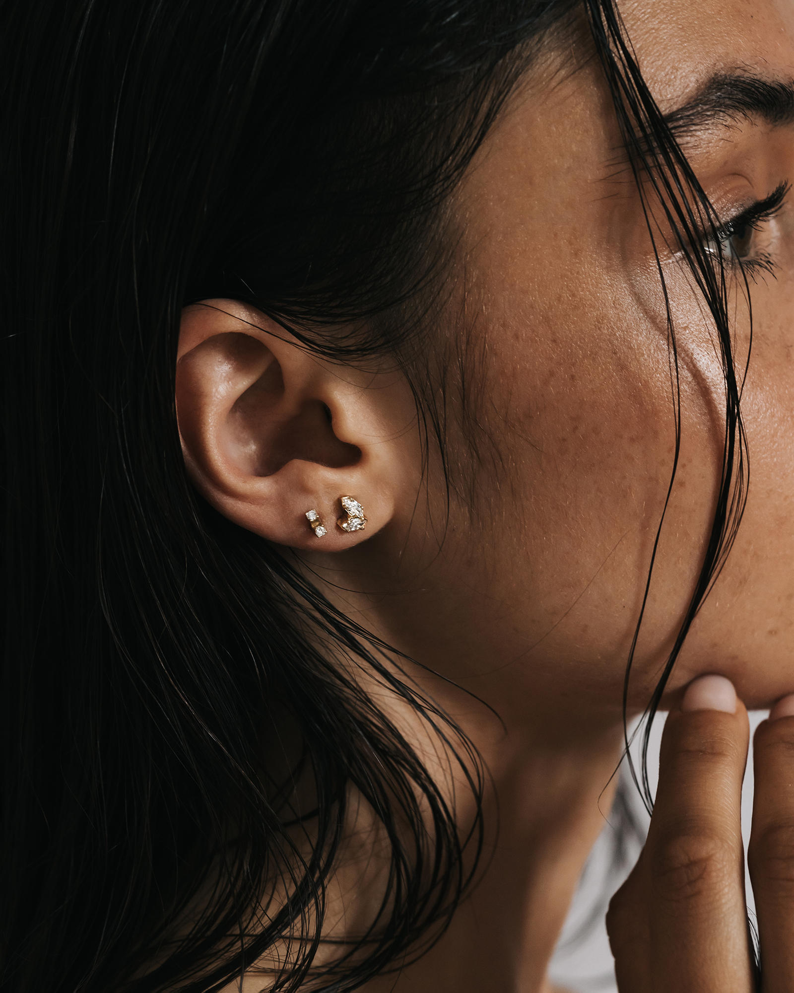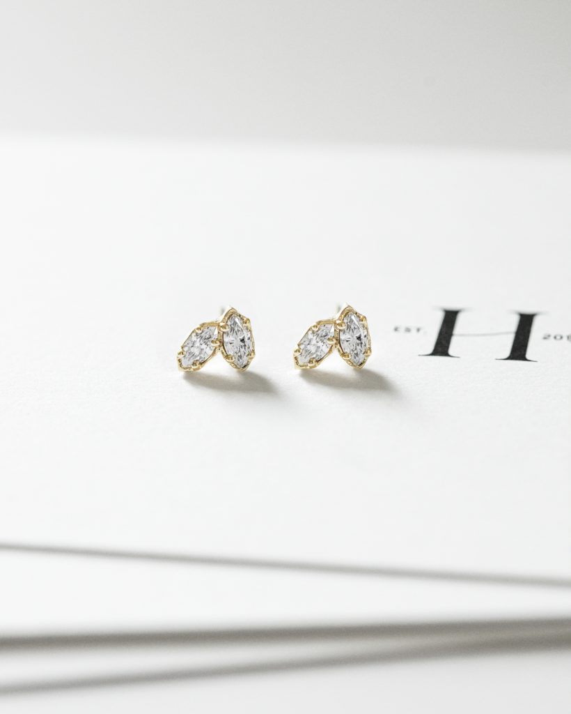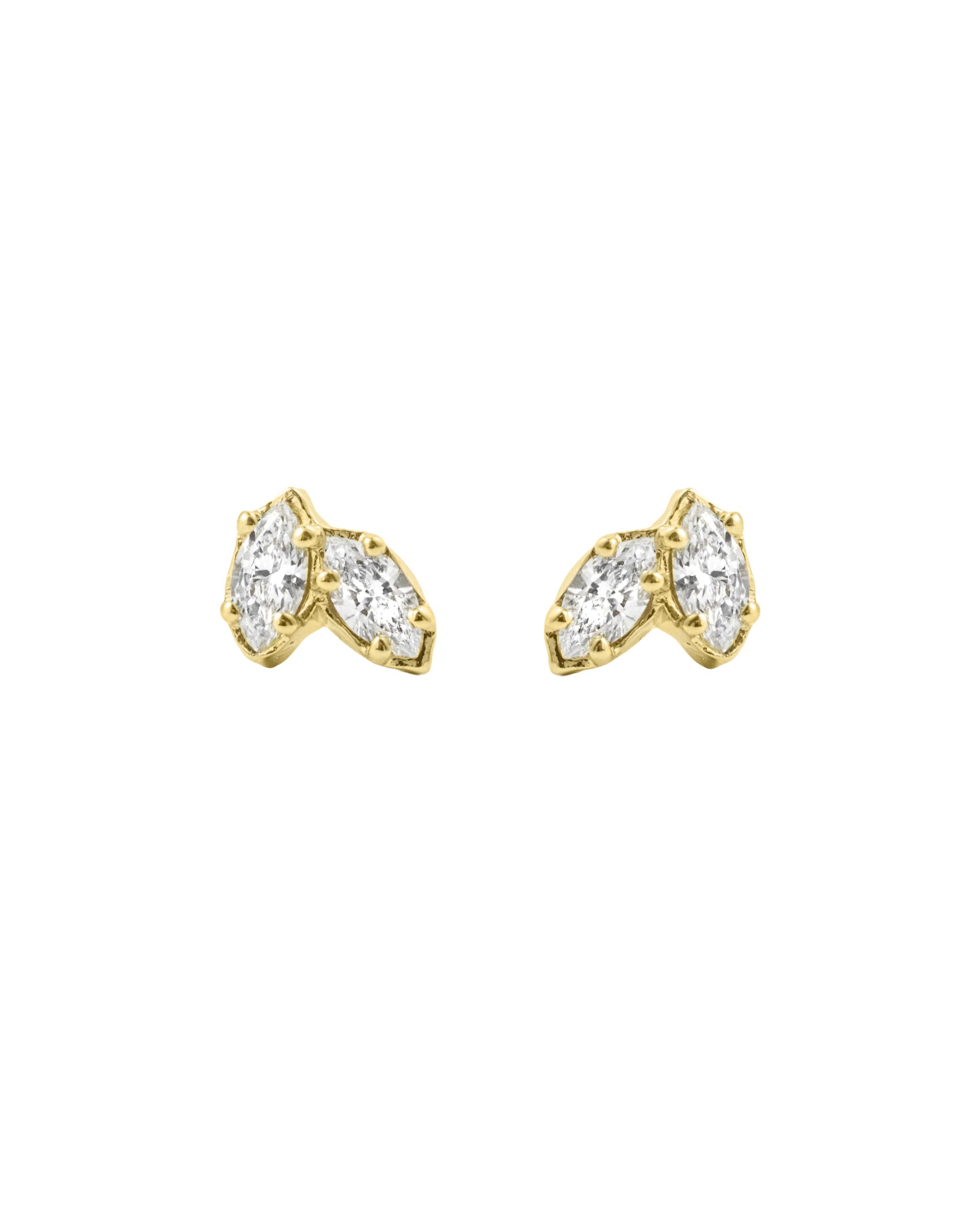 Striking earrings adorned with marquise-cut diamonds. The stone settings captivate with their fluid, organic form inspired by the flow of a river. Hand-carved, subtle bends of the gold and soft curves reflect the harmony of nature, beautifully catching the light.