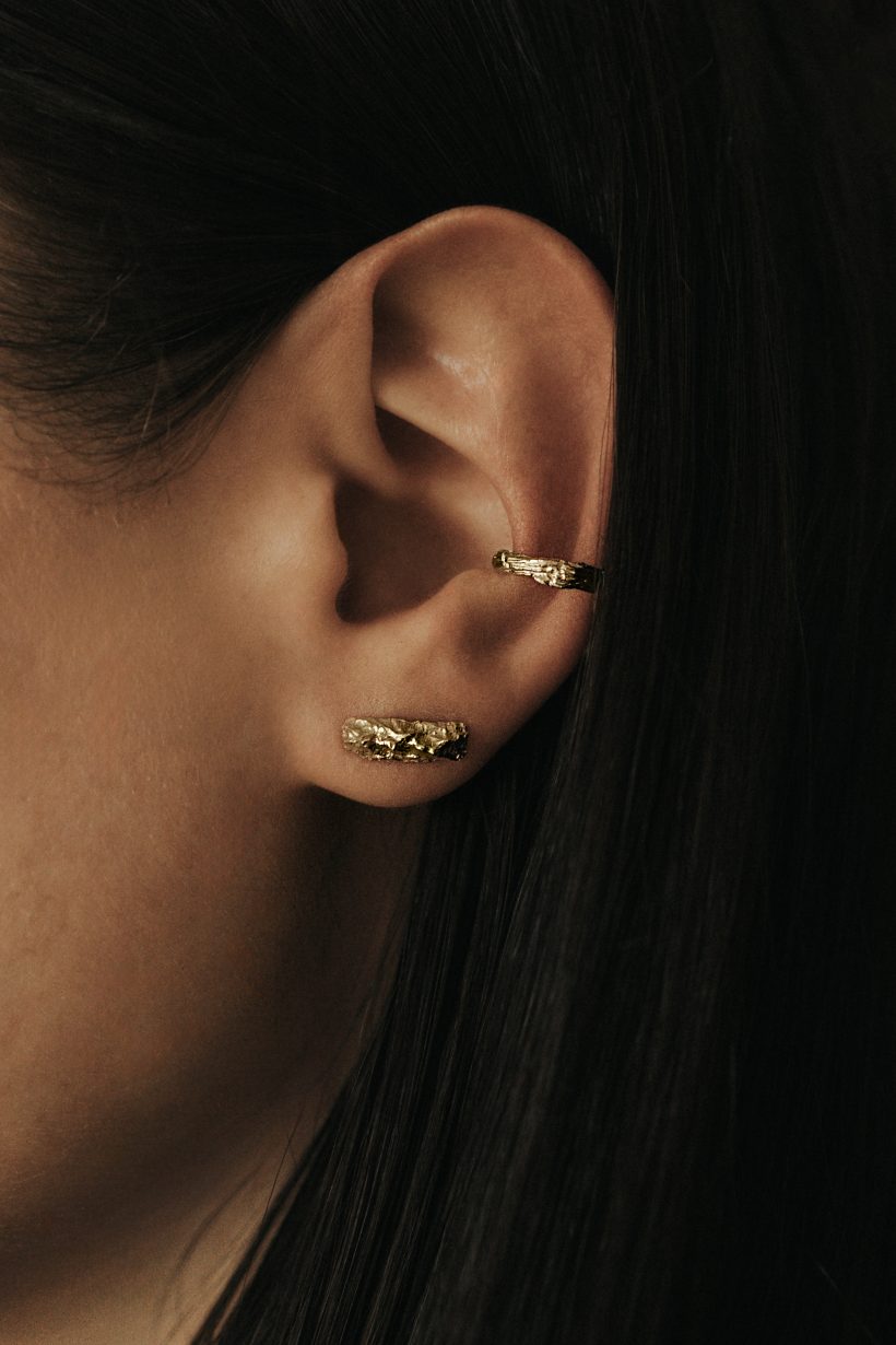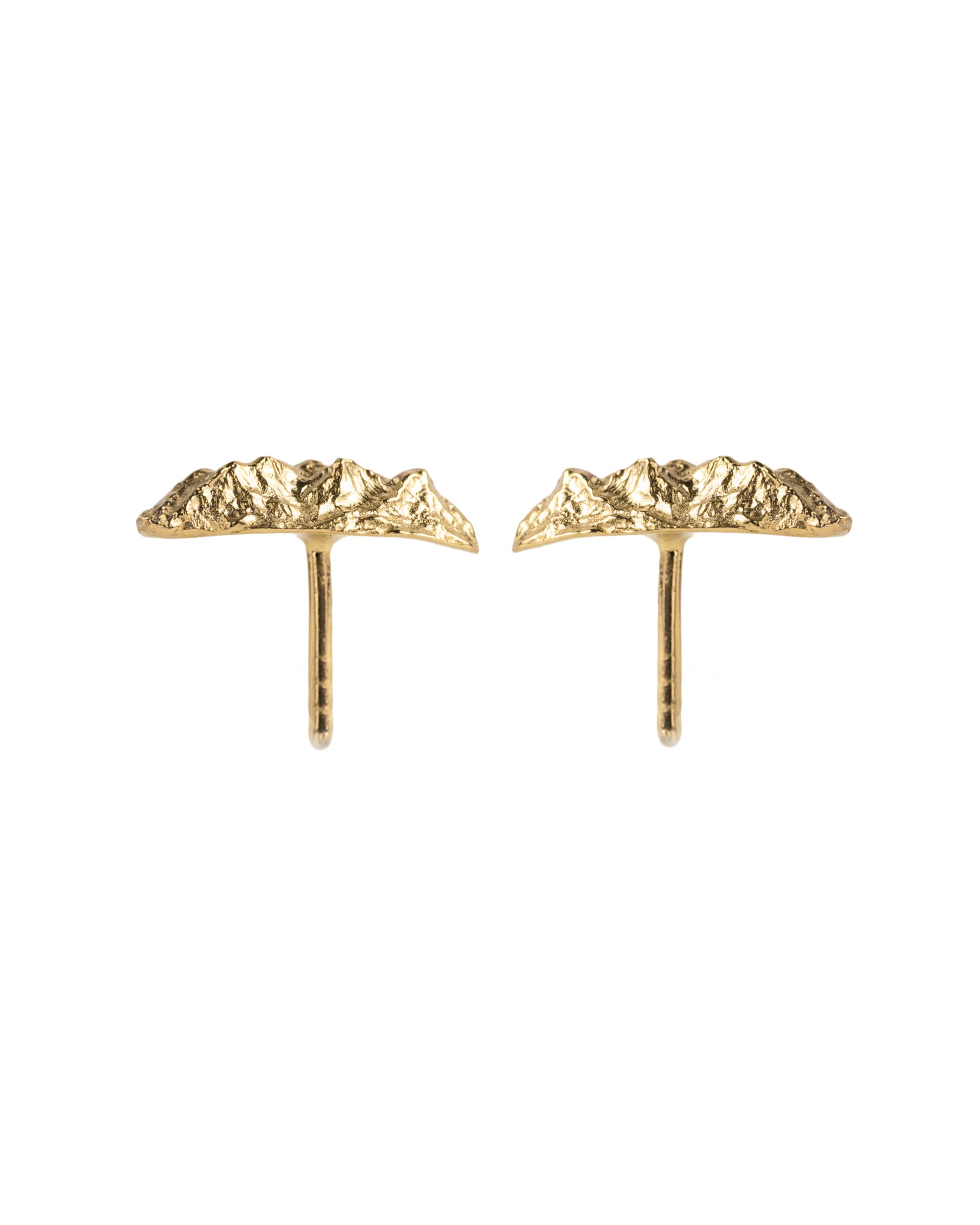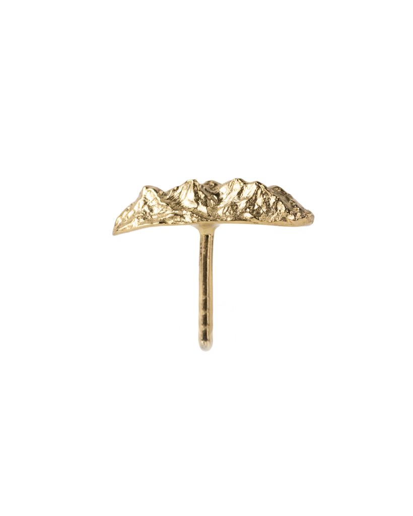 Delicate yet remarkably striking stud earrings adorned with a motif of mountain peaks as seen from a bird’s-eye perspective. Each subtle ridge beautifully reflects the light, giving the surface depth. Their intricate structure has been accentuated through polishing, resulting in the effect of shimmering peaks.