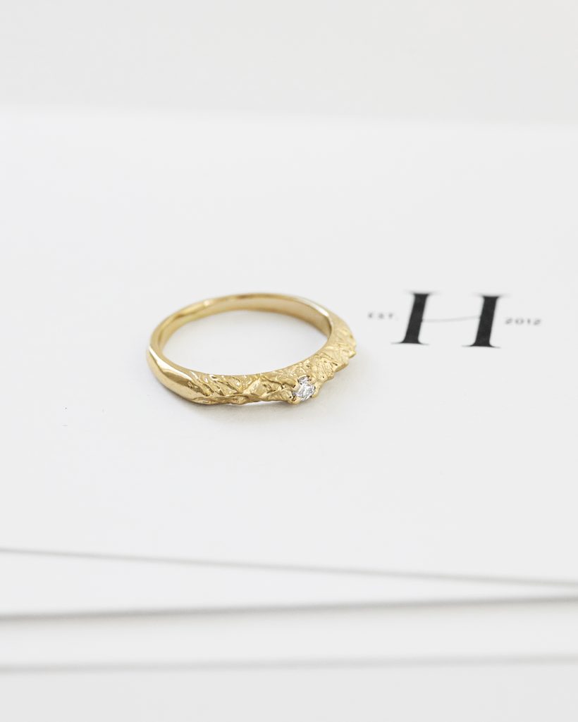 A delicate ring adorned with a mountain peak motif, viewed from a bird's-eye perspective. The hand carvings beautifully reflect light, and their intricate structure has been highlighted through polishing, creating the effect of gleaming ridges. The centerpiece of the decoration is a natural diamond set in the middle of the carving.