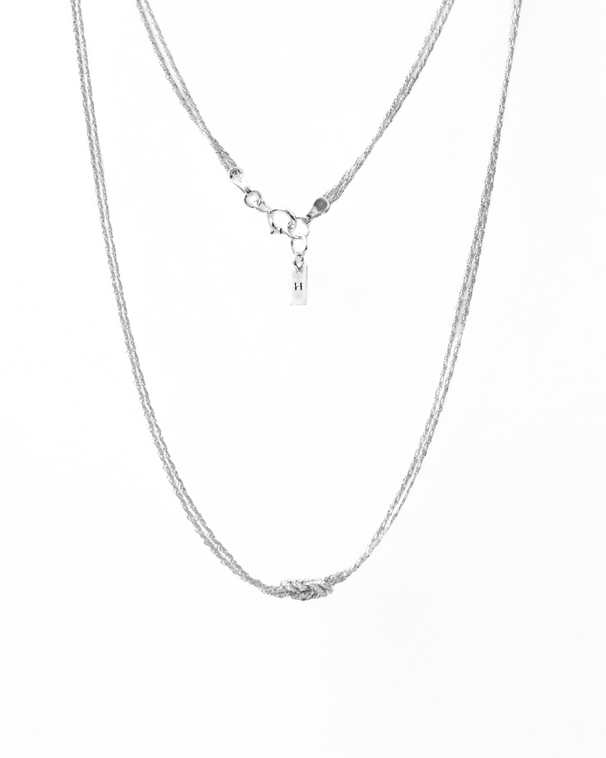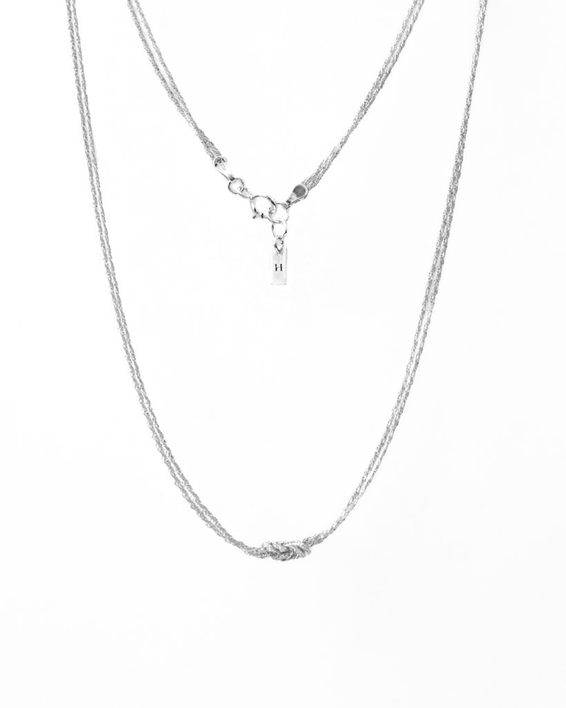 A minimalist silver necklace inspired by intertwined ropes forming a classic figure-eight knot. This knot is commonly used in climbing and sailing, for example, during belaying. We have made every effort to ensure that the design faithfully reflects its original form, with visible fibers in the weave.