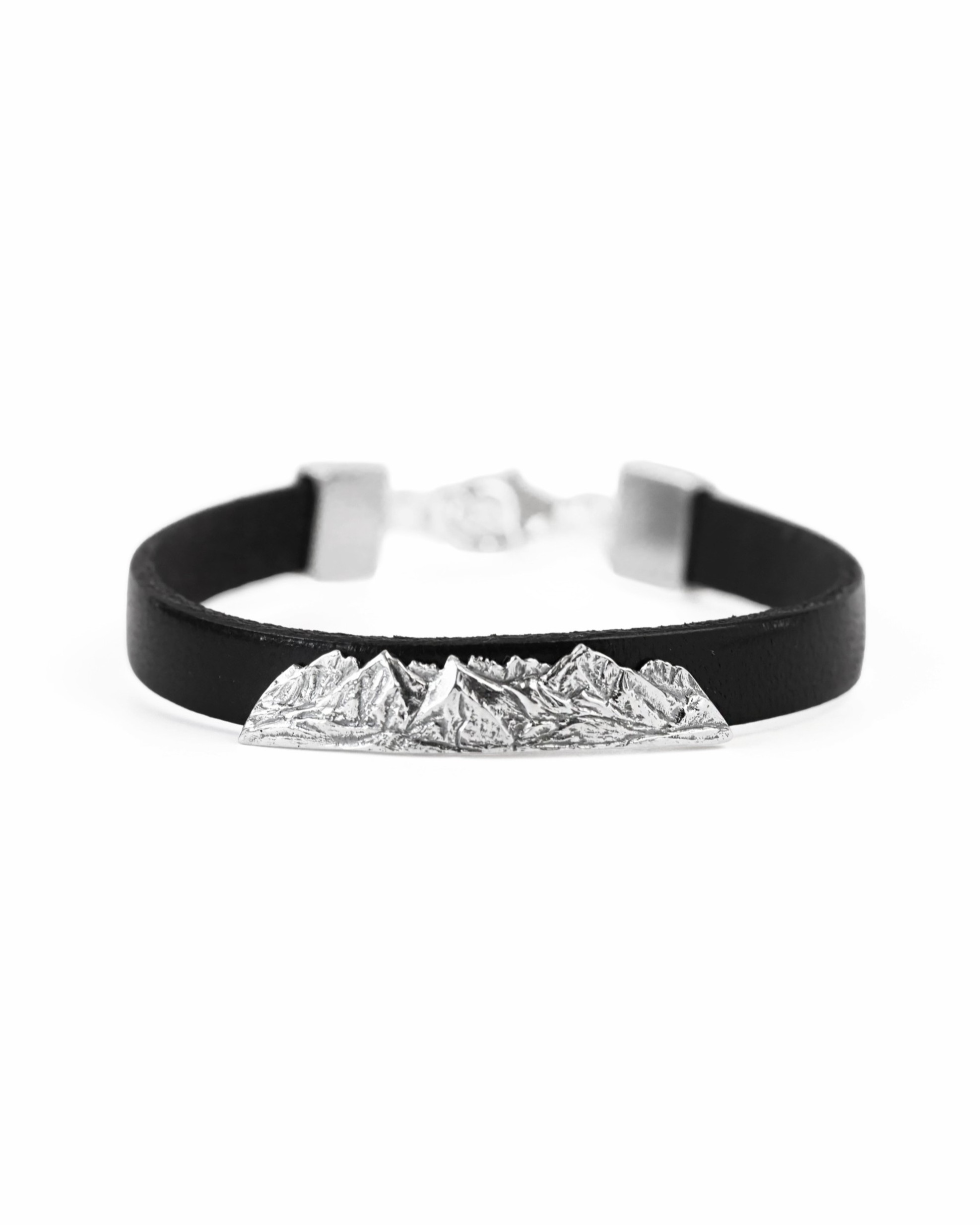 An impressive leather bracelet adorned with a hand-carved motif of the Tatra mountain panorama. The scene depicts the Belianske Tatras merging into the High Tatras, featuring peaks from Płaczliwa Skała to the ridges of Jaworowy Szczyt. The bracelet is very comfortable to wear and fastens with a classic silver clasp.