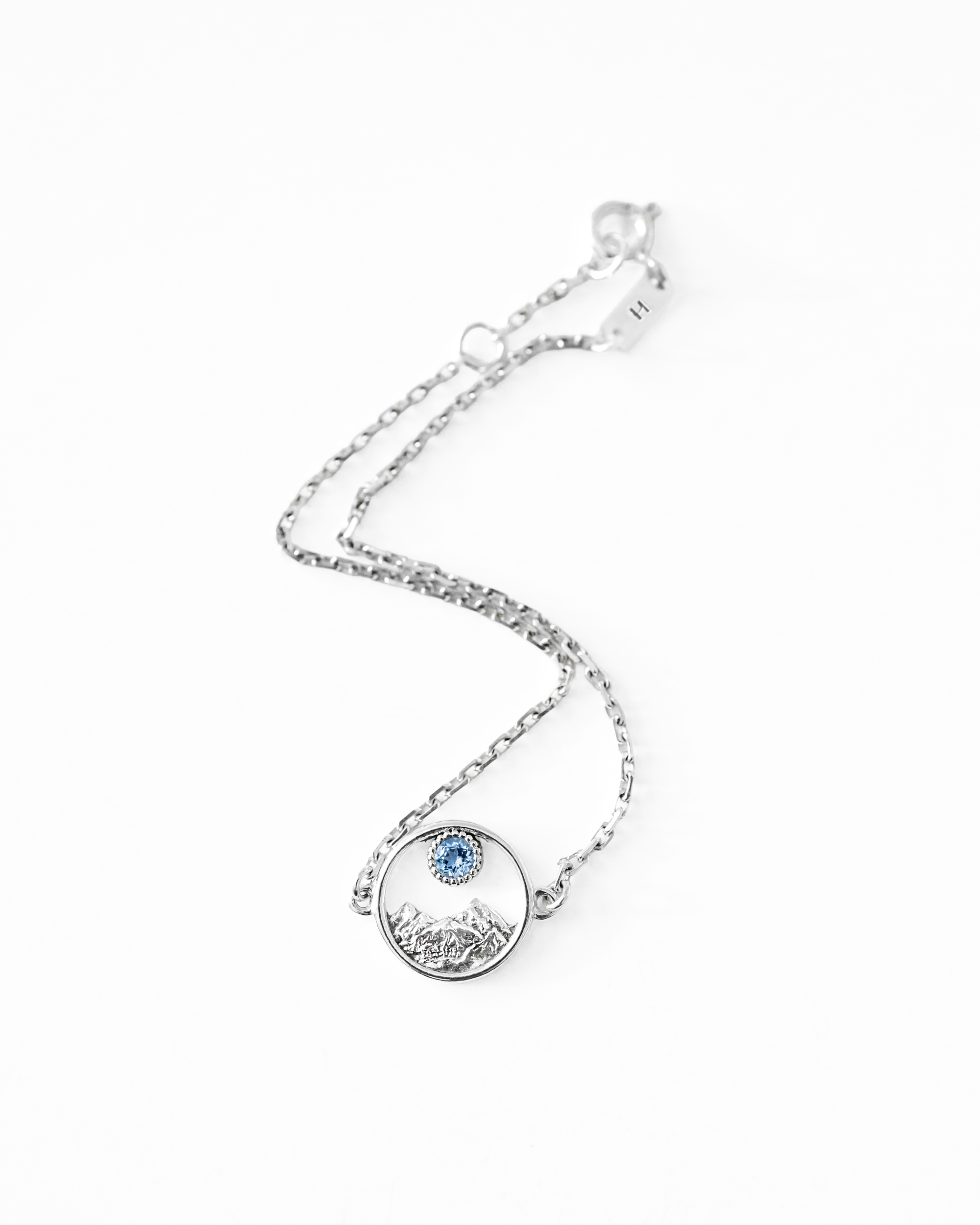 A delicate bracelet adorned with a pendant featuring a mountain motif. The carved landscape is enclosed in a round setting and embellished with a hand-set blue moissanit. To highlight the intricate details of the carving, the pendant has been oxidized and polished.