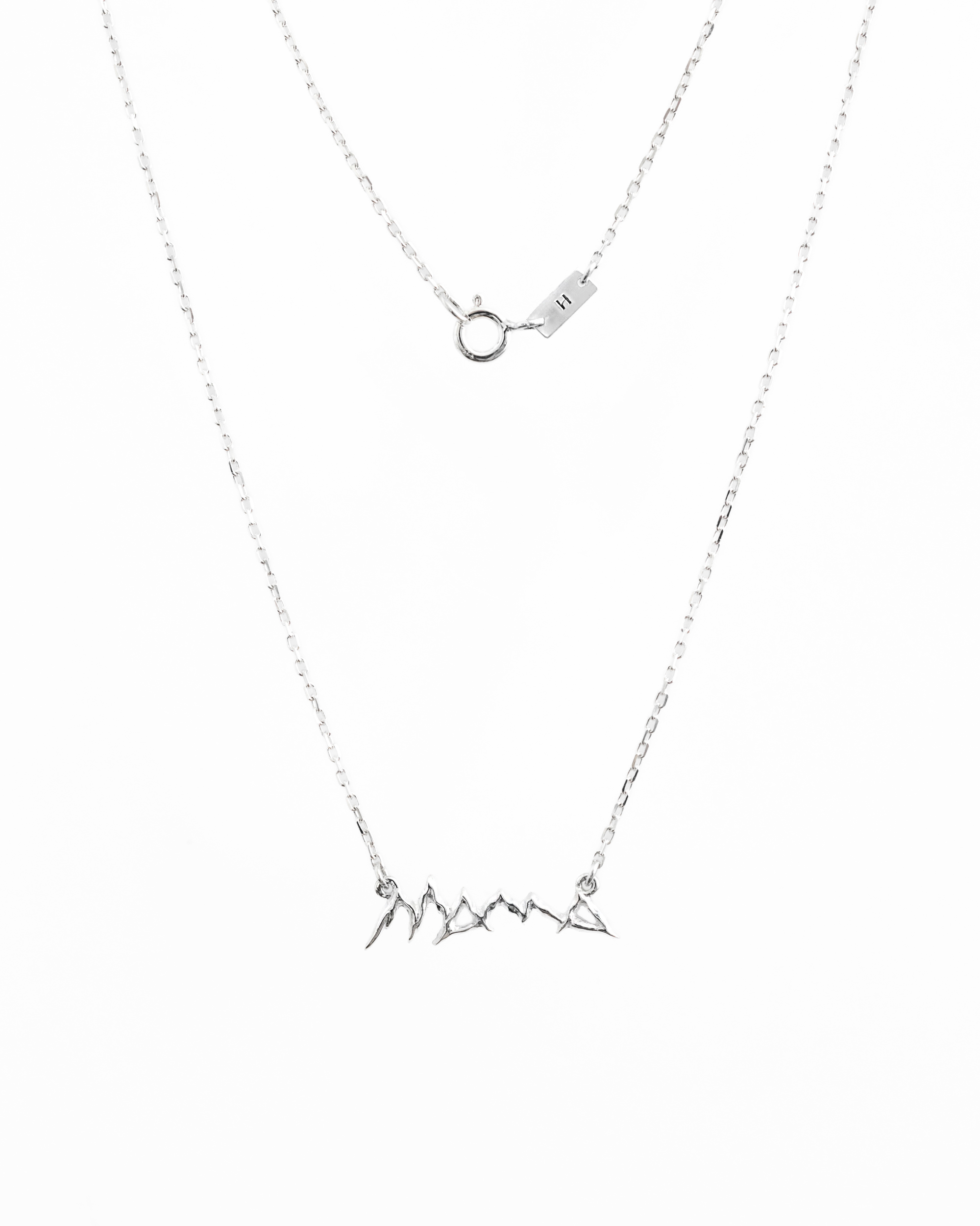 A delicate necklace featuring a minimalist mountain panorama motif. The ridges of the peaks form the word "MAMA." The necklace sits close to the neck.