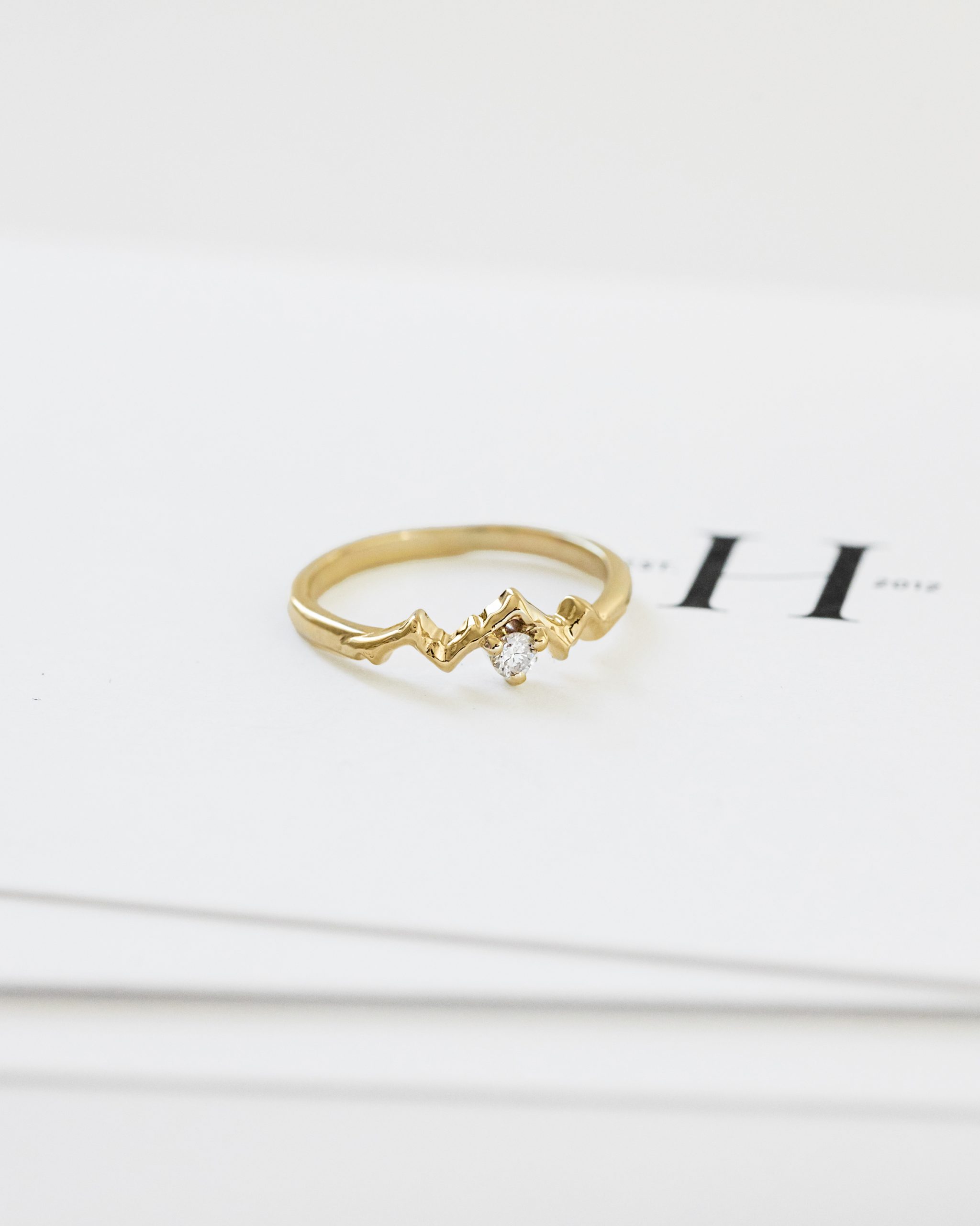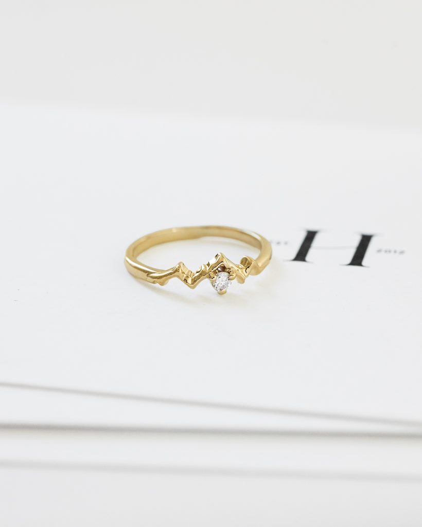 The decorative element of this Mountian diamond ring for engagement is the outline of mountain peaks. Its motif is smoothly set into the ring’s rim, and the whole design is made in the spirit of jewelry minimalism. As a result, it looks delicate and very feminine. Yet we made sure that despite the subtle design, the ring was impressive. The gold has been polished to a high shine, so the ring shimmers beautifully in the light, which further emphasizes the motif of mountain peaks. Complementing the sparkle of this glamorous mountain jewelry is a 2.5mm natural diamond. The stone has been set in the side of the highest of peaks, adding further variety to this design.