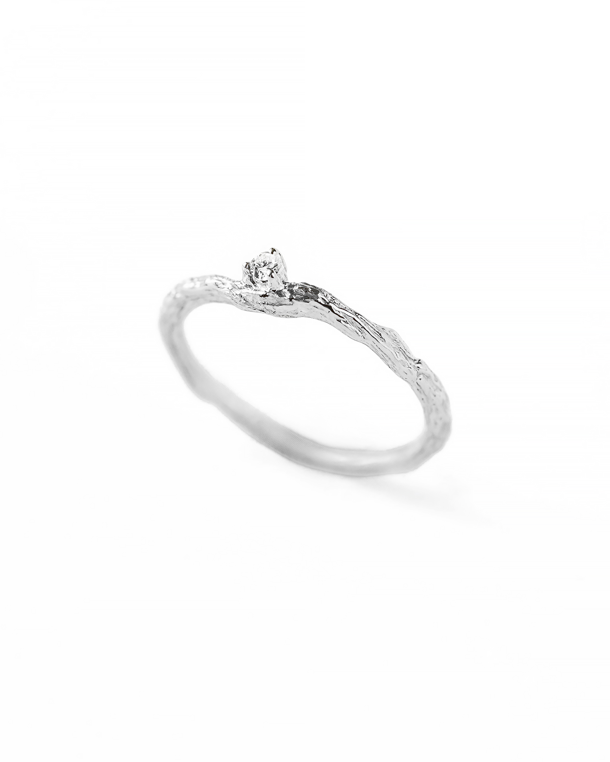 A striking ring inspired by the form of a branch. Each line has been meticulously sculpted, creating a subtle texture and reflecting the natural beauty of the curves. The design is crowned with a lab-grown diamond. The surface has been polished to highlight the texture of the pattern.