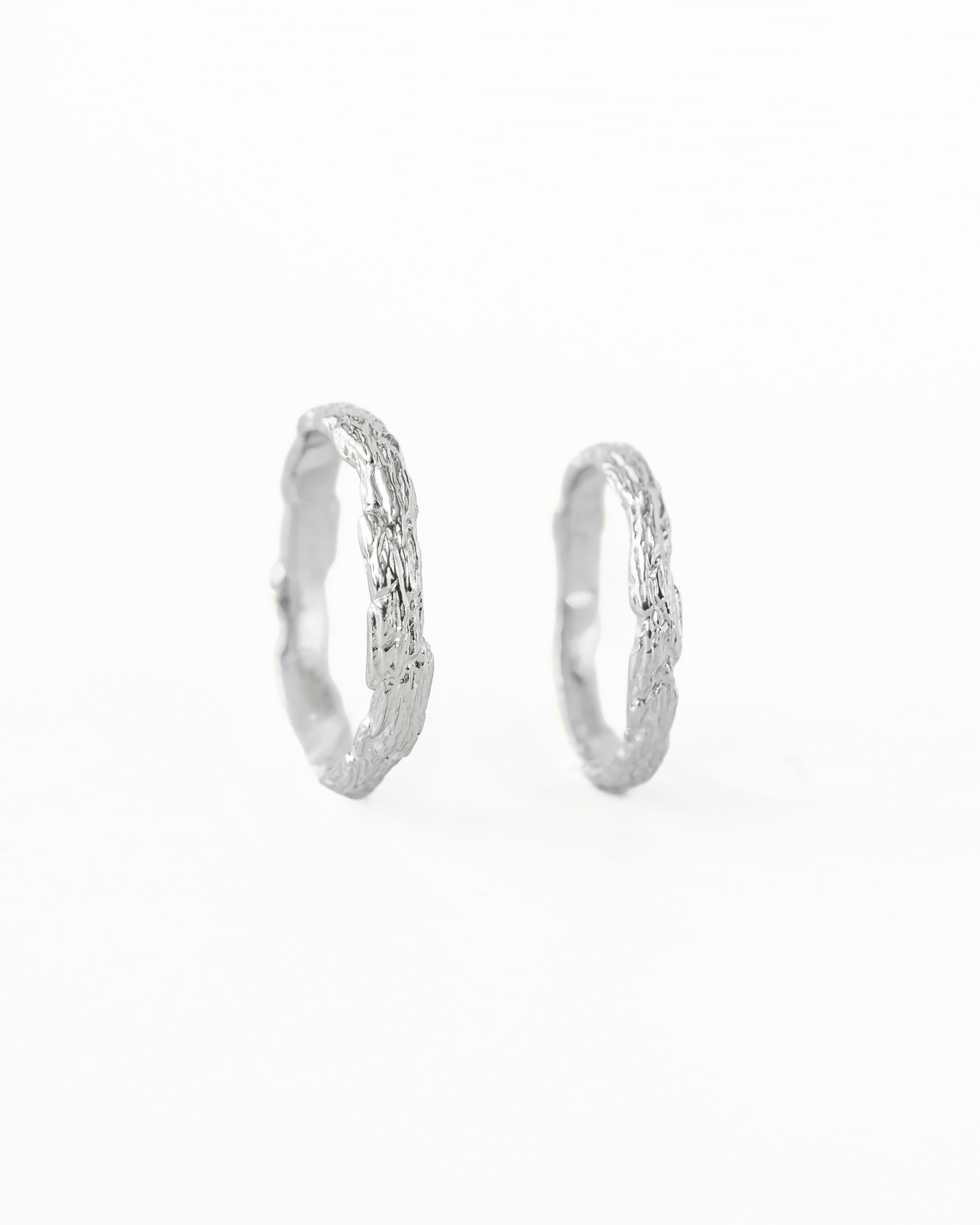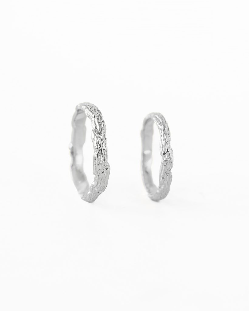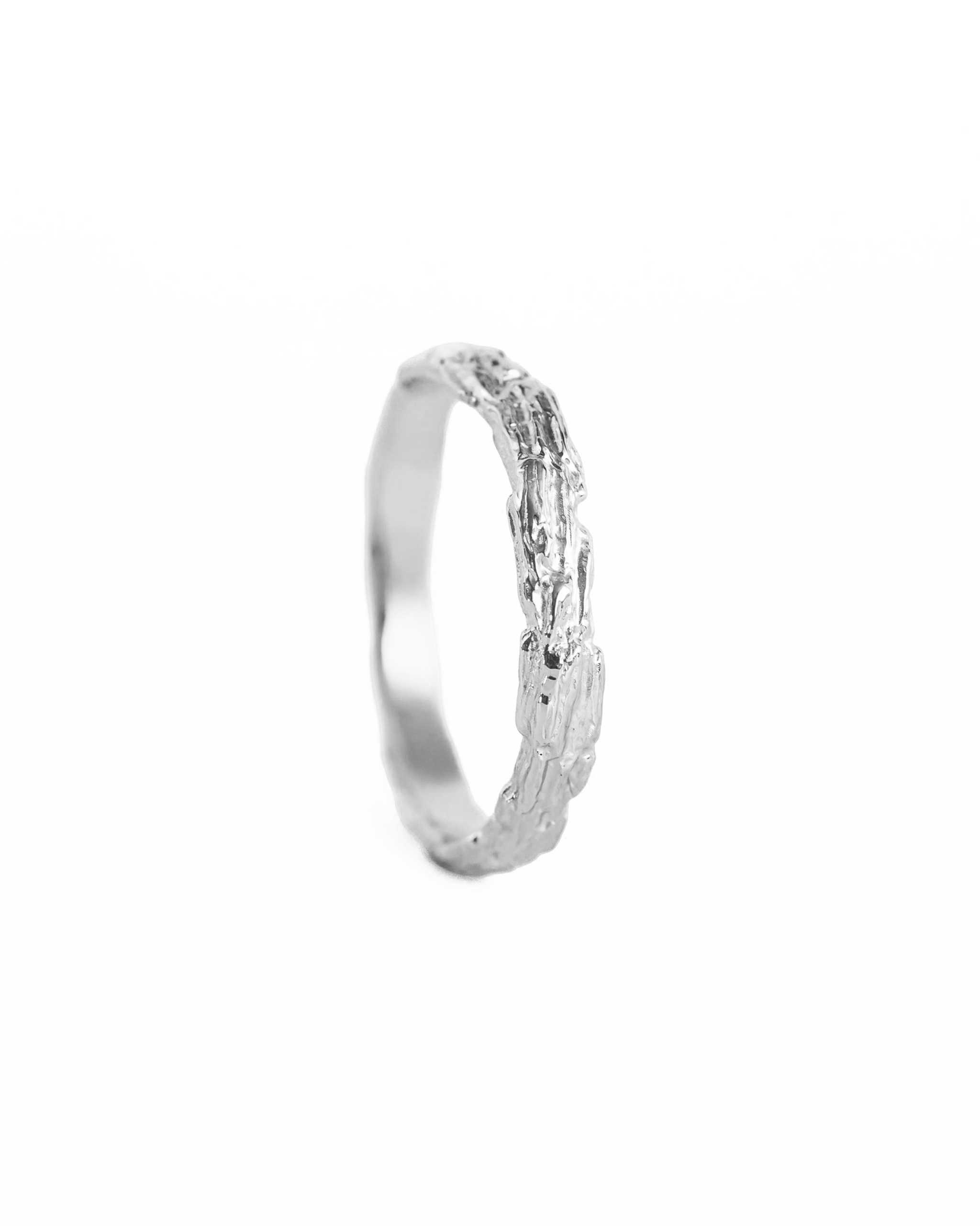 A ring inspired by the delicate structure of twigs. The surface is adorned with subtle protrusions and an irregular arrangement of lines. The hand-crafted texture gives it an organic, slightly raw character. The surface has been polished to a high shine, highlighting the intricate carvings.