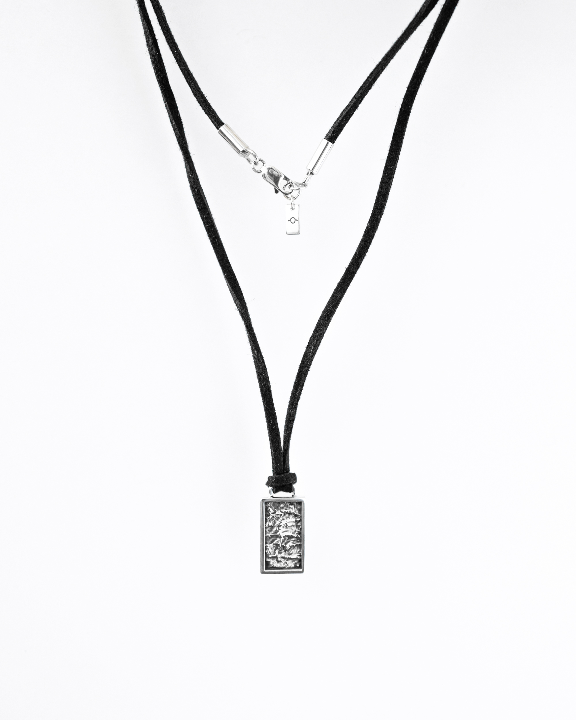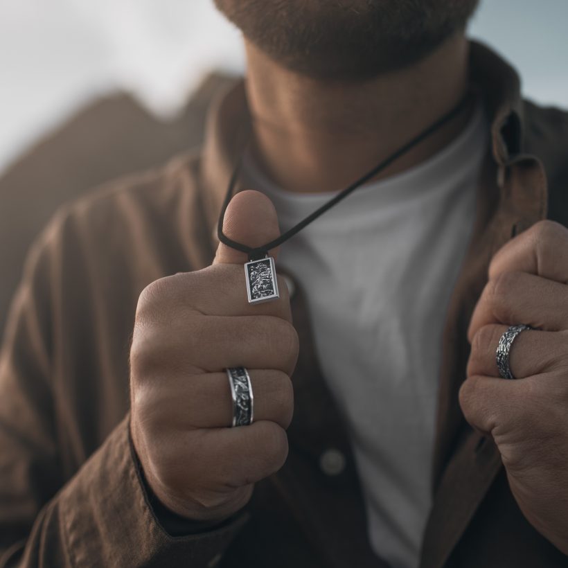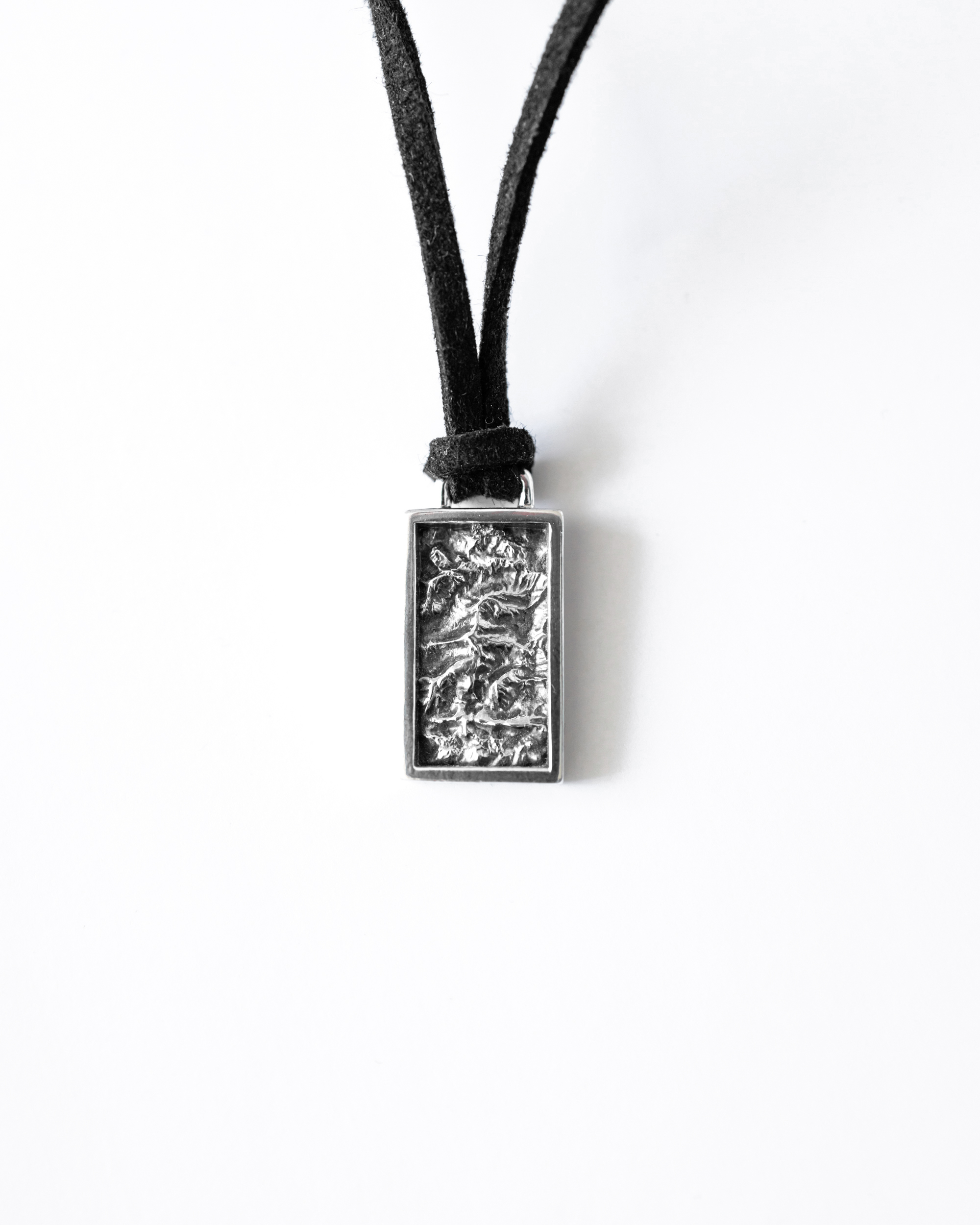 A men's necklace adorned with a pendant that replicates the topography of mountainous terrain from a bird's-eye view. The hand-carving reveals the undulating ridges, mountain gullies, and rock textures. The silver has been oxidized and polished to enhance the three-dimensionality of the design.