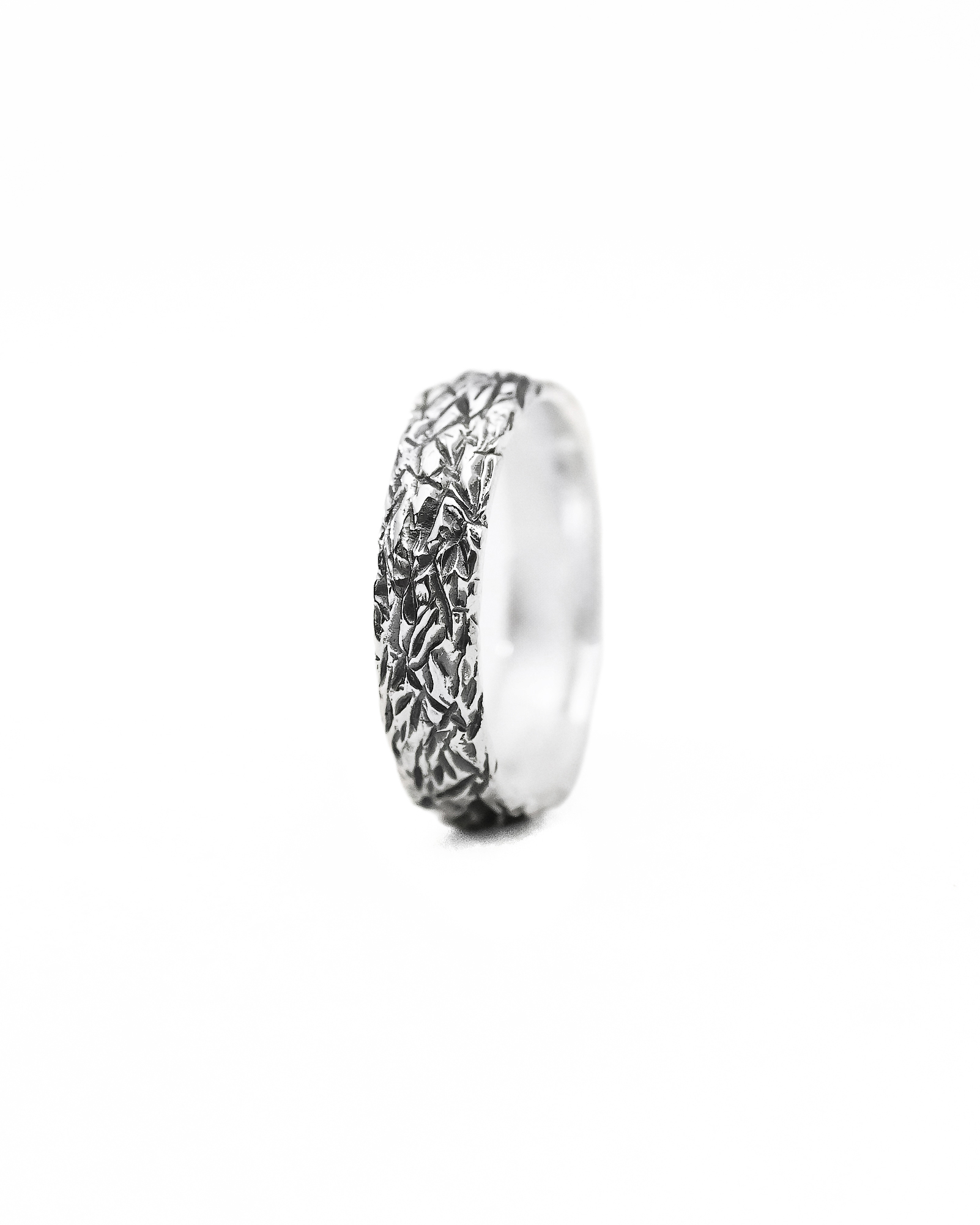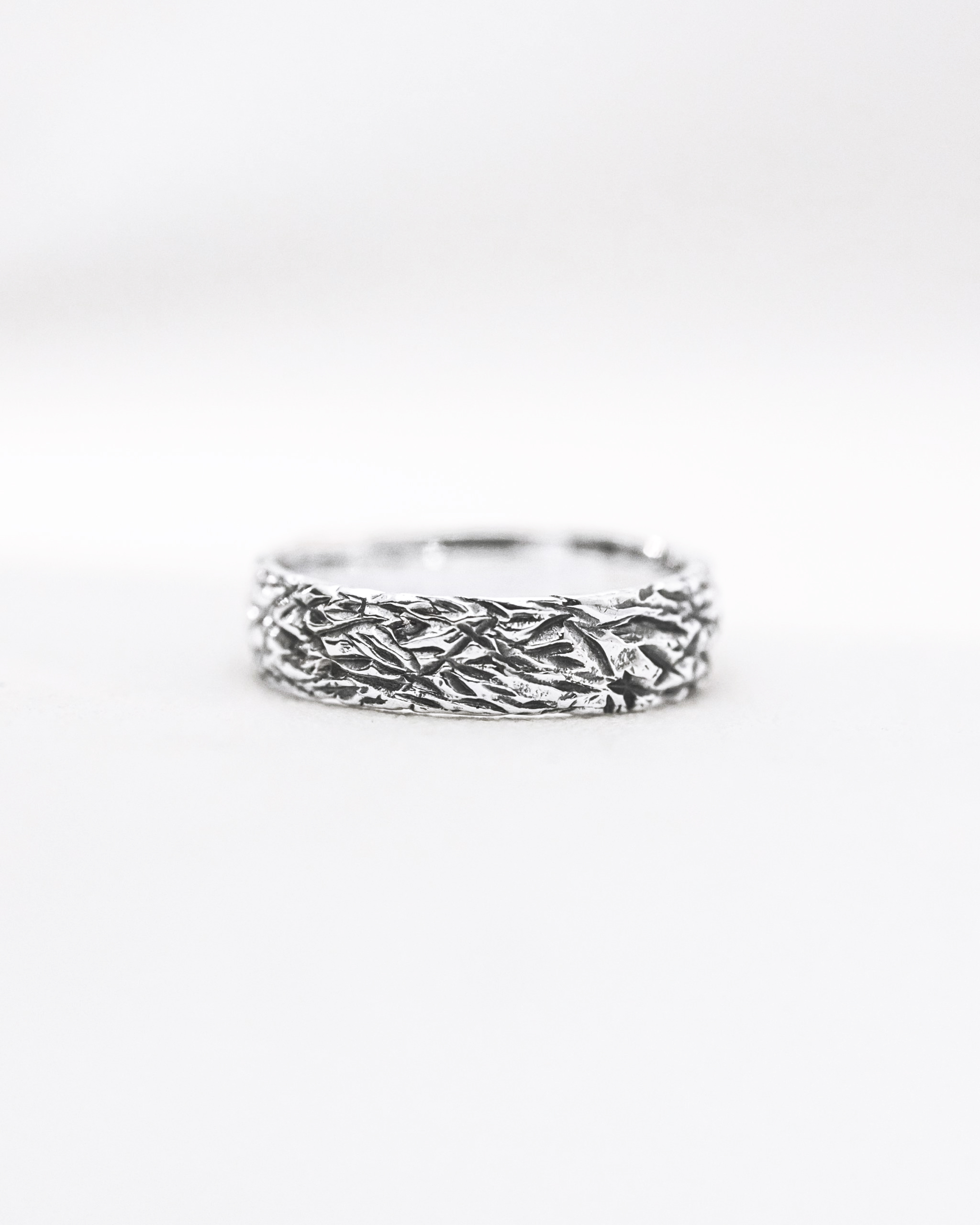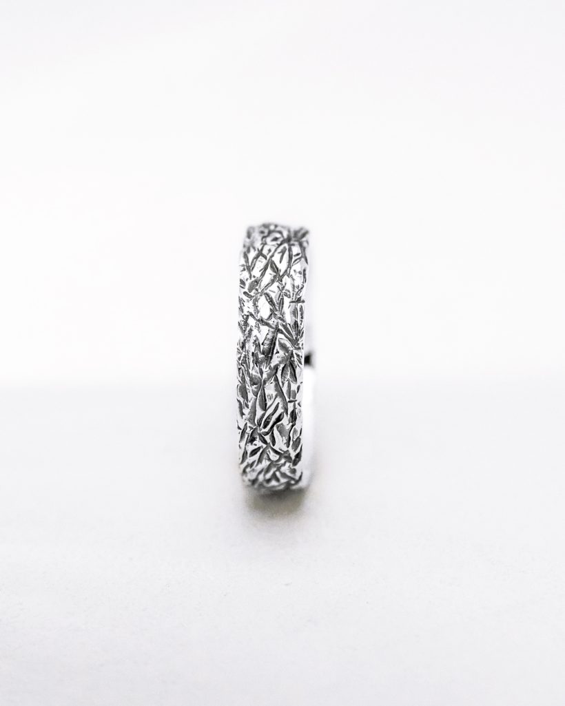 The ornamentation of the presented men’s ring is inspired by the texture of mountain rocks. To achieve this effect, we finished the ring using a milling method, then oxidized and polished it. As a result, the pattern is clearly visible and interestingly conveys the ruggedness of the mountain terrain sculpture. We used 925 sterling silver to craft the jewelry.