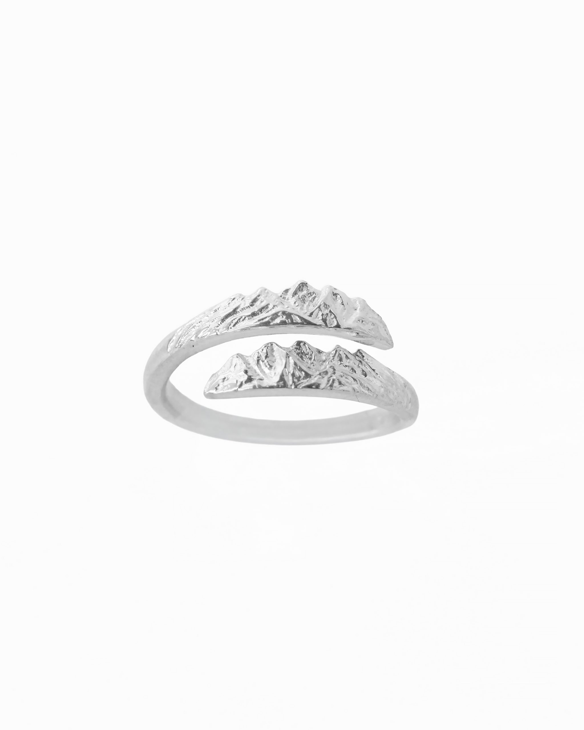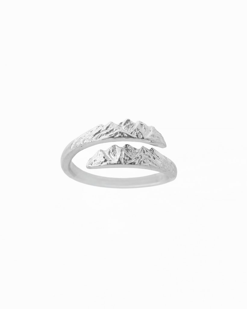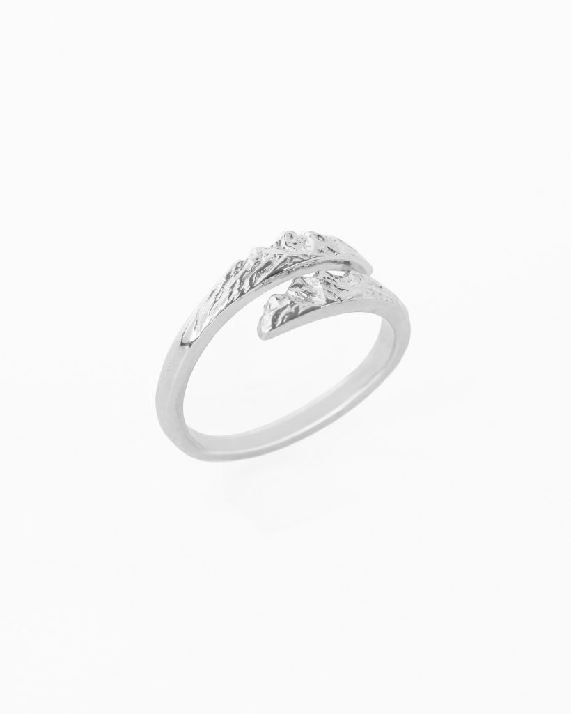 A ring adorned with mountain sculptures. The decorative motifs of the mountain range overlap to create a unique composition. The final embellishments have been oxidized to enhance their three-dimensionality. To adjust the ring, gently widen or tighten it.