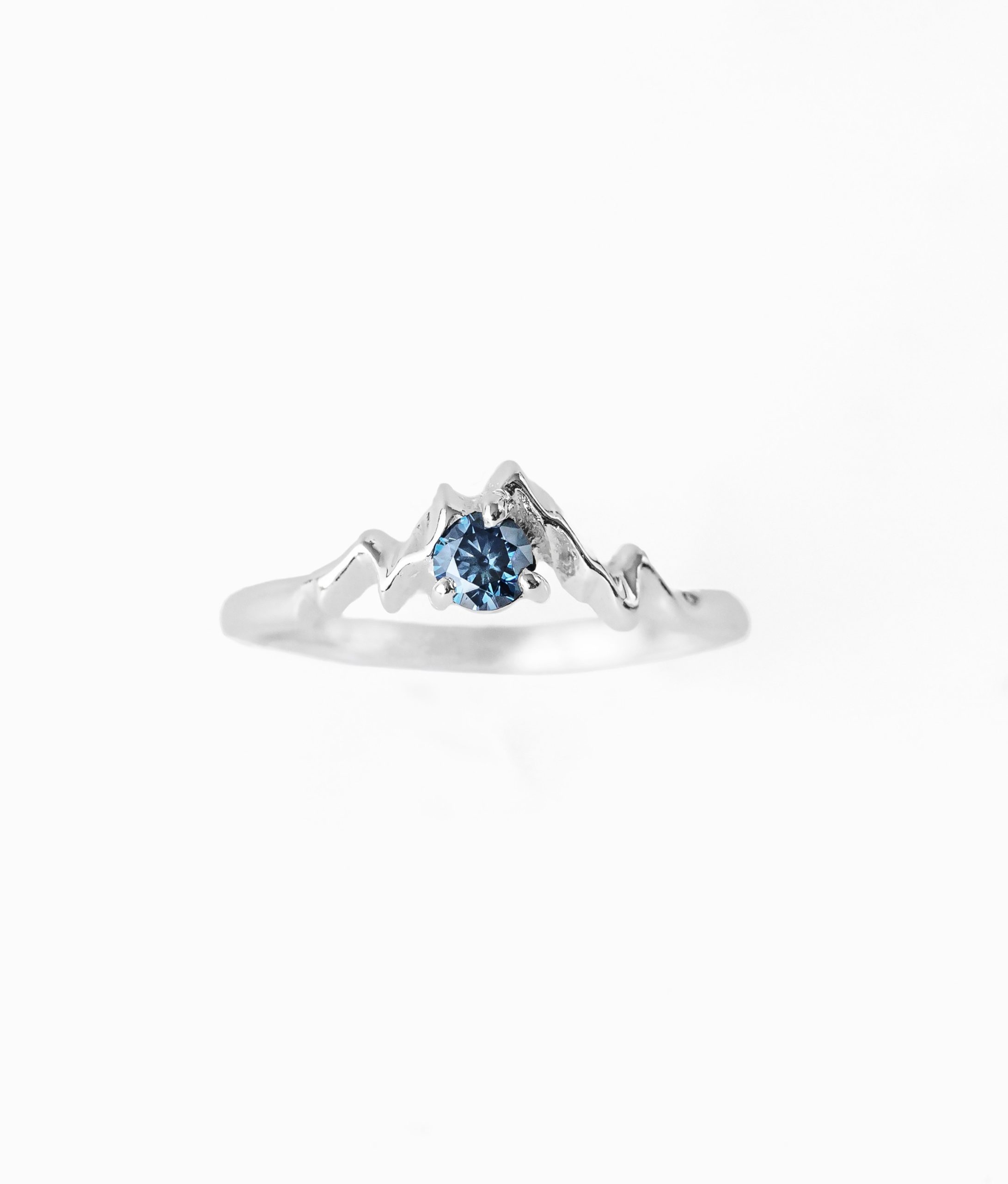 An eye-catching engagement ring adorned with a subtle mountain panorama motif. The hand-carved outline of the mountains flows smoothly along the band of the ring. The design is crowned with a natural blue moissanite, set beside the highest peak.
