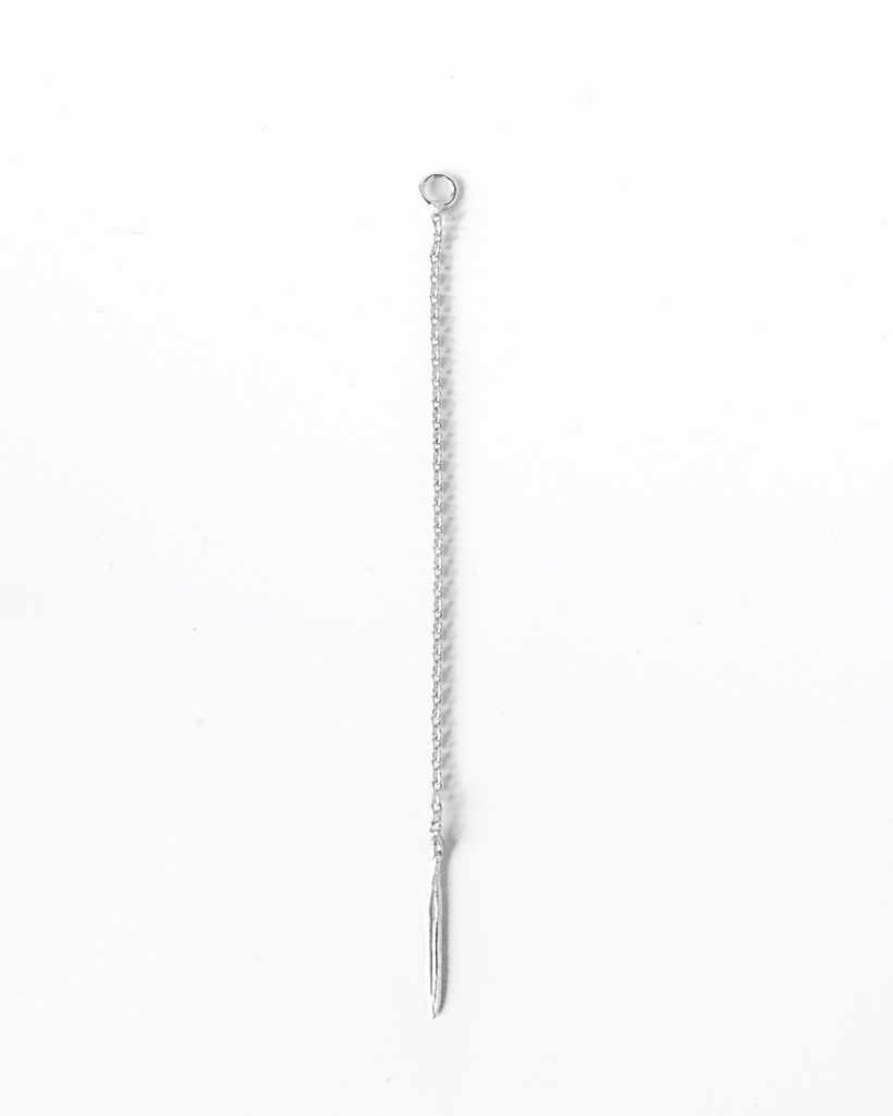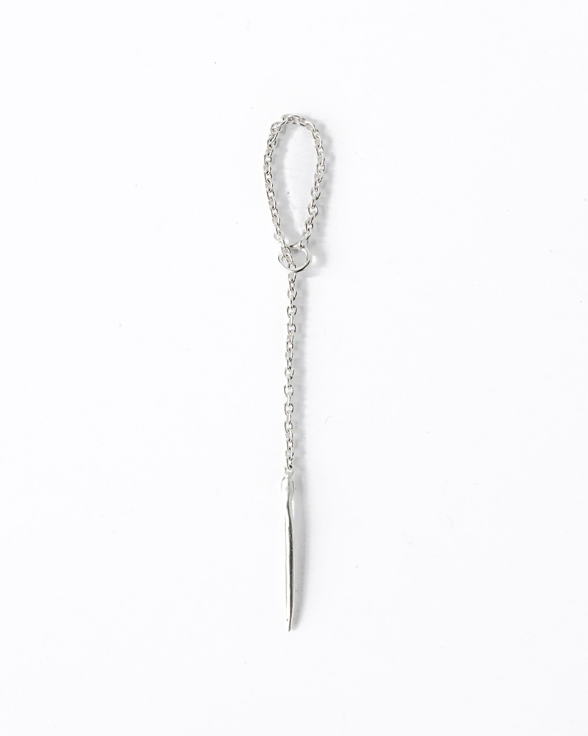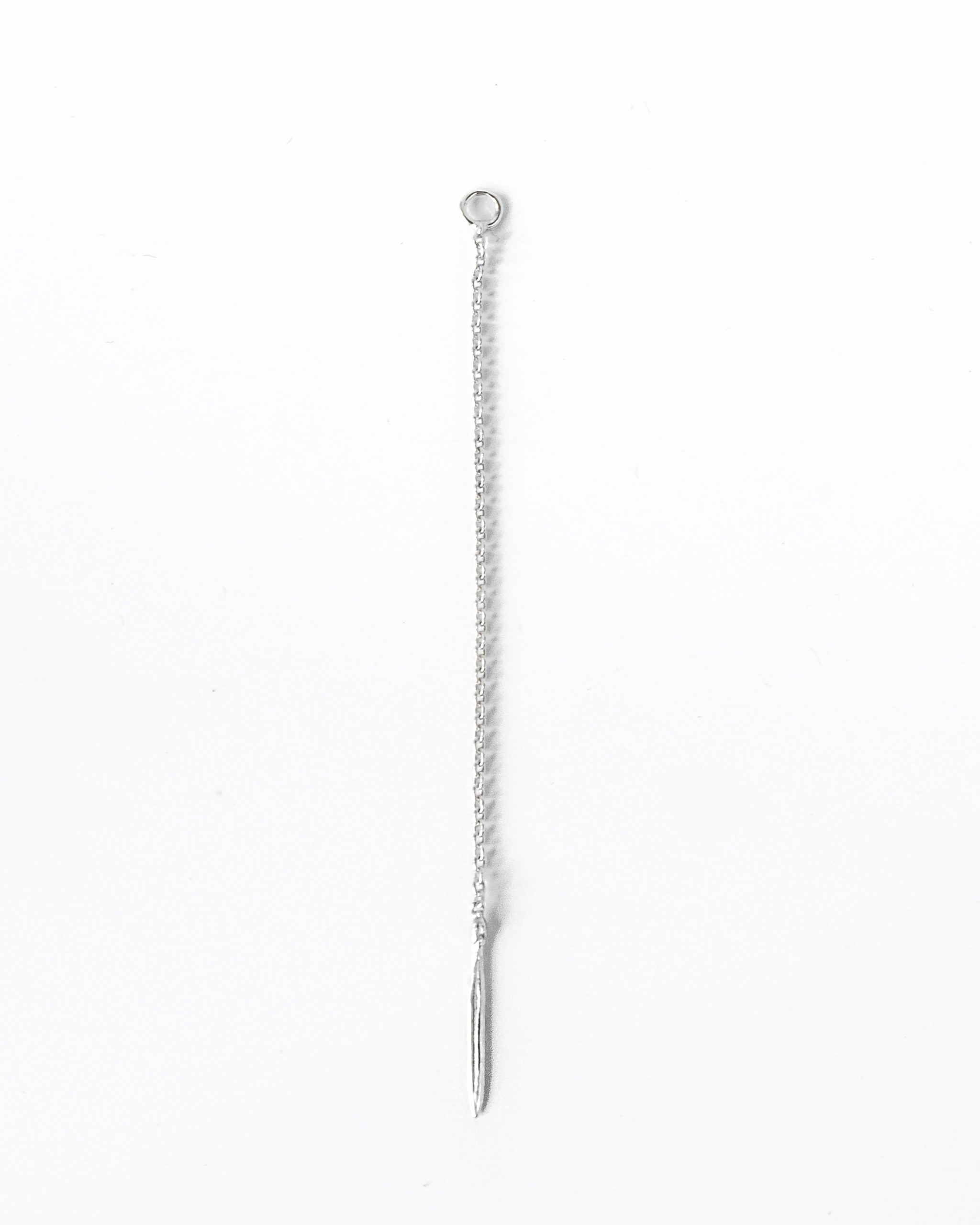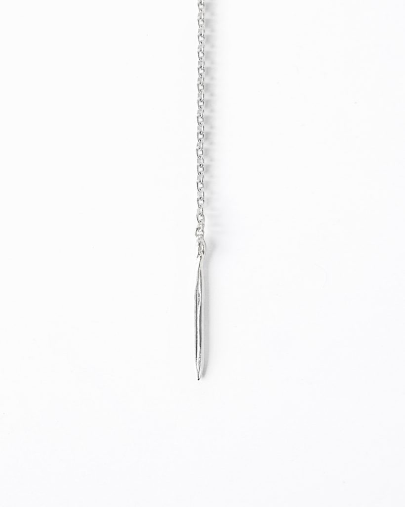 The delicate form of a spruce needle has been precisely and carefully recreated. The slender element, suspended on a fine silver chain, rests lightly on the ear. The earring impresses with its organic lines and subtlety inspired by nature. It has no traditional clasp; simply thread the needle through the loop, making it exceptionally easy and comfortable to wear.
