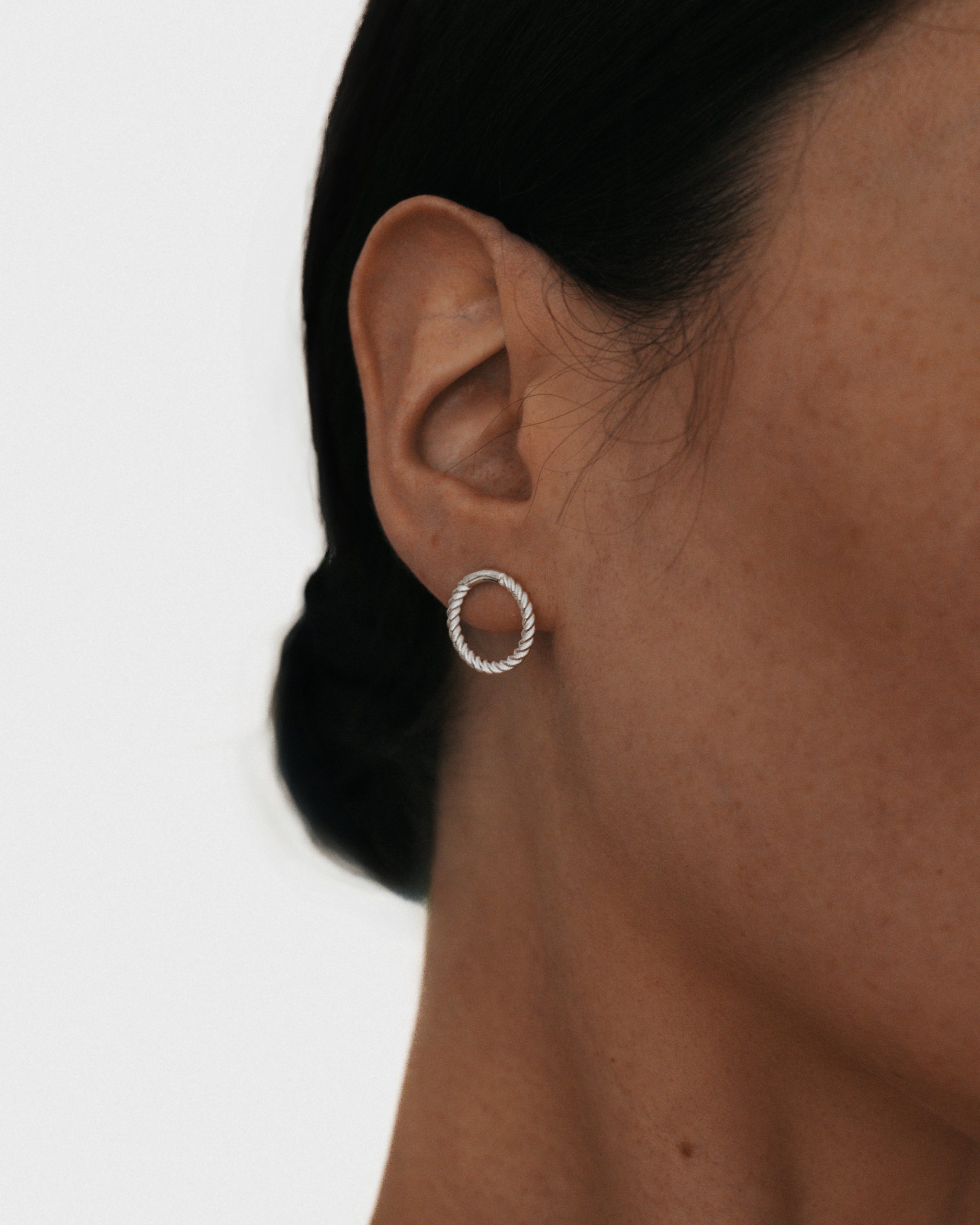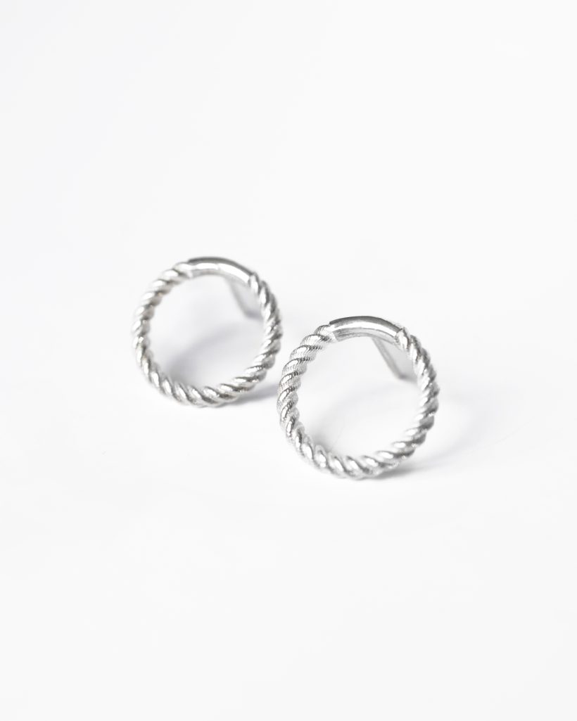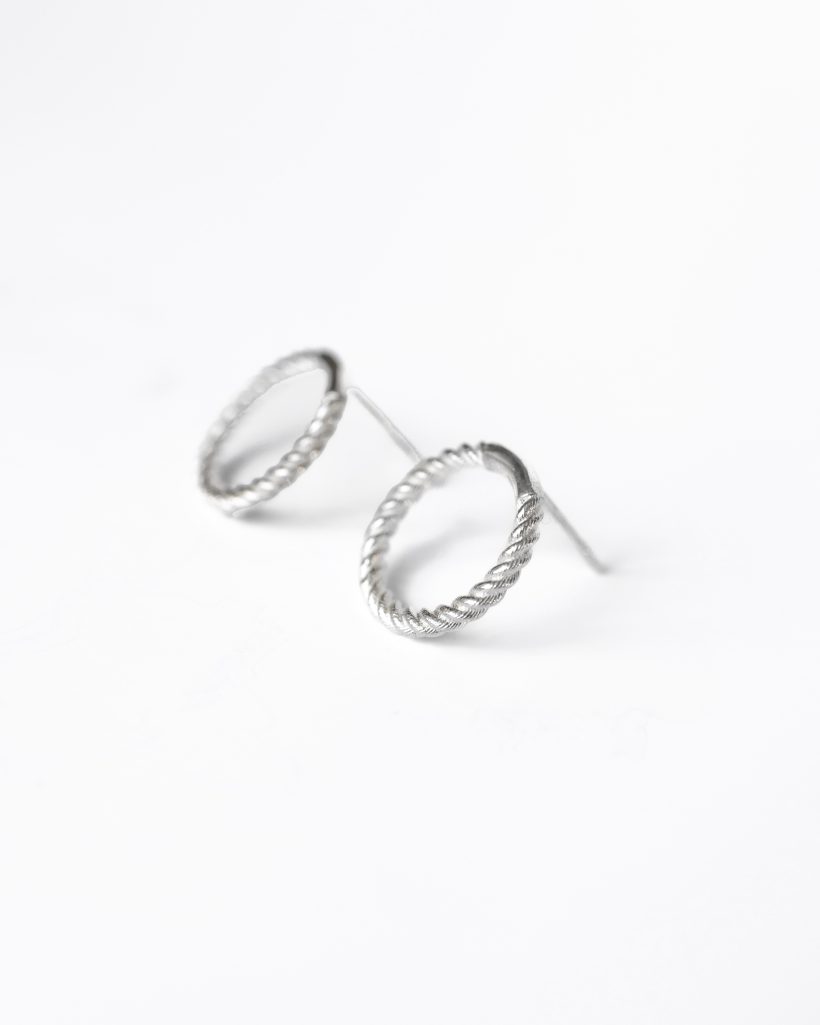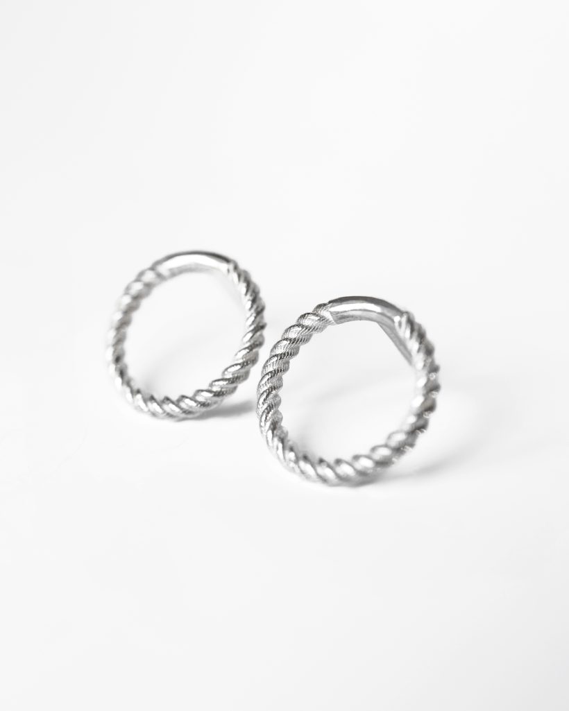 Delicate earrings featuring a minimalist design, adorned with a pattern replicating the weave of a climbing rope. The intricate texture has been polished to a high shine, allowing the earrings to beautifully reflect light.