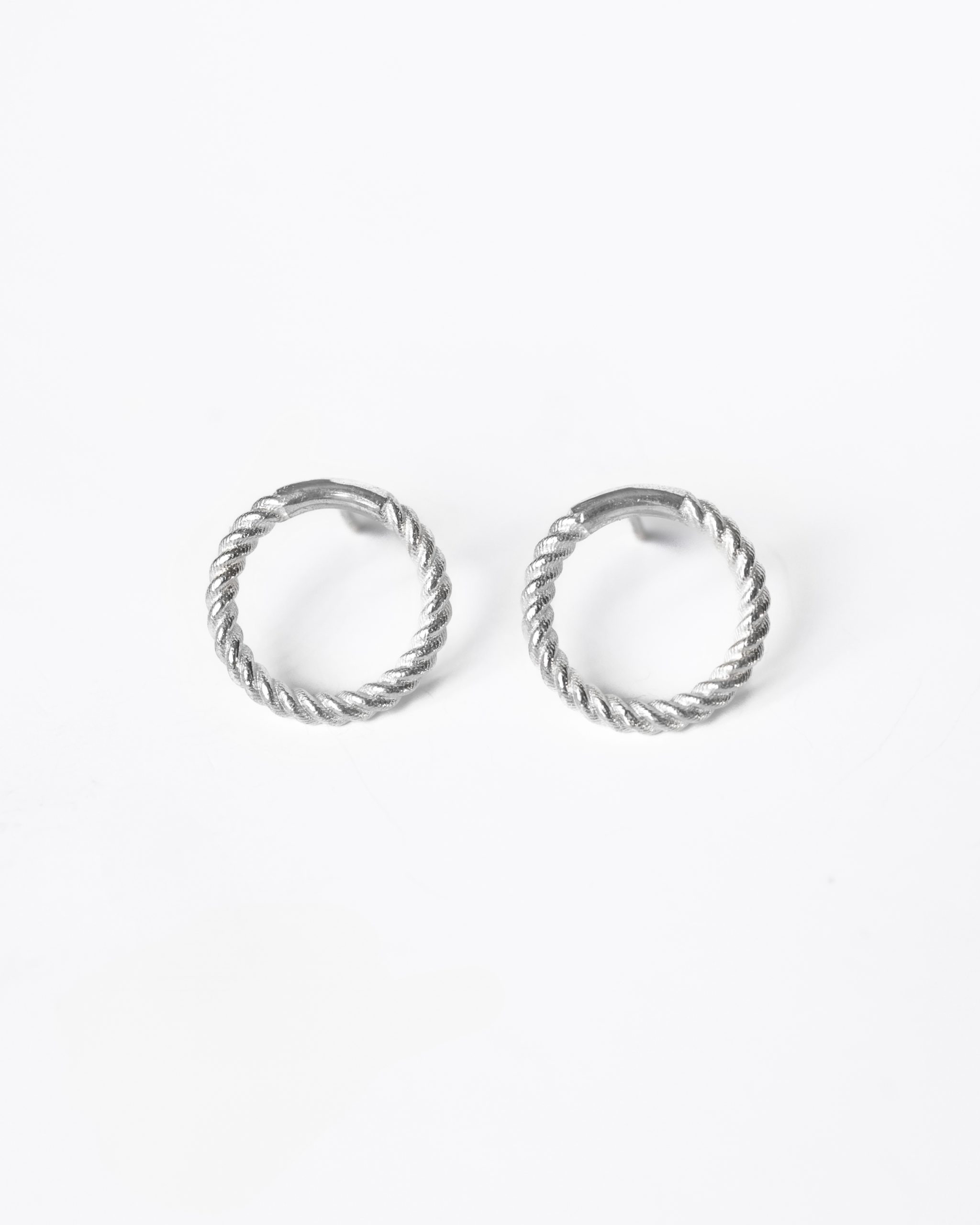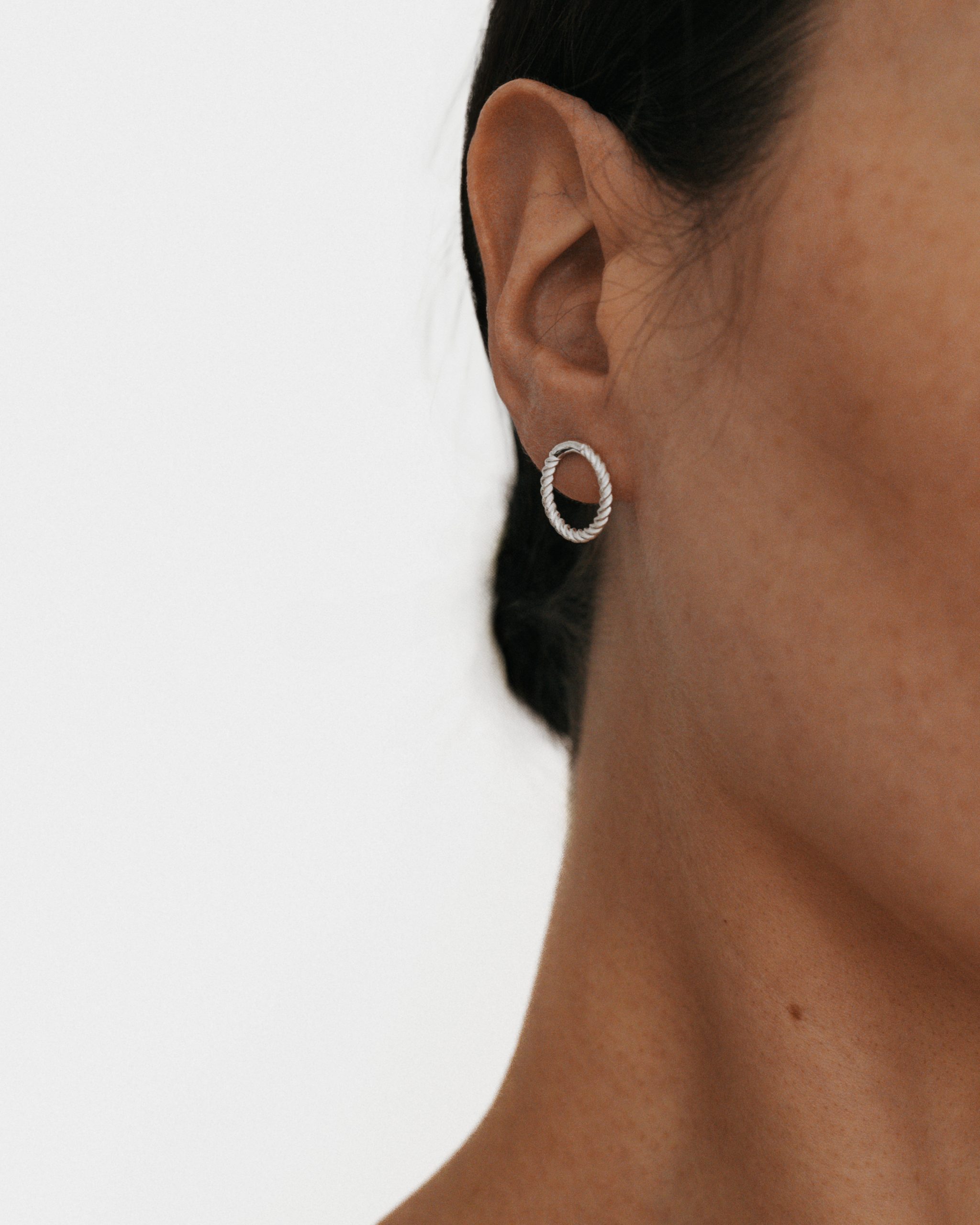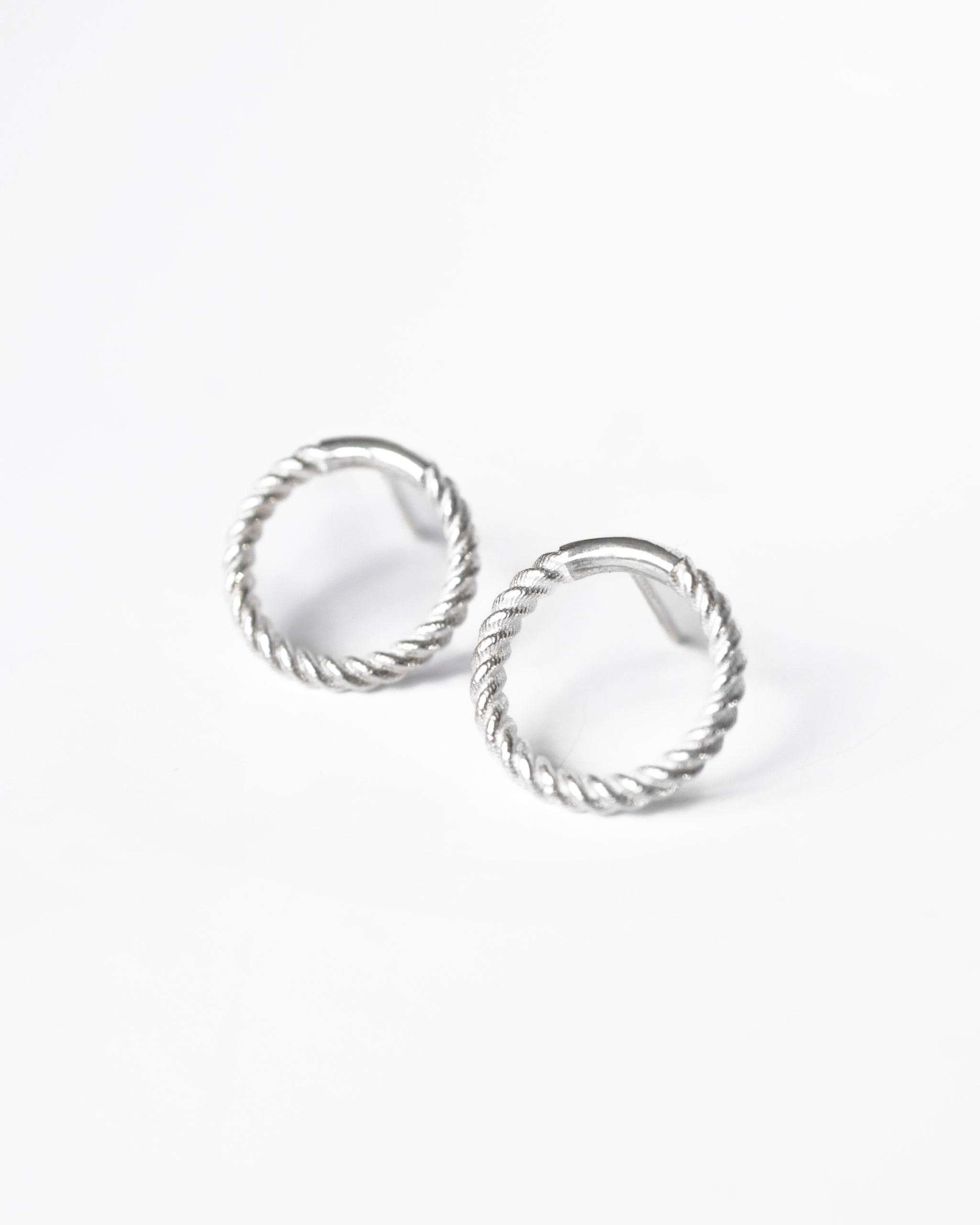 Delicate earrings featuring a minimalist design, adorned with a pattern replicating the weave of a climbing rope. The intricate texture has been polished to a high shine, allowing the earrings to beautifully reflect light.
