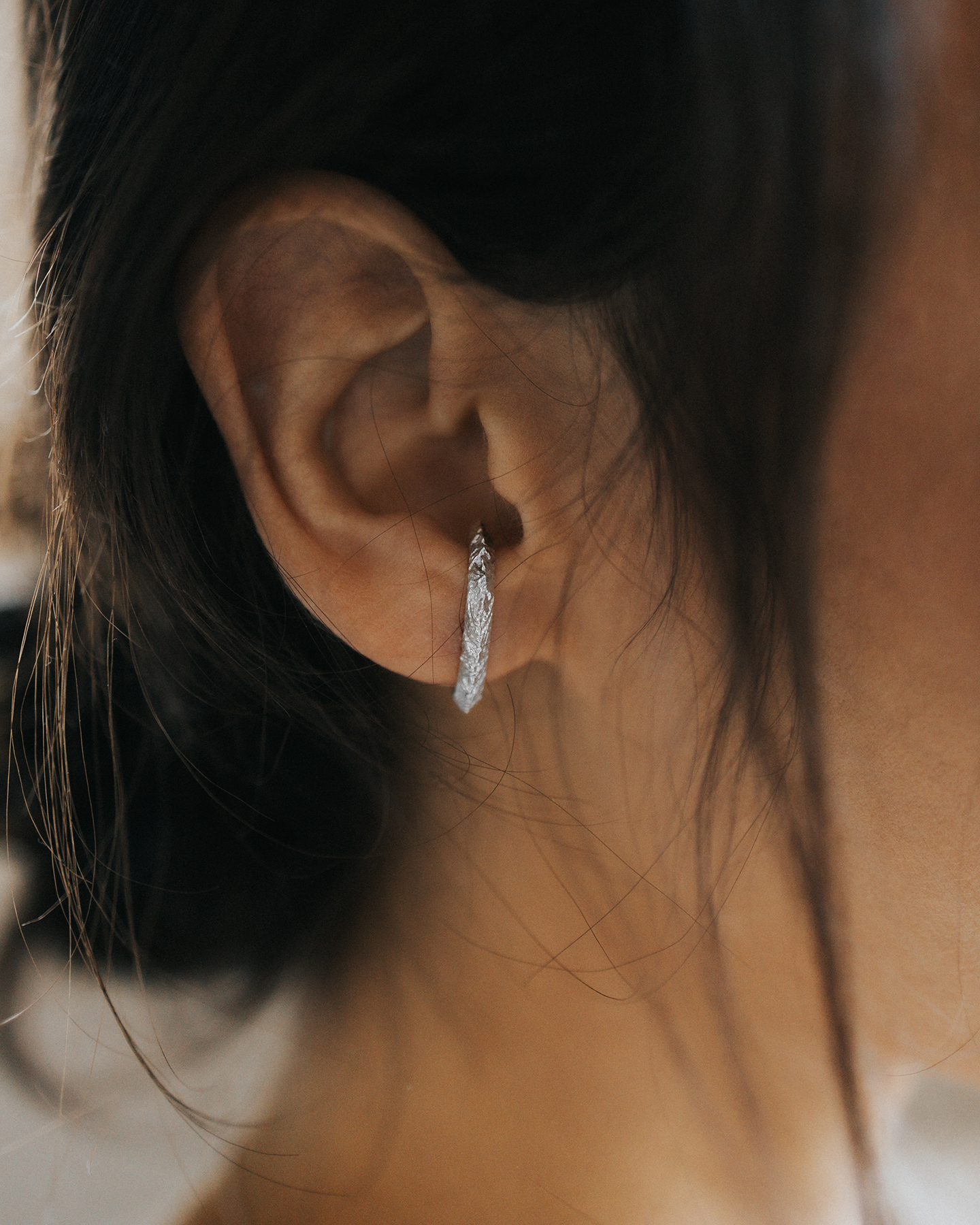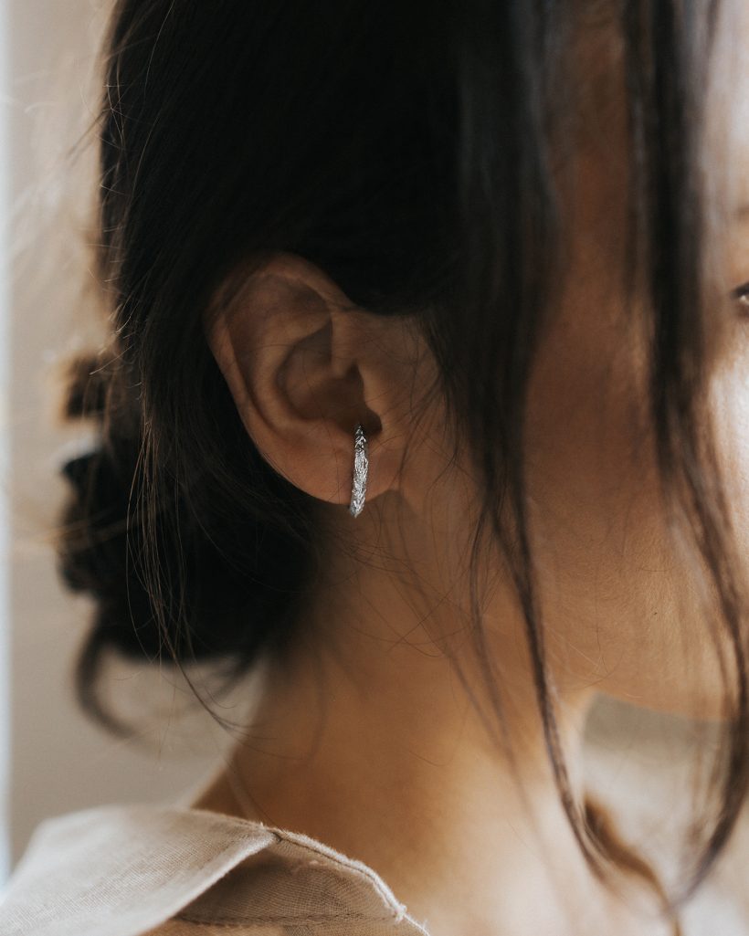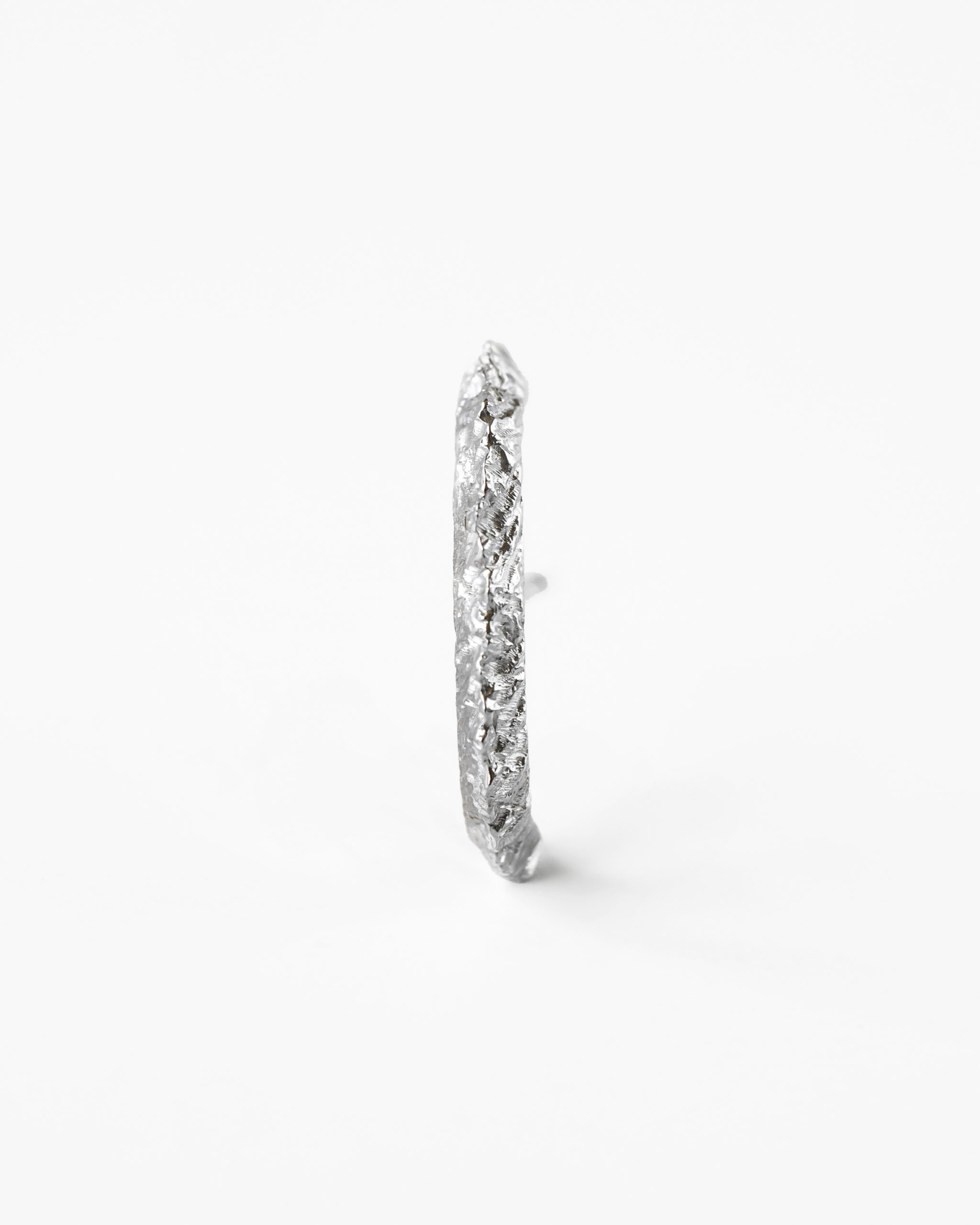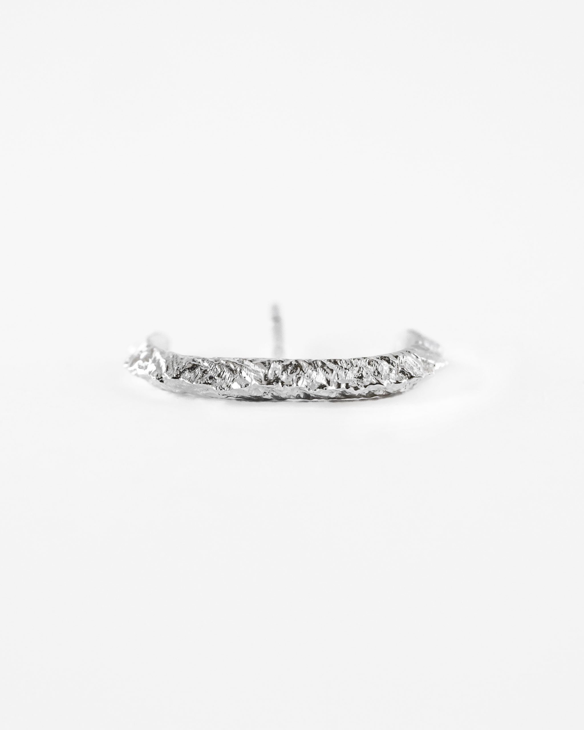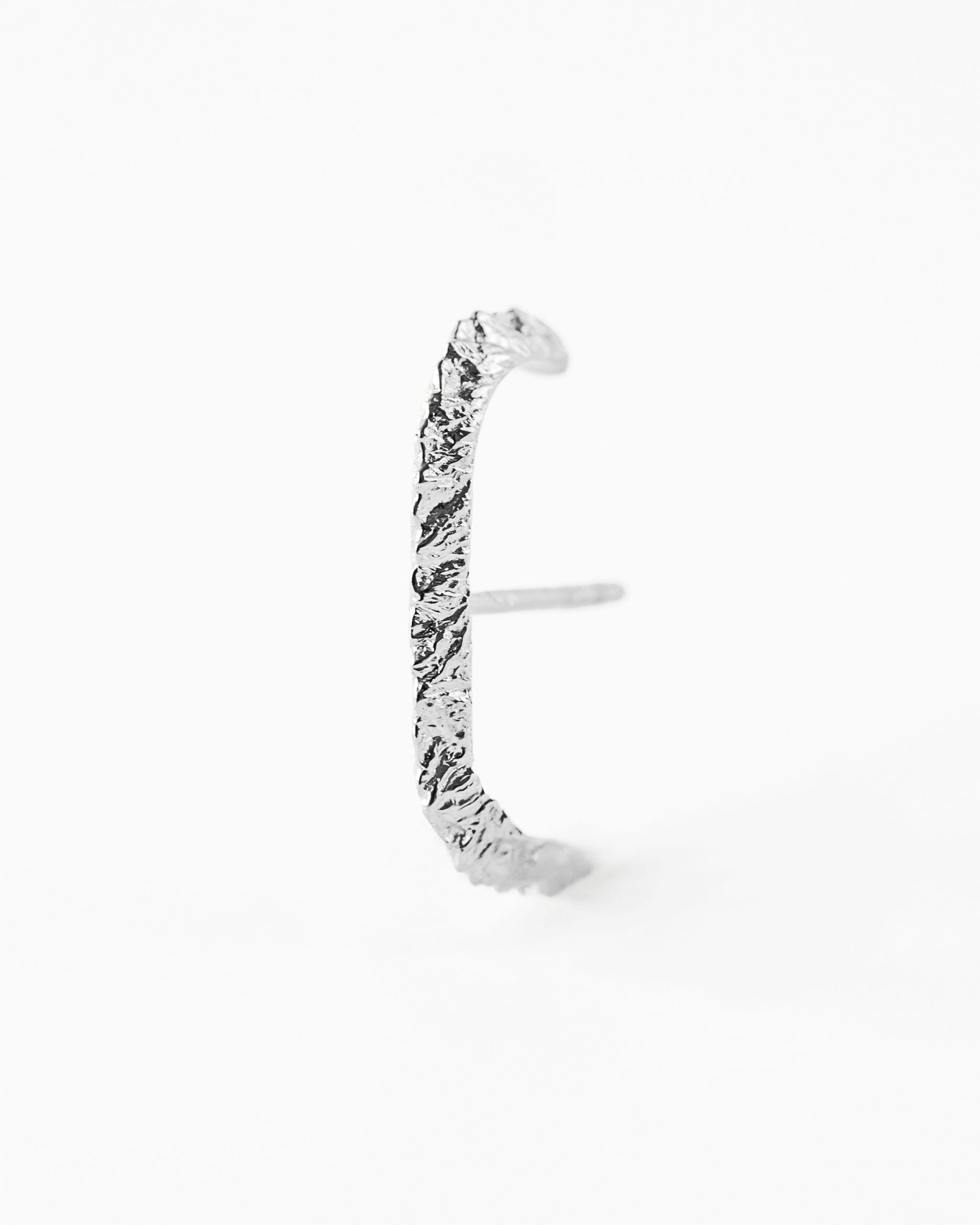 Delikatny a zarazem efektowny kolczyk zdobiony motywem turni, widzianej z lotu ptaka. Ręczne rzeźbienia pięknie odbijają światło, a ich misterna struktura została podkreślona dzięki polerowaniu dając efekt lśniących turni. Kolczyk posiada nieoczywistą, zakrzywioną formę ze sztyftem, pięknie otulając płatek ucha. Kolczyk sprzedawany jest pojedynczo.