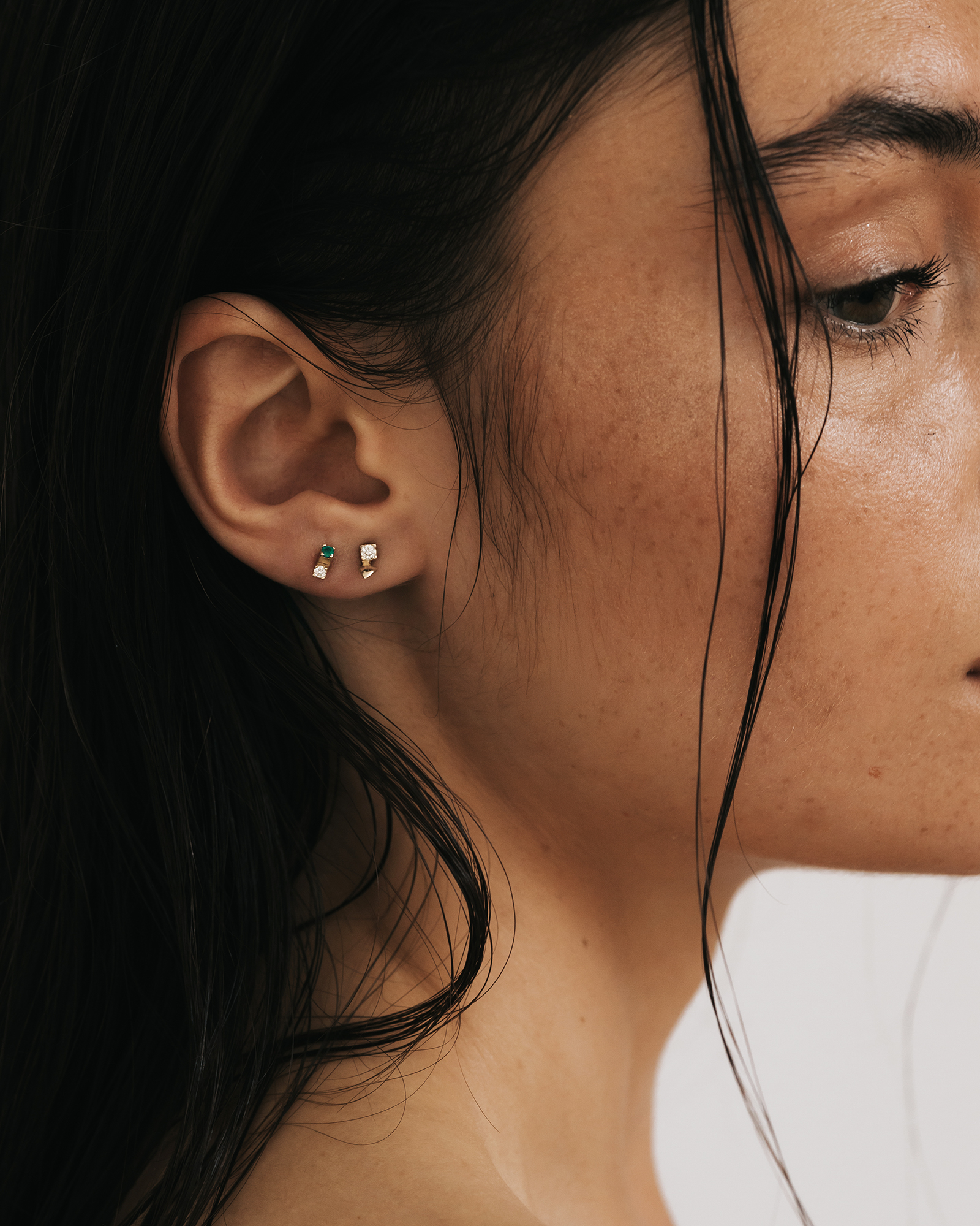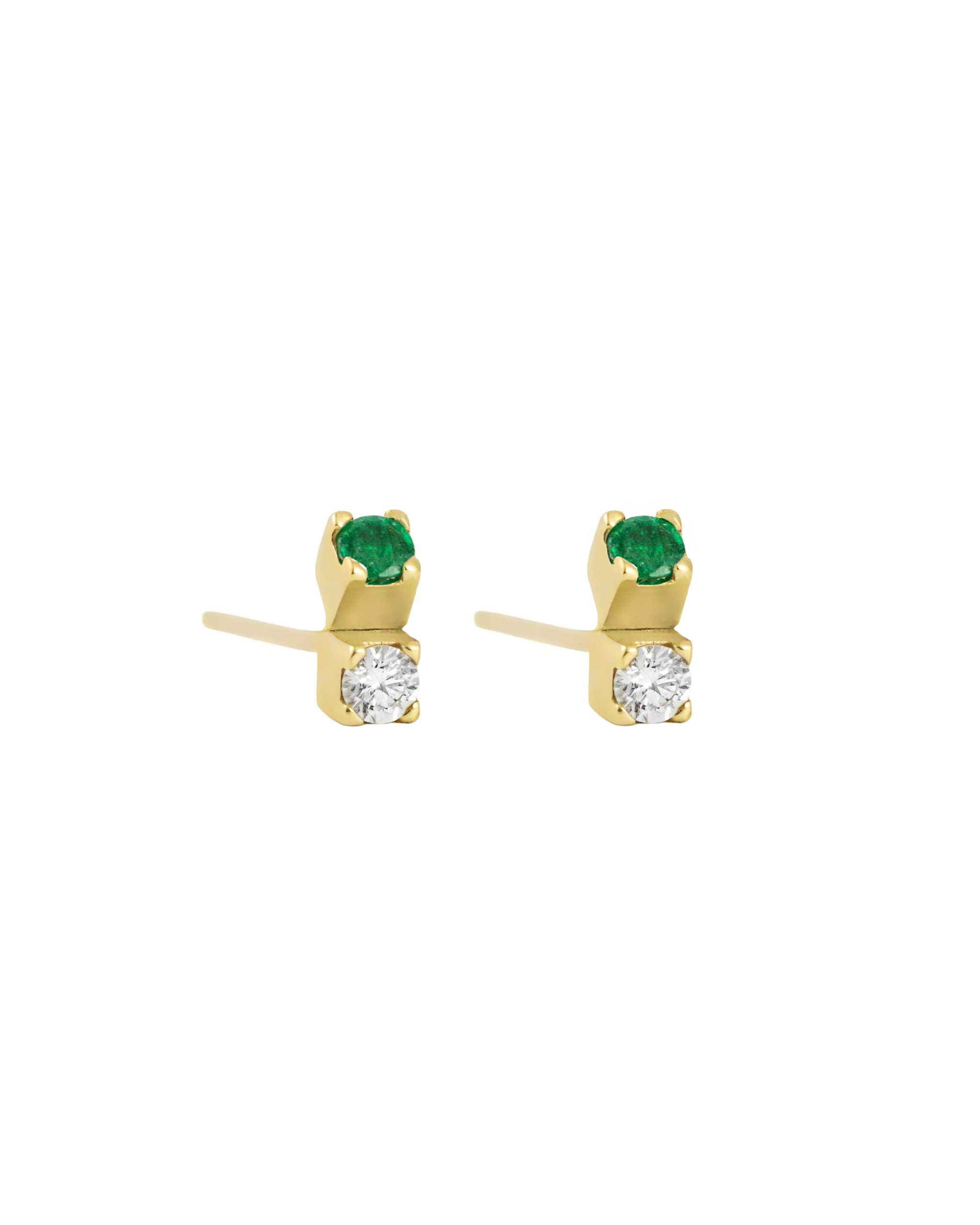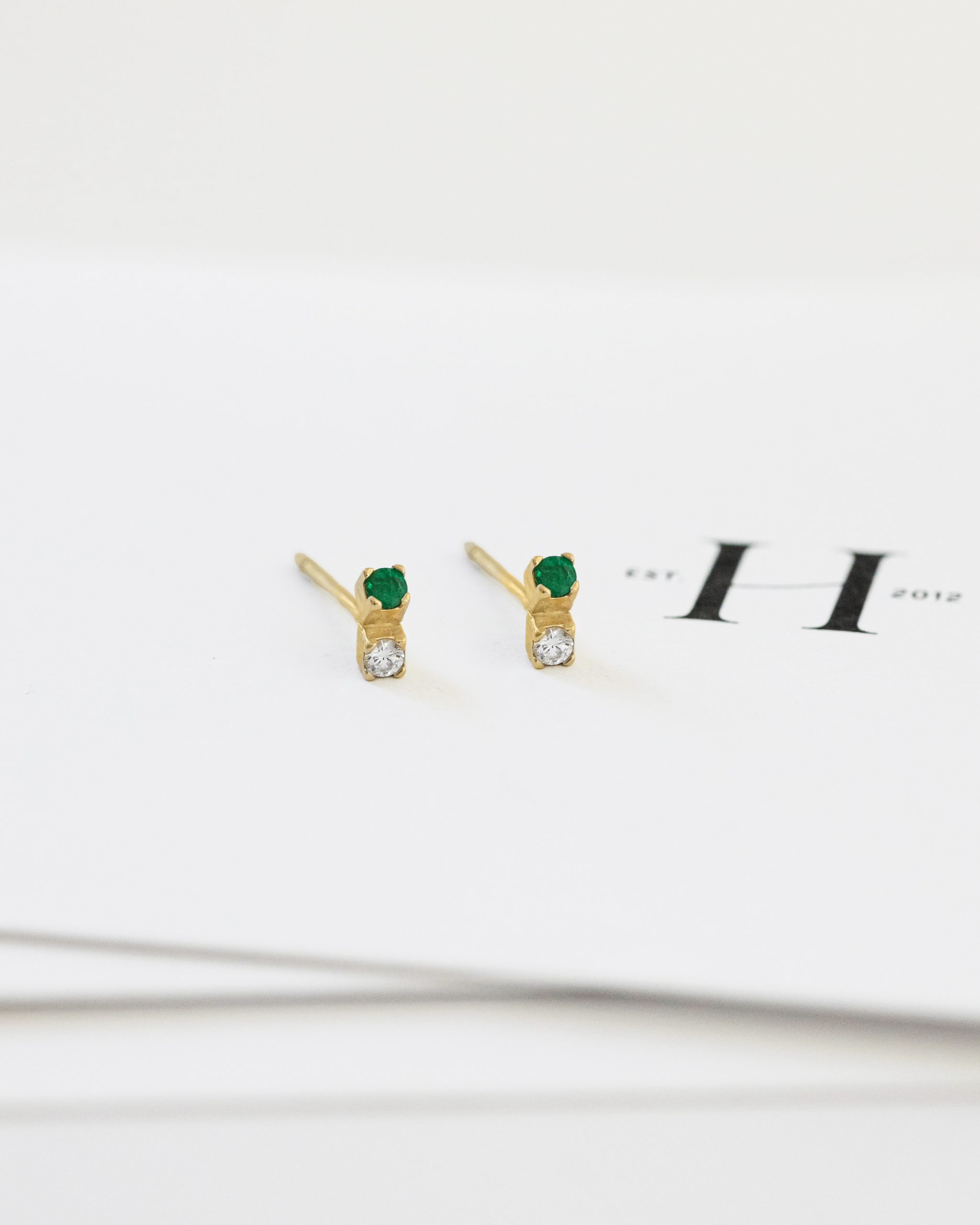 Minimalistyczne i eleganckie kolczyki o geometrycznej formie. Każdy kolczyk tworzą diament i szmaragd oprawione jeden pod drugim, układające się w harmonijną, smukłą linię , pięknie lśniąc na uchu.