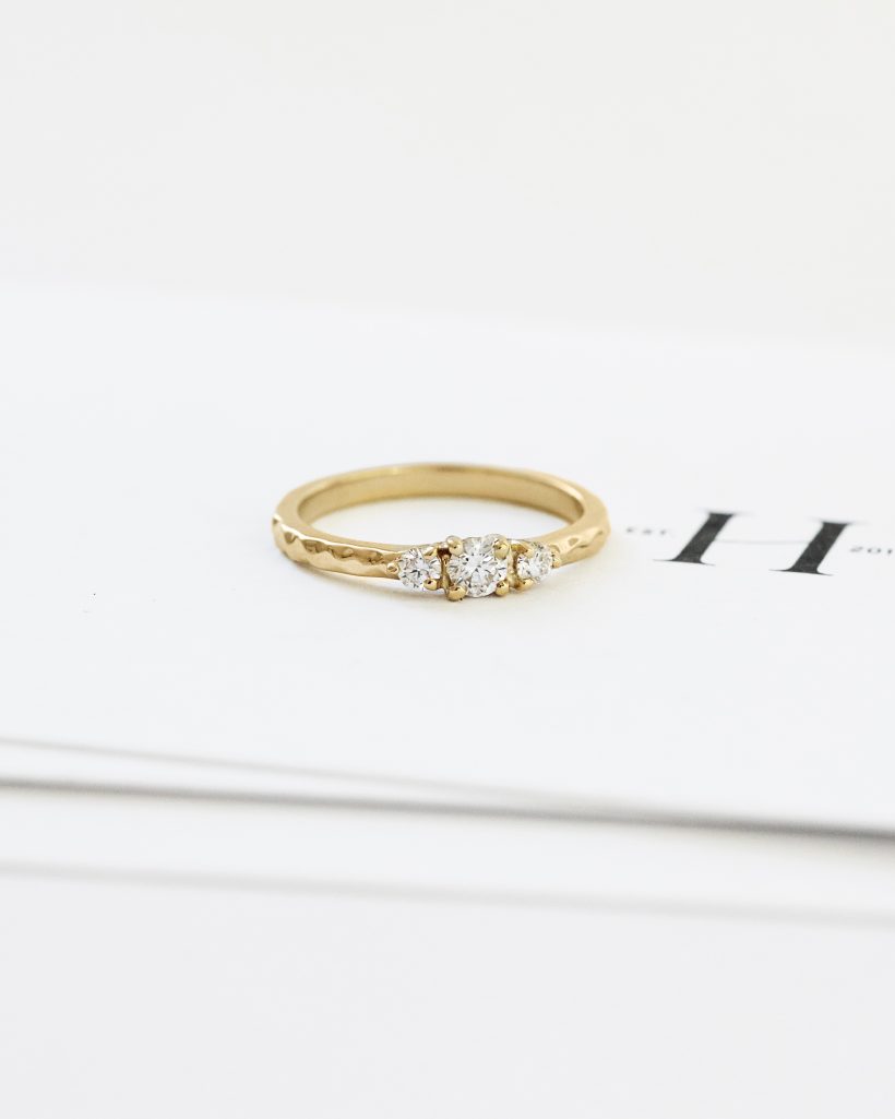 Minimalistyczny pierścionek inspirowany skalną fakturą. Powierzchnia obrączki została wykończona nieregularnymi rzeźbieniami, a następnie misternie wypolerowana. Uzupełnieniem całości są zakute w linii obrączki trzy naturalne diamenty. Pierścionek do wyboru w dwóch wersjach - z diamentami o łącznej masie 0,17 ct oraz z diamentami o łącznej masie 0,3 ct.