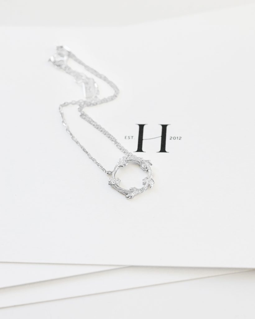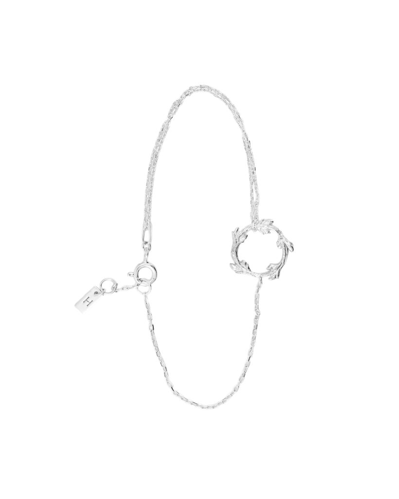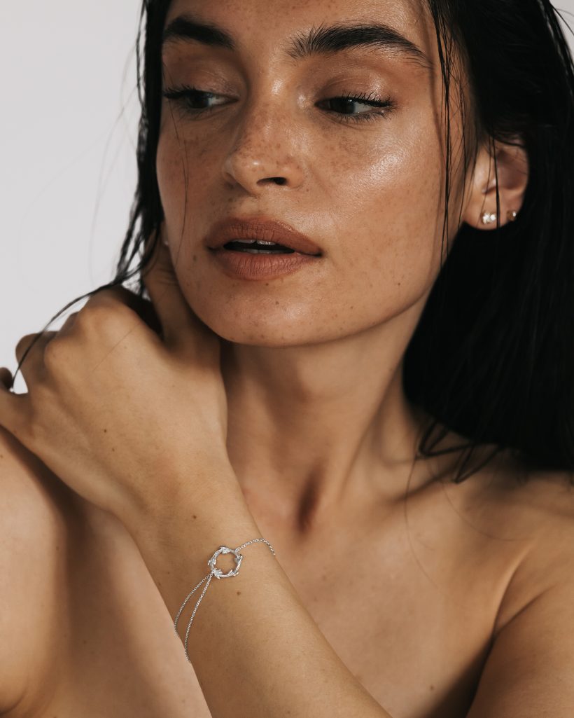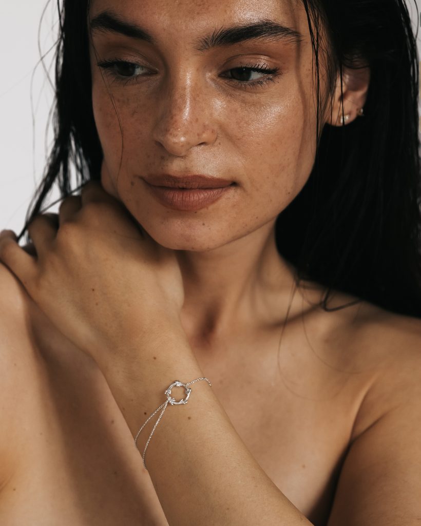 Delikatna bransoletka w formie okrągłego wianka, inspirowanego gałązką ozdobioną młodymi pączkami, zachwyca harmonijnym, organicznym kształtem. Ręcznie rzeźbiona faktura pięknie odbija światło a delikatnie rozmieszczone na obwodzie pączki podkreślają wyjątkowy charakter, nadając całości lekkości i naturalnej elegancji. Całość została upięta niesymetrycznie łańcuszkami, które dodają bransoletce lekkości oraz subtelnego ruchu.