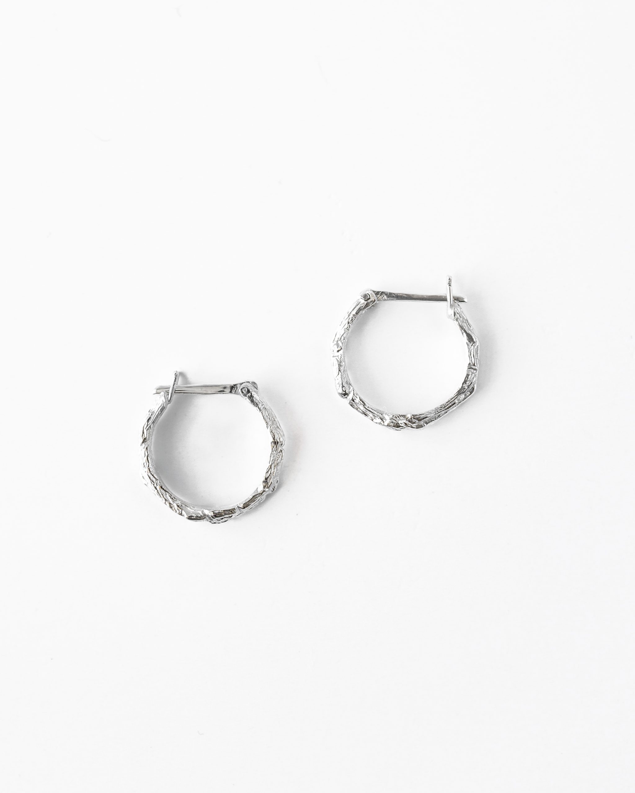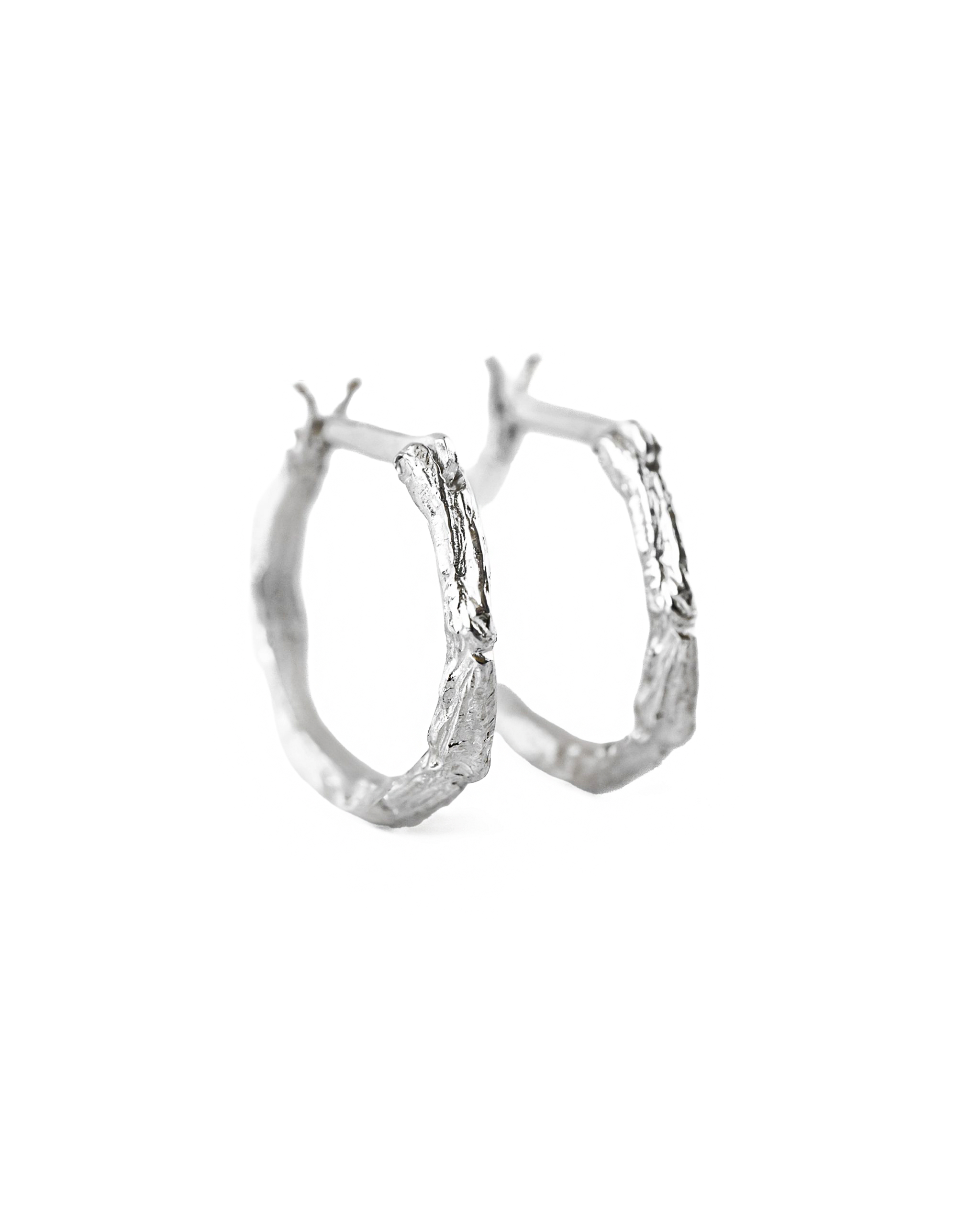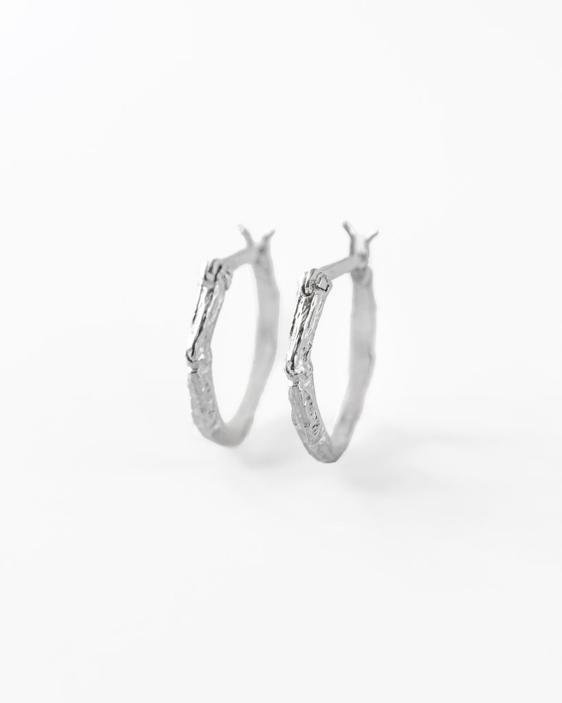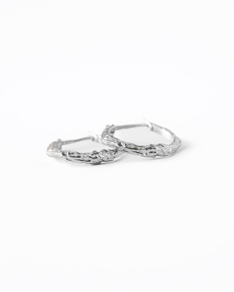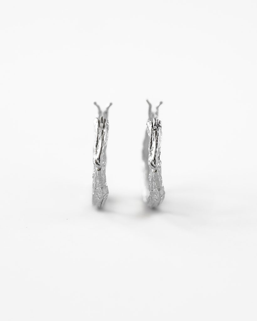 Delikatne a zarazem efektowne kolczyki zdobione motywem gałązki. Ręcznie rzeźbione formy tworzą subtelną fakturę a naturalne krzywizny oddają jej piękno. Powierzchnia została misternie wypolerowana podkreślając rzeźbienia i chłodny odcień srebra.