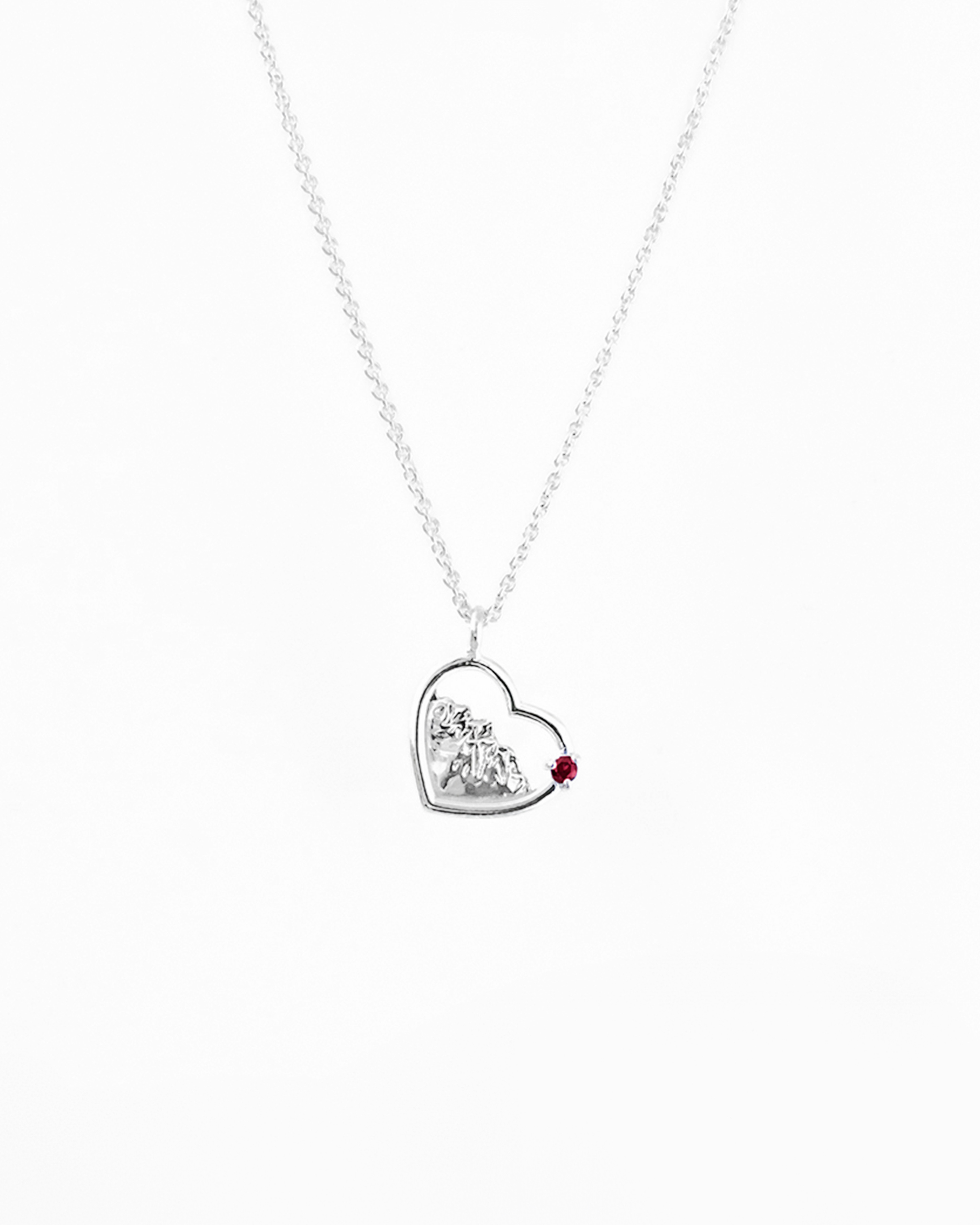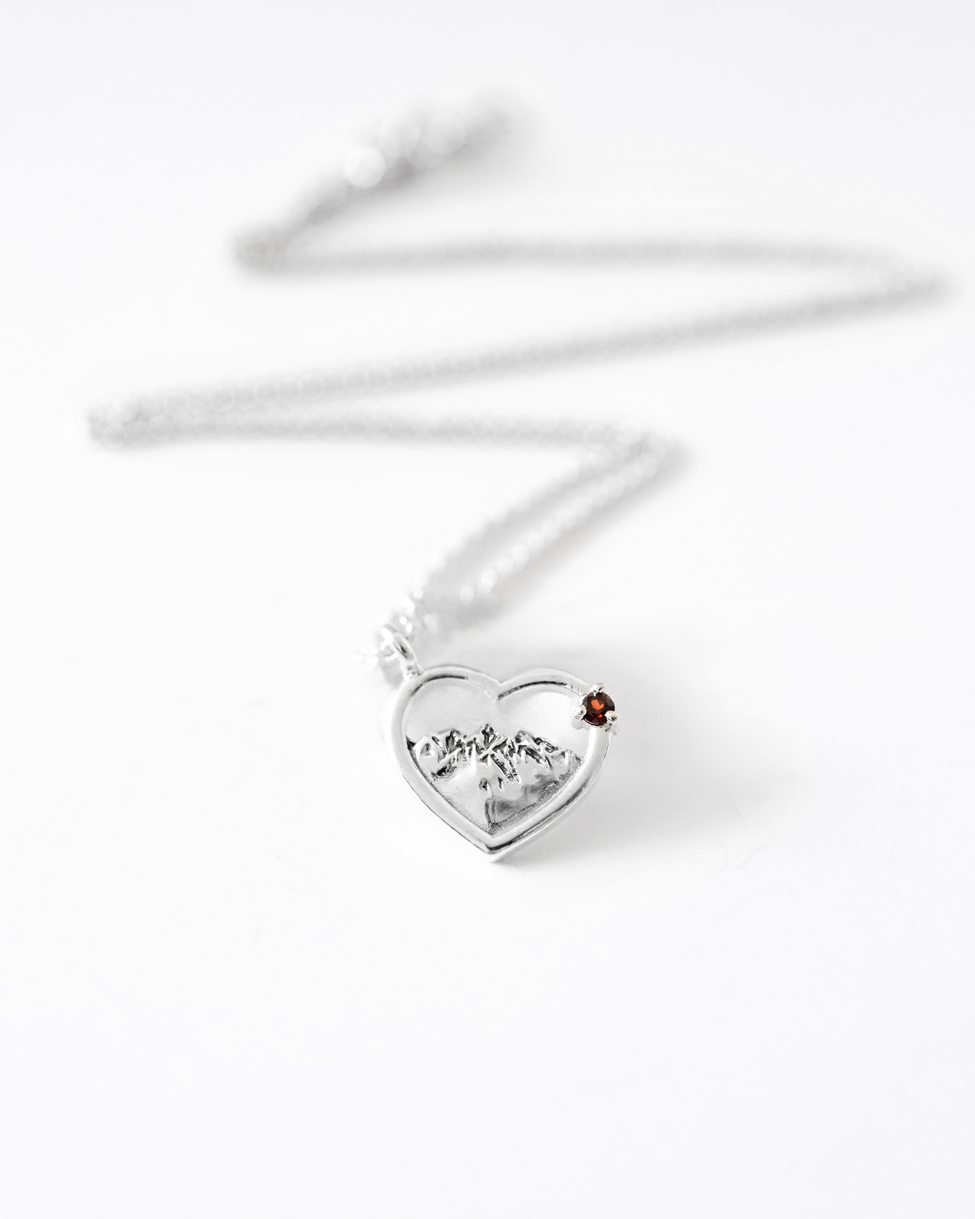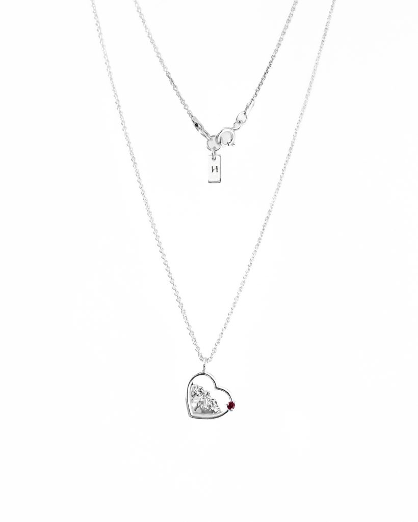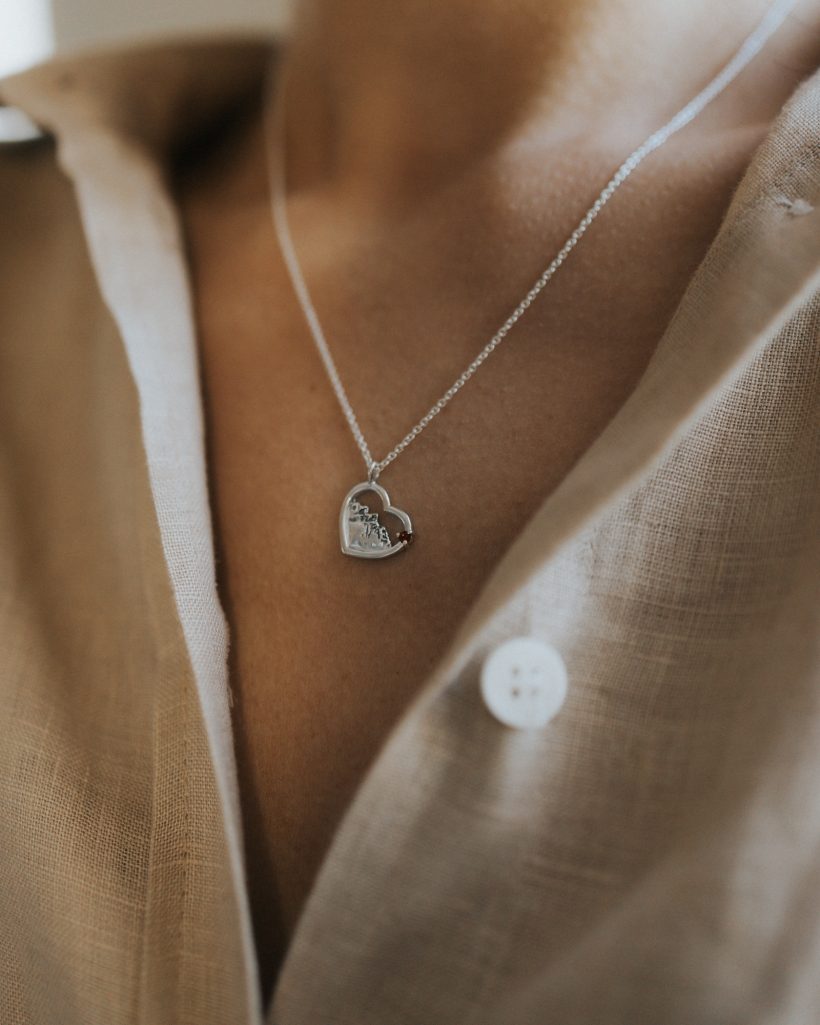Delikatny naszyjnik, w którym zamknęliśmy magię gór. Misternie wyrzeźbiony motyw górskiego krajobrazu został zamknięty w kształcie serca. Zawieszka została zaoksydowana oraz wypolerowana na wysoki połysk, dla podkreślenia szczegółów i wypukłości. Zwieńczeniem jest ręcznie zakuty kamień w oprawie serca.