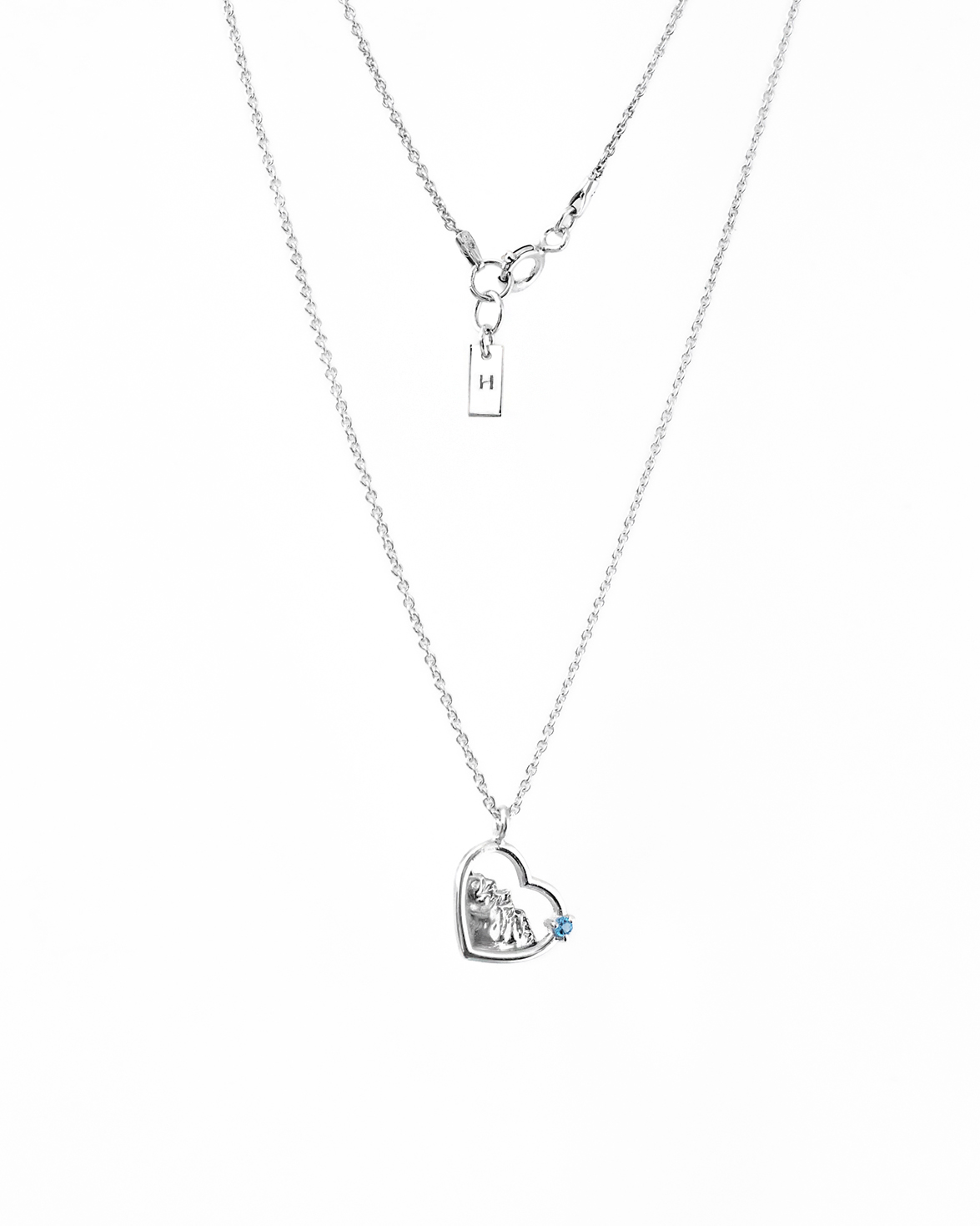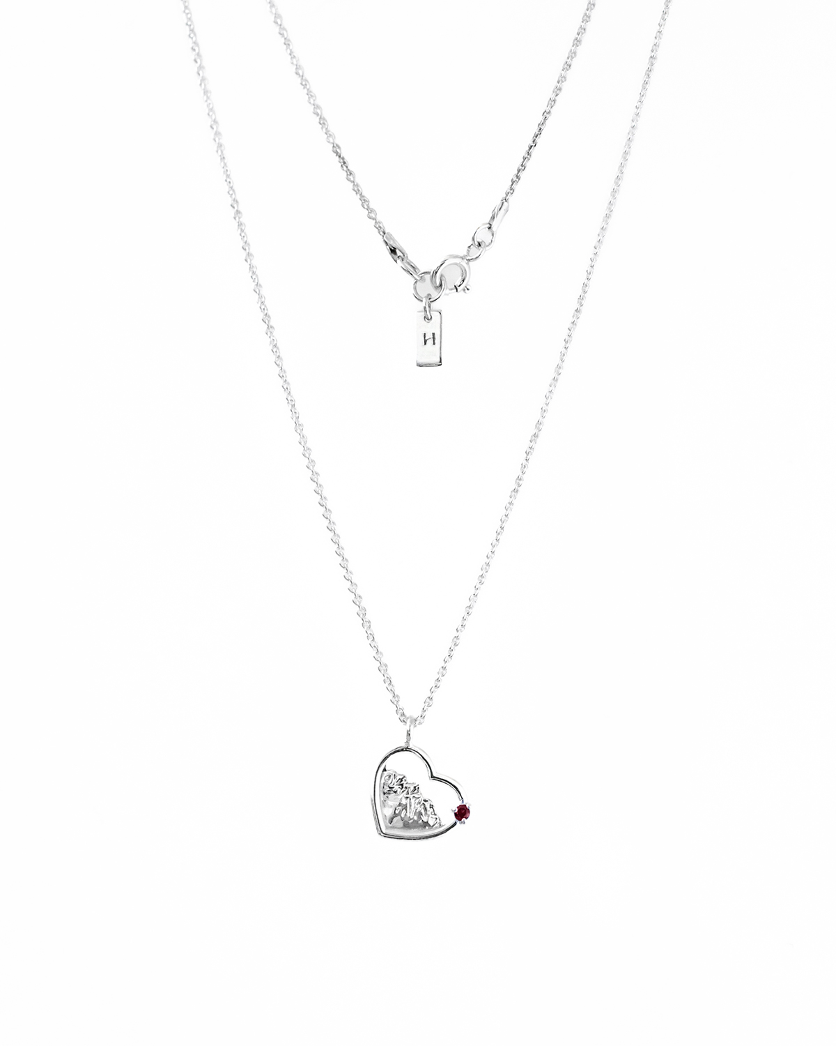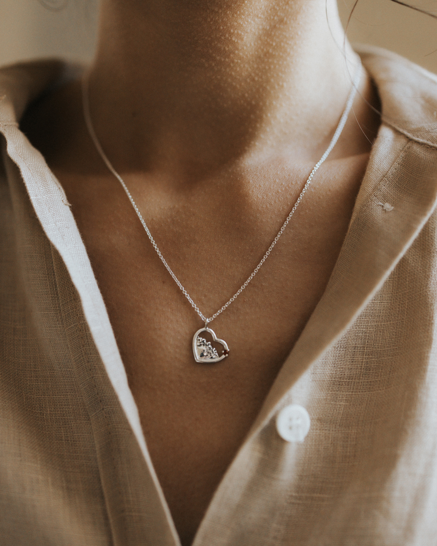 Delikatny naszyjnik, w którym zamknęliśmy magię gór. Misternie wyrzeźbiony motyw górskiego krajobrazu został zamknięty w kształcie serca. Zawieszka została zaoksydowana oraz wypolerowana na wysoki połysk, dla podkreślenia szczegółów i wypukłości. Zwieńczeniem jest ręcznie zakuty kamień w oprawie serca.