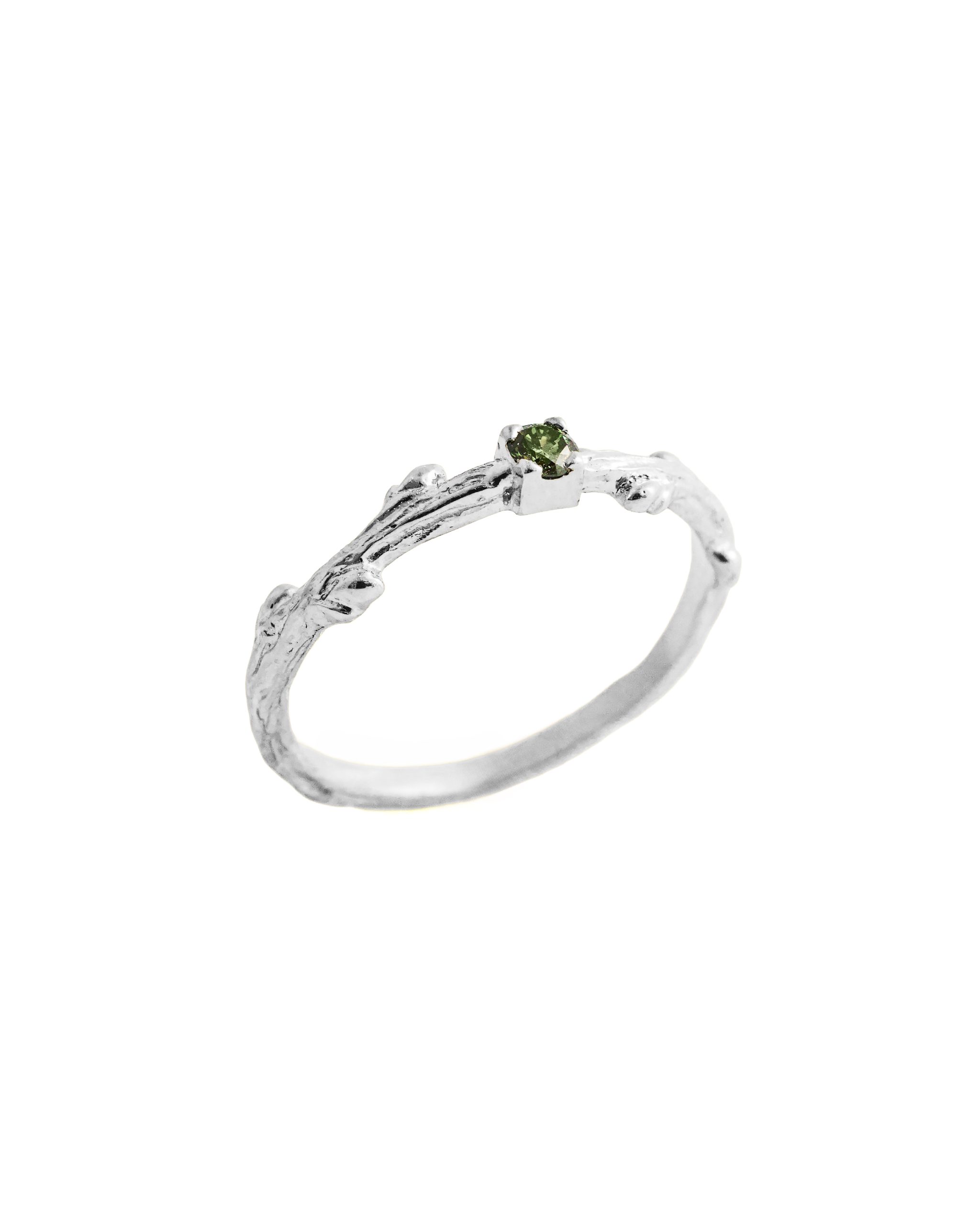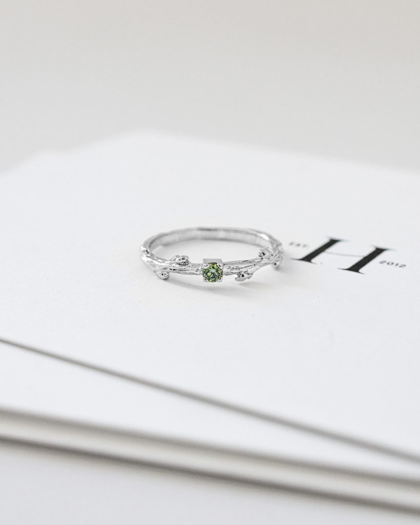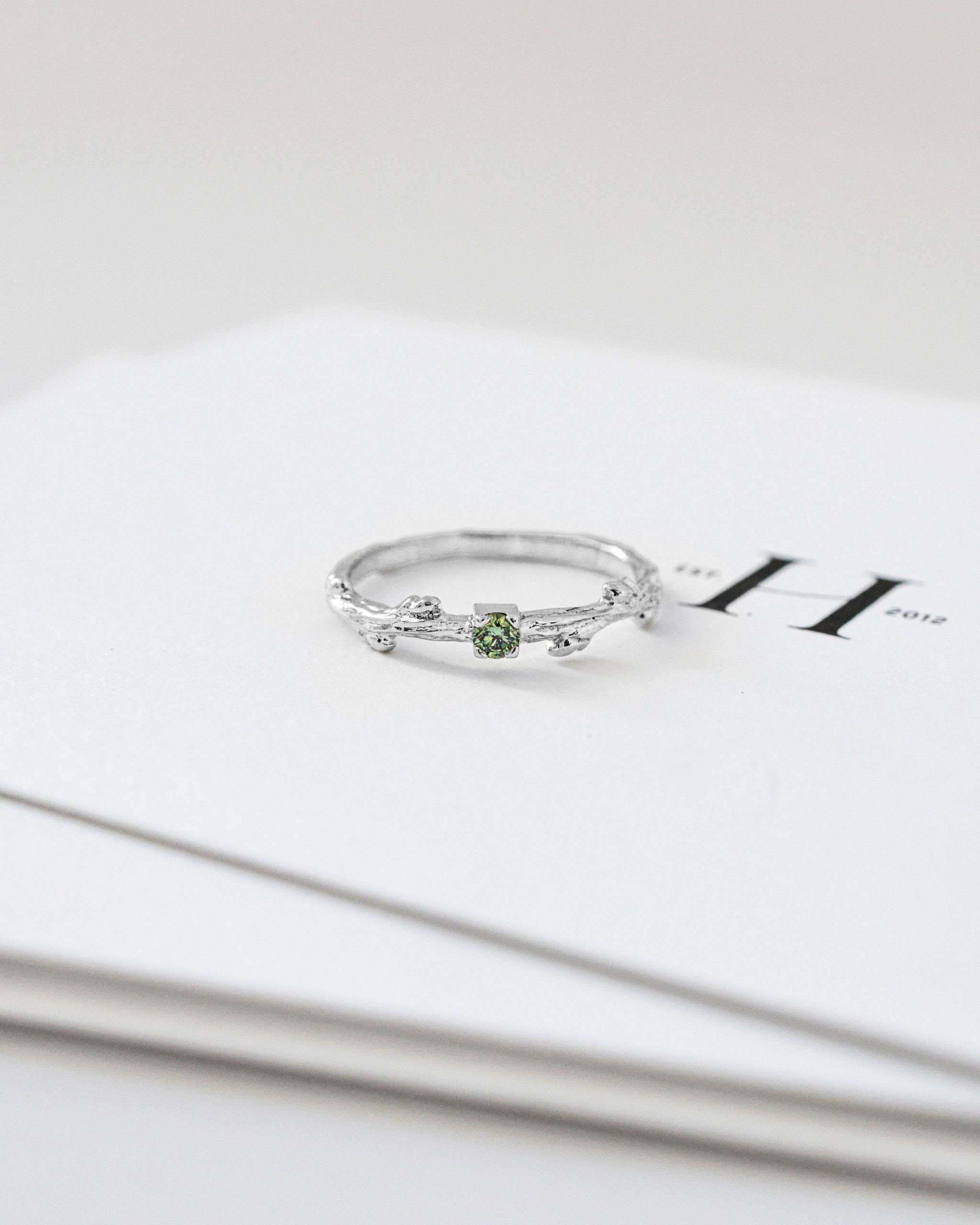 Delikatny pierścionek zdobiony gałązką z młodymi pączkami zachwyca subtelną, organiczną linią. Ręcznie wyrzeźbiona faktura pięknie odbija światło a delikatne pączki rozmieszczone wzdłuż gałązki nadają całości świeżości oraz eleganckiego charakteru. Zwieńczeniem projektu jest diament laboratoryjny o głębokim odcieniu butelkowej zieleni, oprawiony w centralnej części.