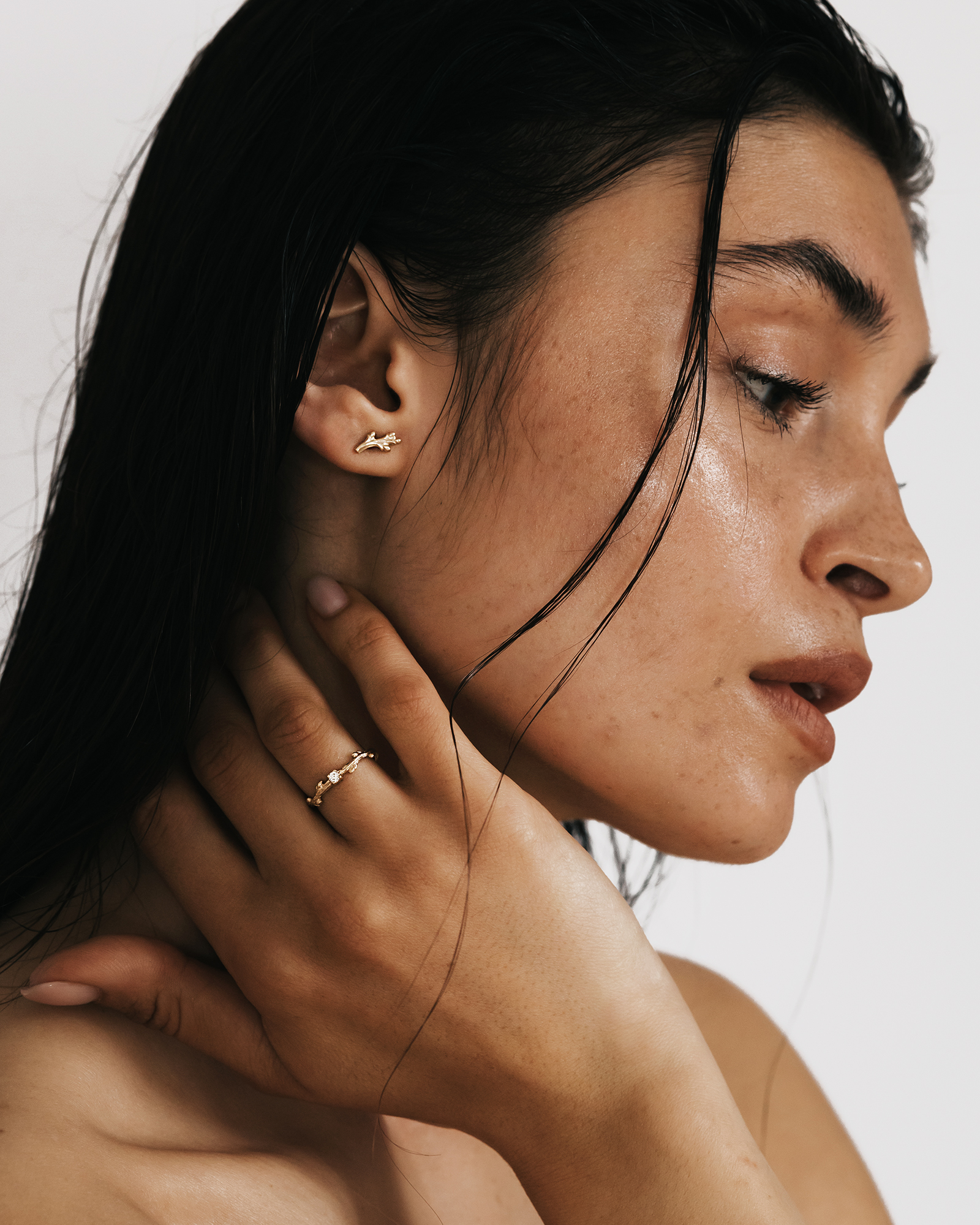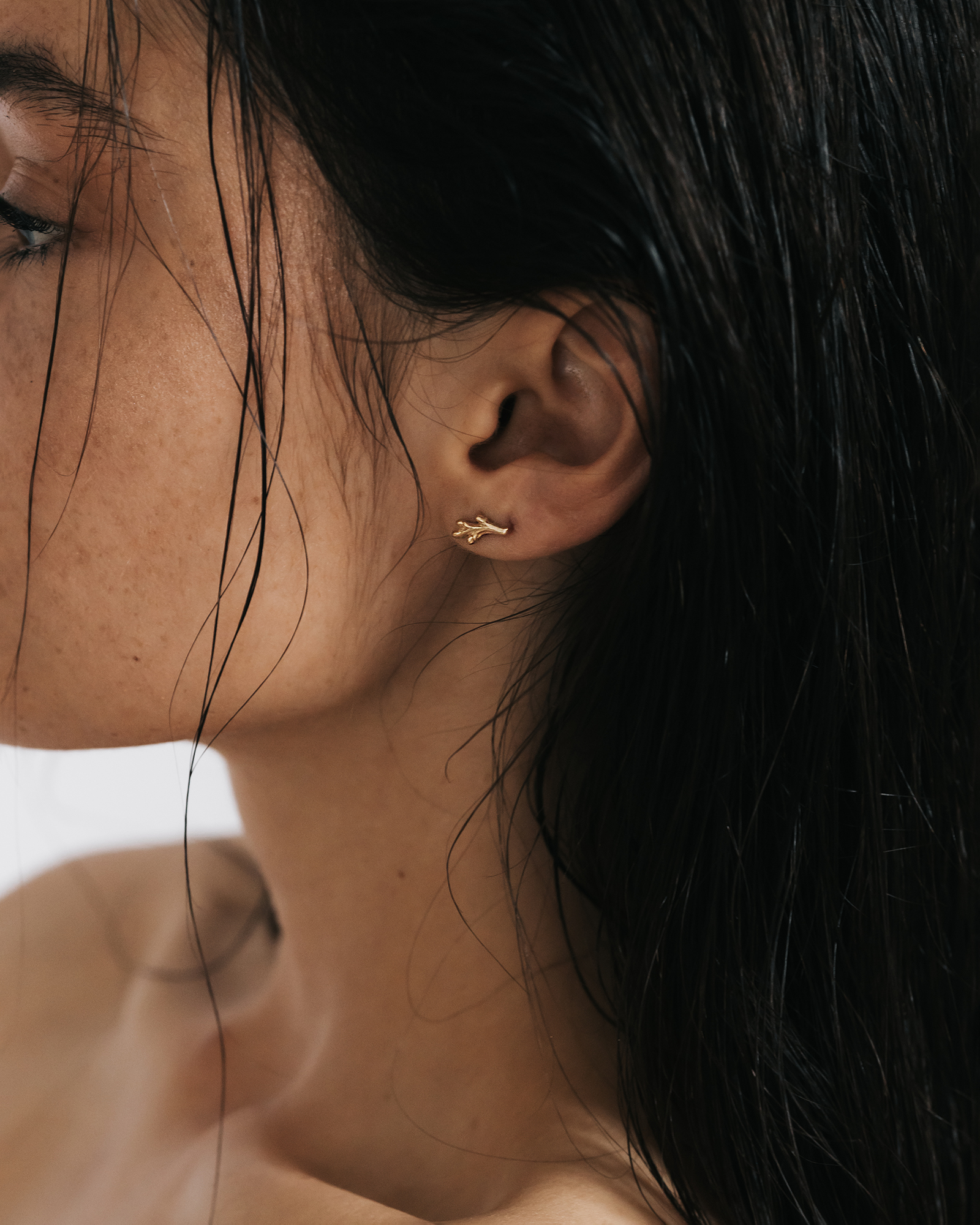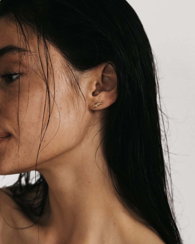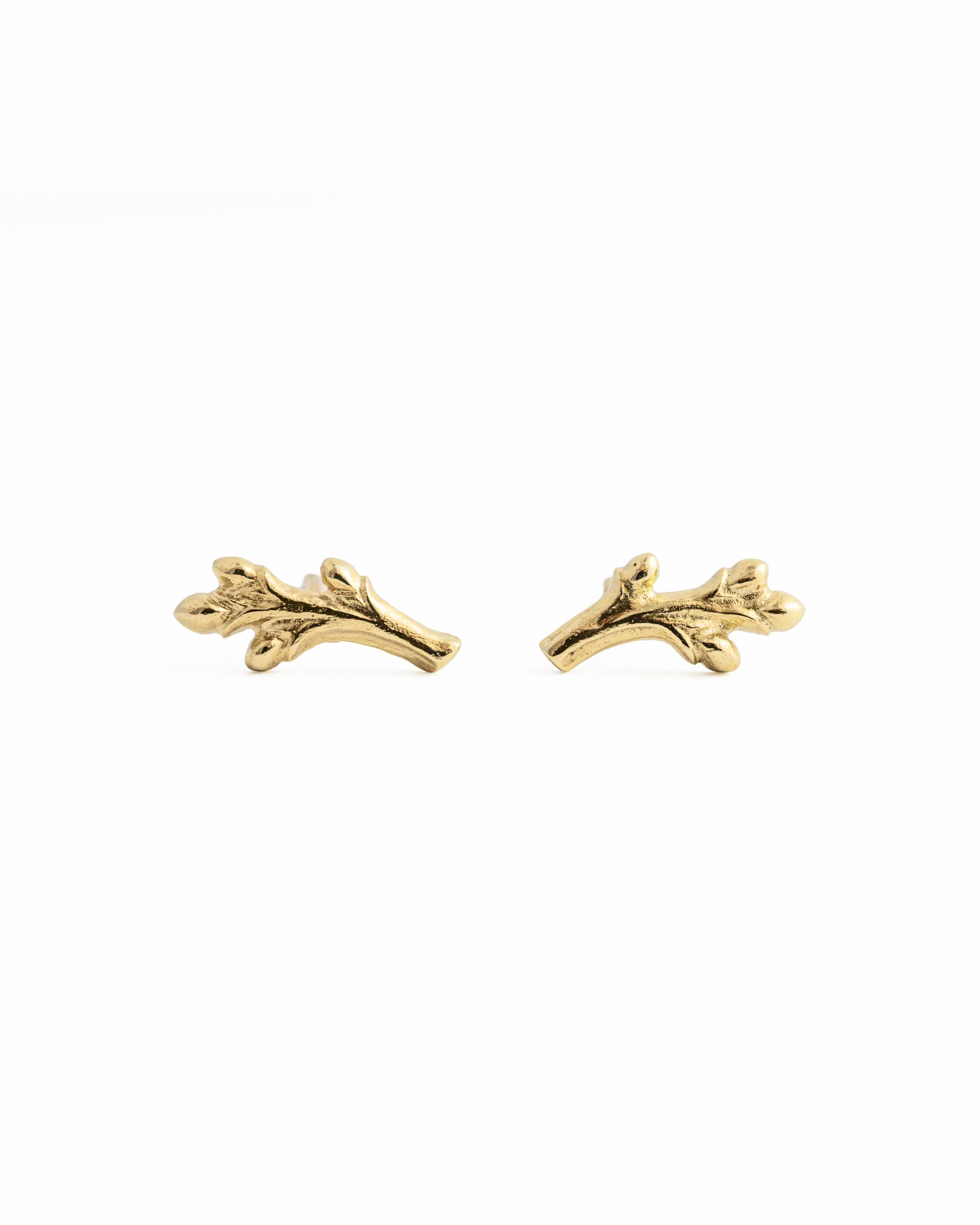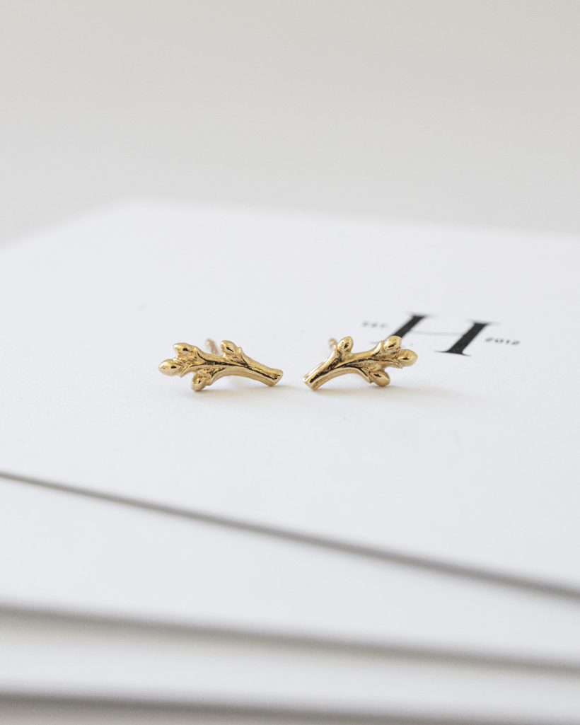 Delikatne kolczyki inspirowane gałązką ozdobioną młodymi pączkami zachwycają subtelną formą i naturalnym wdziękiem. Smukłe, ręcznie rzeźbione linie złota tworzą lekką i harmonijną kompozycję, delikatnie układając się na uchu. Delikatne pączki rozmieszczone wzdłuż gałązki nadają całości świeżości oraz eleganckiego charakteru. Całość została wypolerowana dzięki czemu organiczna faktura pięknie odbija światło.