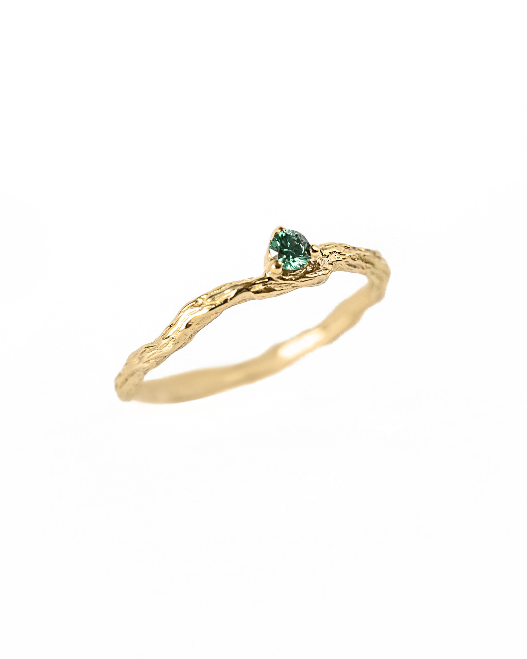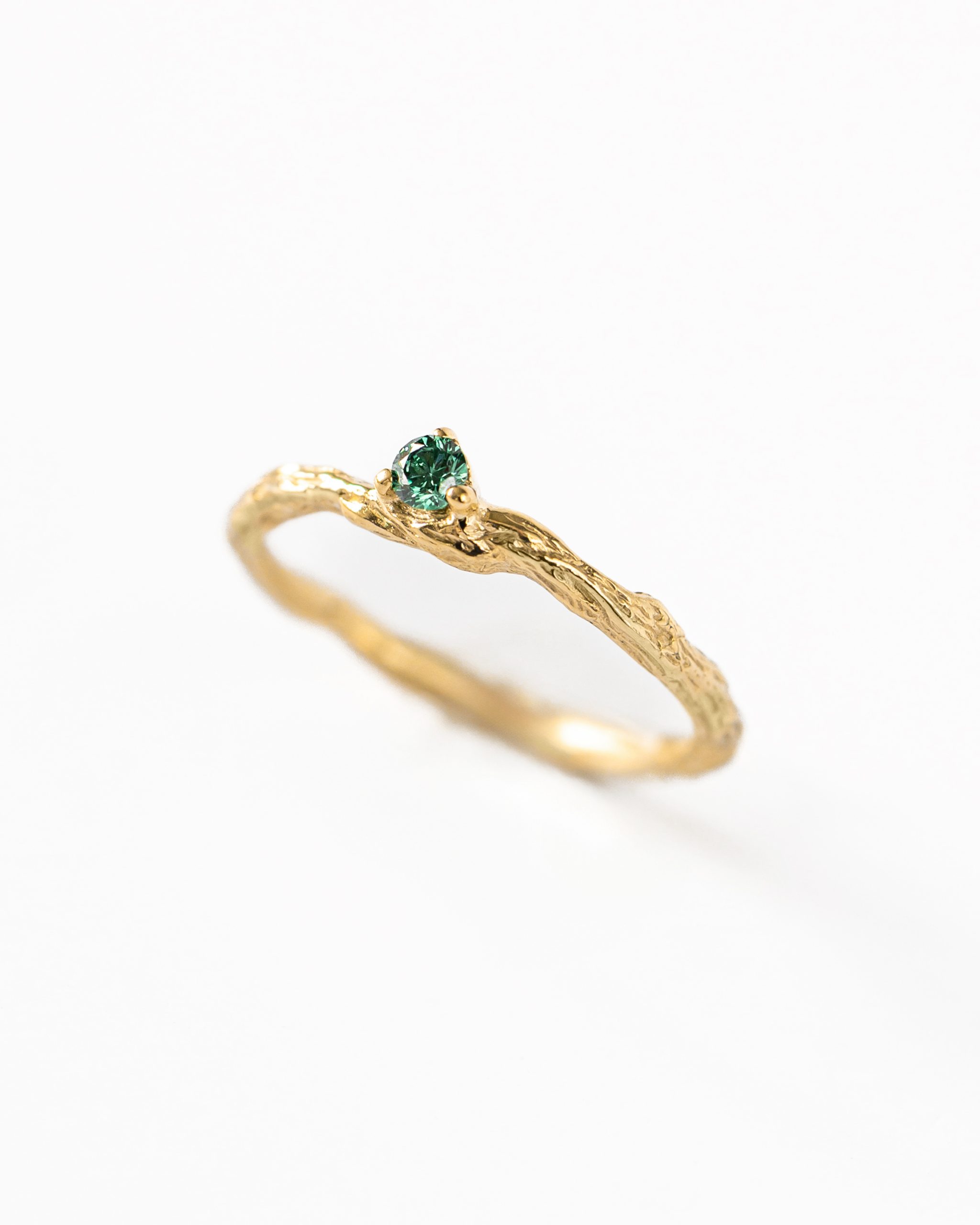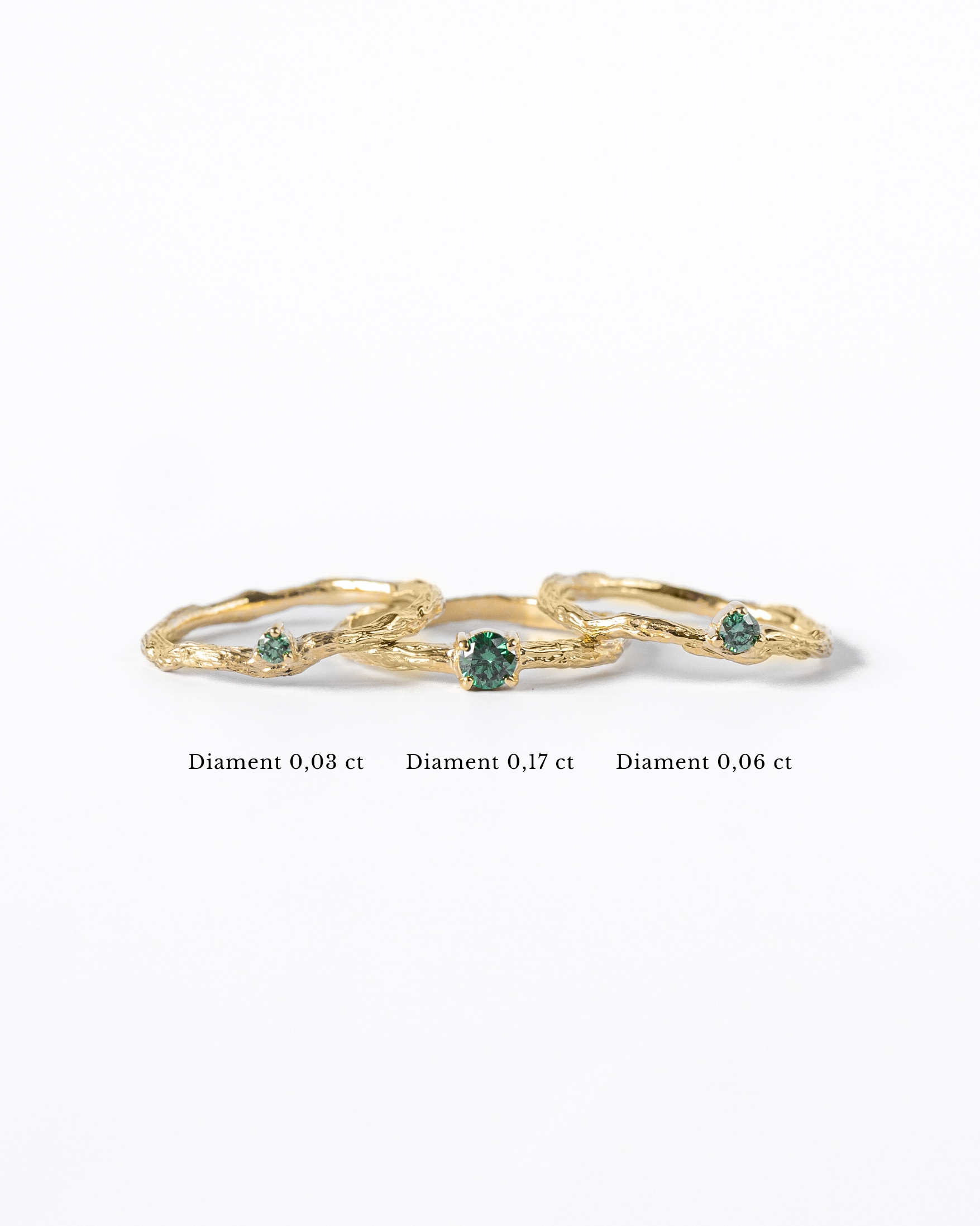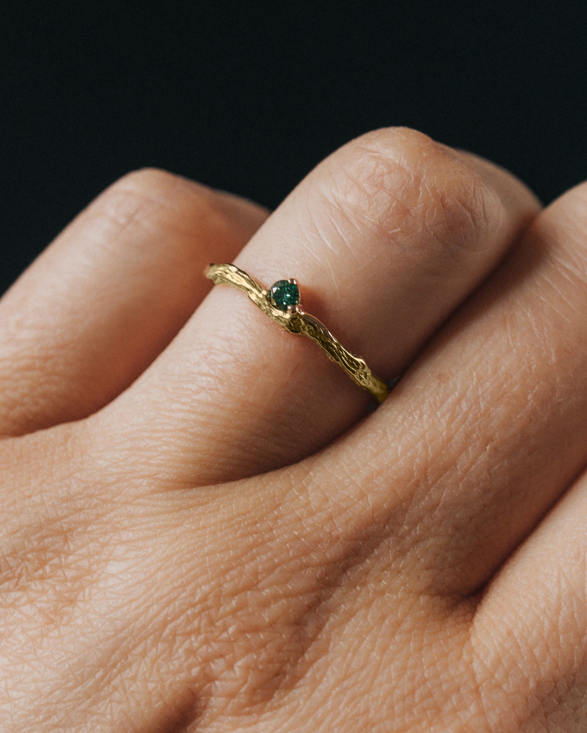 Efektowny pierścionek inspirowany formą gałęzi. Każda linia została misternie wyrzeźbiona, tworząc subtelną fakturę i oddając naturalne piękno krzywizn. Zwieńczeniem projektu jest diament Lab Grown o głębokim odcieniu butelkowej zieleni. Powierzchnia została wypolerowana podkreślając fakturę wzoru i ciepły odcień złota.