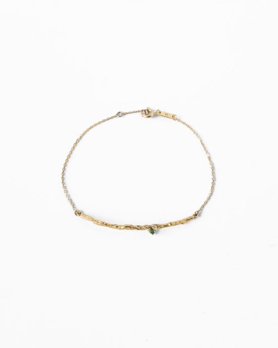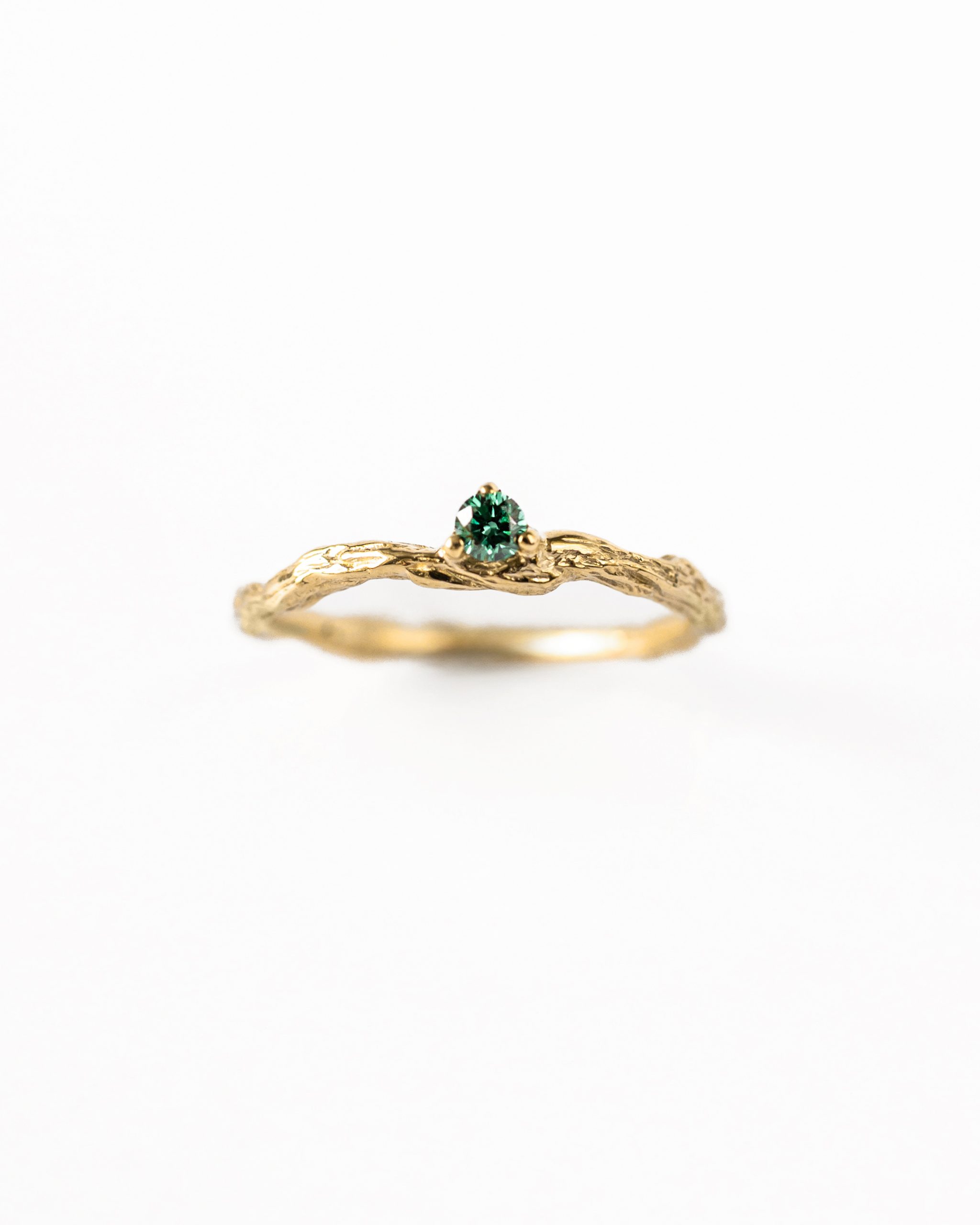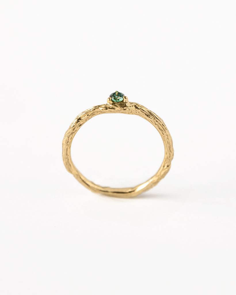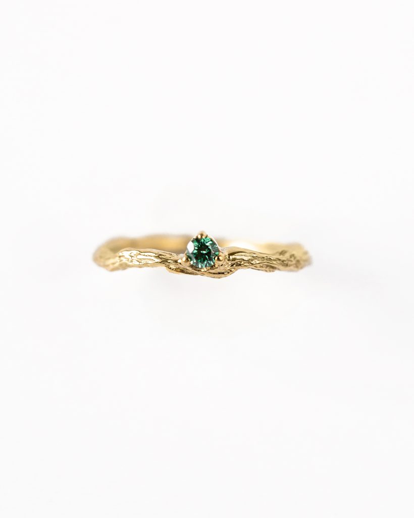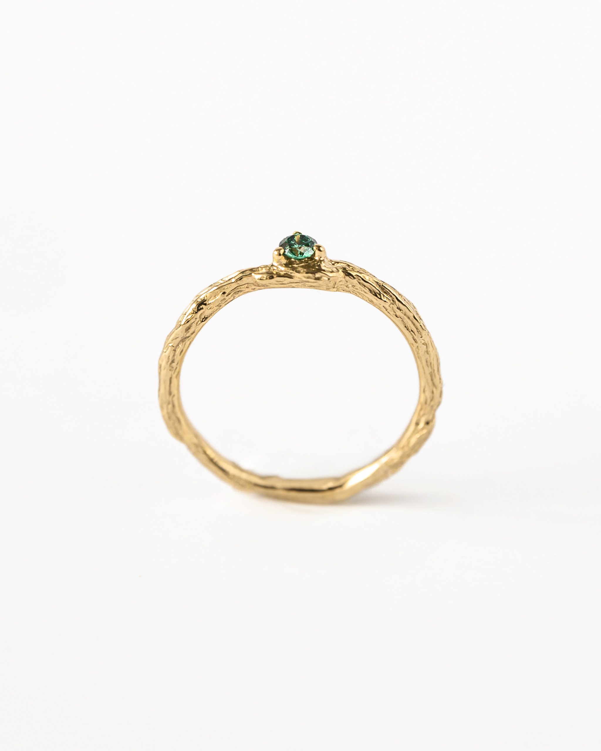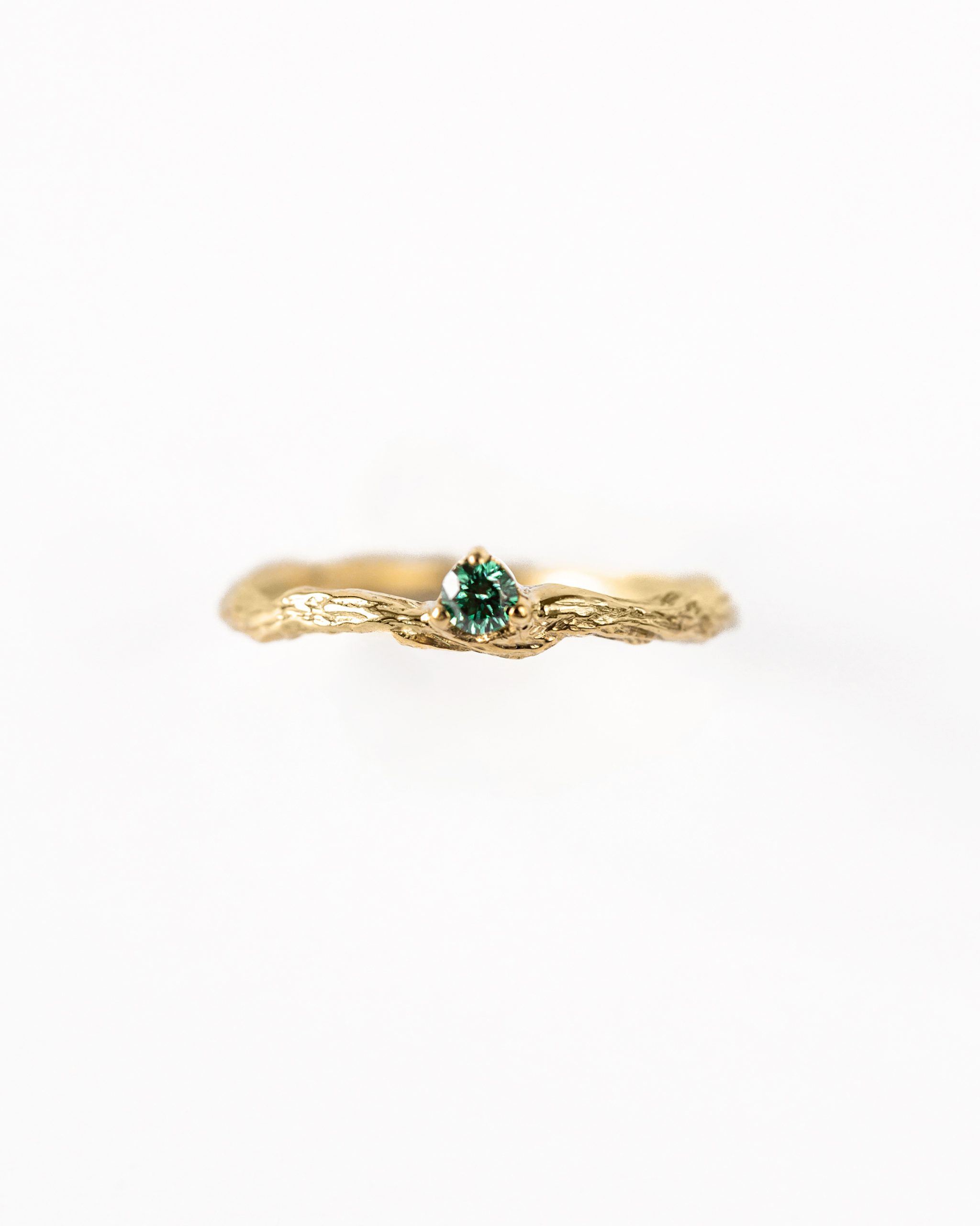 Efektowny pierścionek inspirowany formą gałęzi. Każda linia została misternie wyrzeźbiona, tworząc subtelną fakturę i oddając naturalne piękno krzywizn. Zwieńczeniem projektu jest diament Lab Grown o głębokim odcieniu butelkowej zieleni. Powierzchnia została wypolerowana podkreślając fakturę wzoru i ciepły odcień złota.