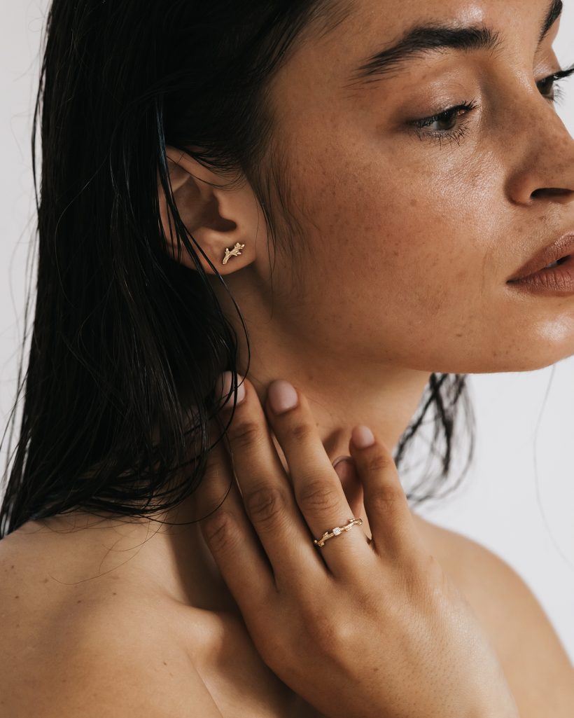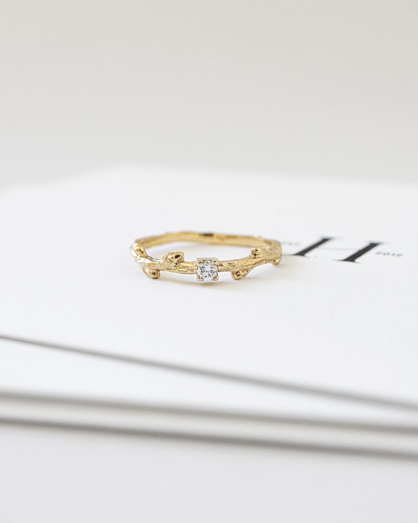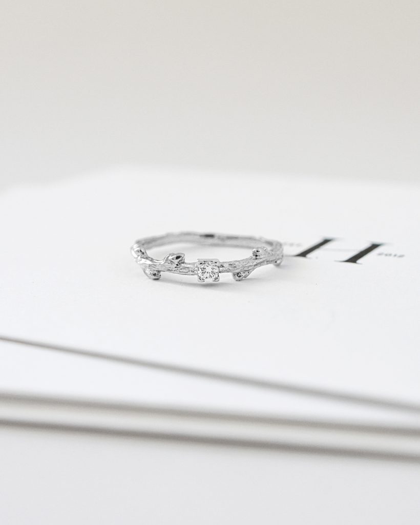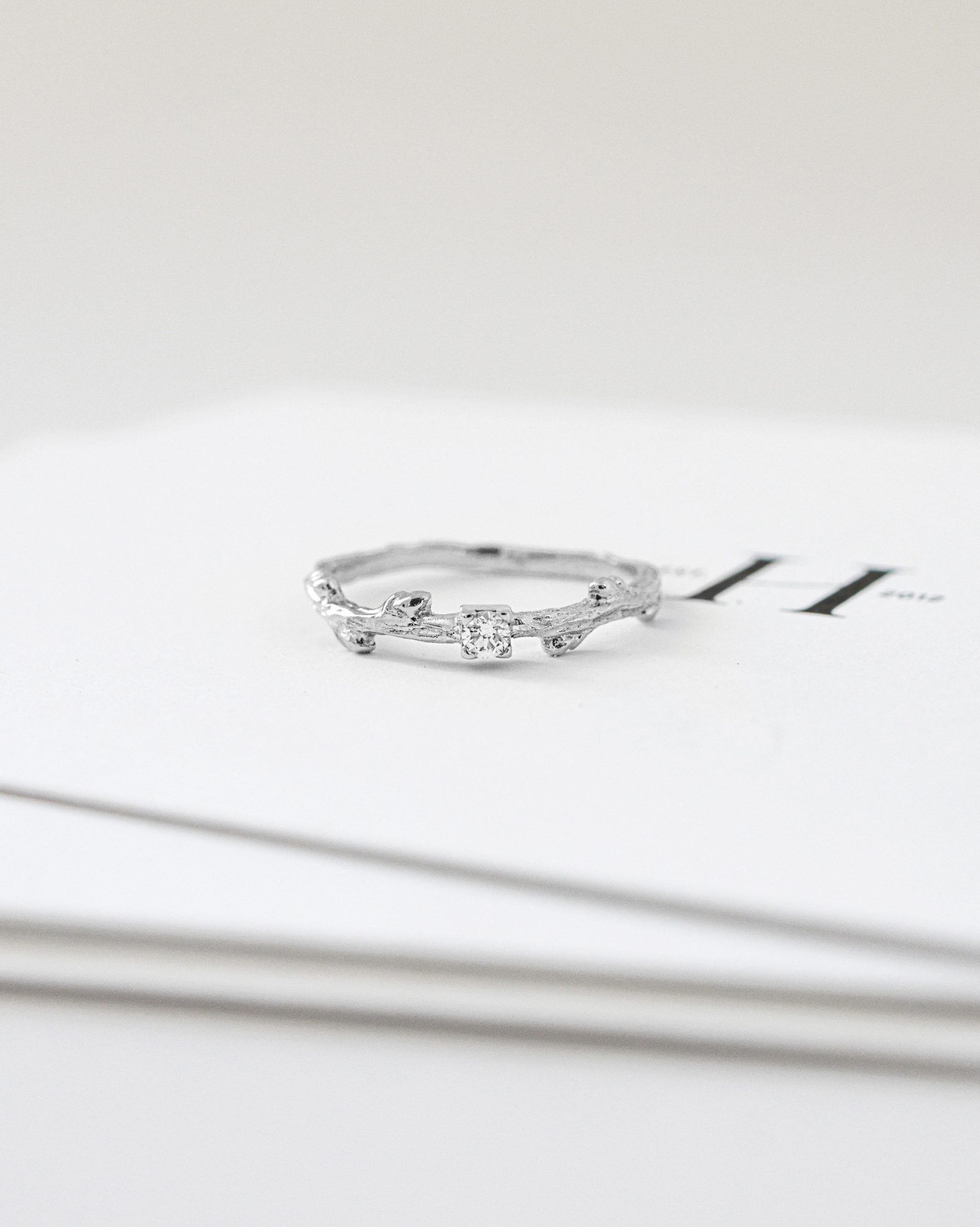 Delikatny pierścionek zdobiony gałązką z młodymi pączkami zachwyca subtelną, organiczną linią. Ręcznie wyrzeźbiona faktura pięknie odbija światło a delikatne pączki rozmieszczone wzdłuż gałązki nadają całości świeżości oraz eleganckiego charakteru. Zwieńczeniem projektu jest naturalny diament, oprawiony w centralnej części.